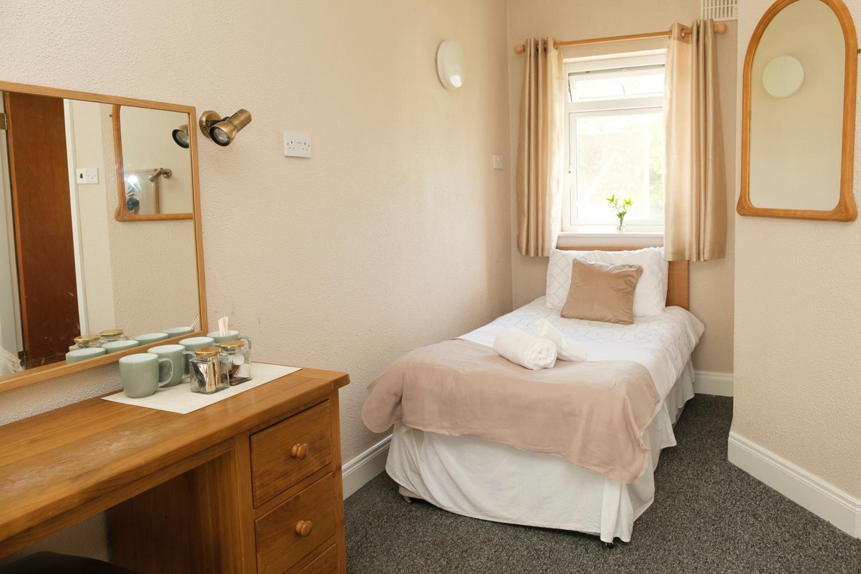 19.50 for fish & chips! If you seen what I got I've never seen anything so miserable on a plate before no peas no salad I had to ask,! Fish isnt fresh you'd buy what they offered in tesco yourself. Even more expensive for the steak its the size if your palm & came out raw. They mask the serving of your meal by leaving the basket of chips on your plate! Ridiculous prices for what we got. Forced to sit in an area we didn't want to sit in due to bookings. Sorry did we not pay & book our stay surely that should include a table? We agreed we'd have dinner at 6 soon as we sat down at 5 they were round taking the order we were rushed! Door handle in room cut my husband's hand sharp edge sticking out. Blocked toilet water level raised high in our room. Single bed could only hold a child very squeaky & unsteady. No outside lights at night if you want to walk over to the bar pitch black. No atmosphere whatsoever no craic everyone was whispering. Couldn't even get a sprite with breakfast told bar not open, in other words if you want a sprite with your already paid breakfast you pay for it! This was a very disappointing stay. Never again.