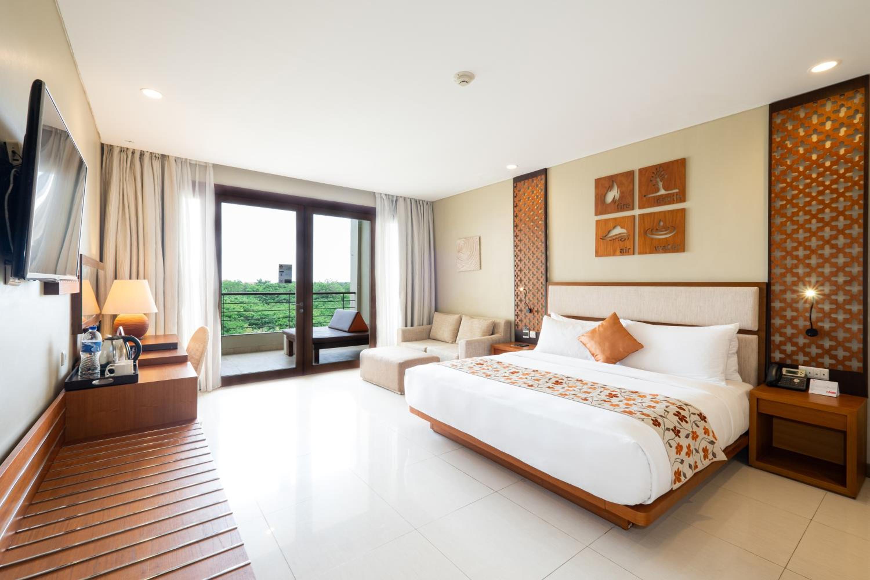 The elegantly decorated rooms at VOUK Hotel and Suites Nusa Dua Bali offer a comfortable retreat with private balconies, air conditioning, and plush bedding. Guests can unwind with entertainment on the 42-inch flat-screen TV, enjoy hot beverages with the electric kettle, and find refreshments in the minibar. The hotel's 24-hour front desk provides services like luggage storage and a safety deposit box, while the on-site gym caters to fitness enthusiasts. Immerse yourself in luxury and convenience at VOUK Hotel and Suites Nusa Dua Bali for an unforgettable experience.