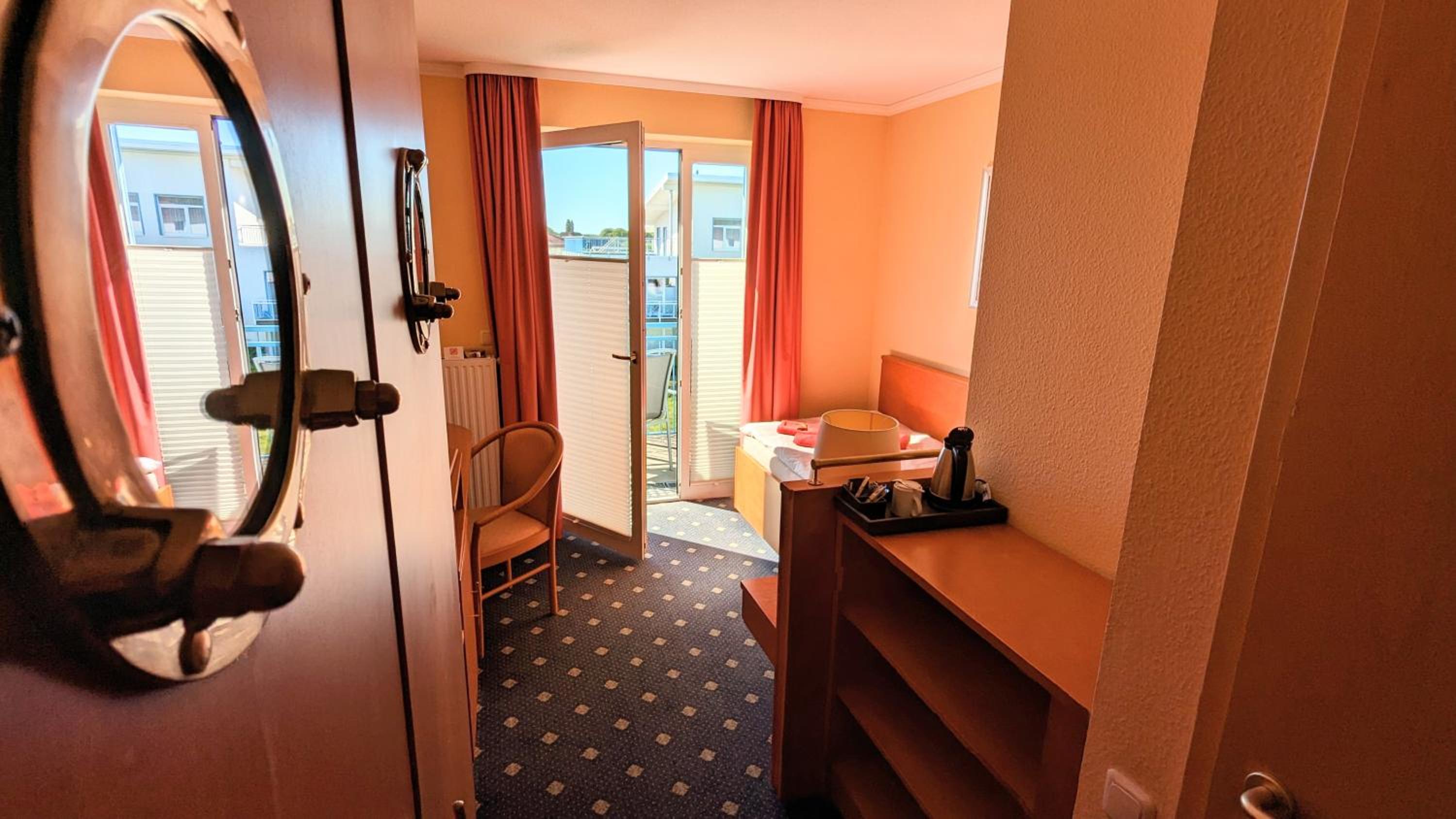 Ein kleines aber sehr feines Zimmer mit allem Notwendigen, was man für 1 Woche Urlaub benötigt. Das Bad war ebenfalls klein, aber optimal genutzt. Die Lage des Hotels ist super, 5 Gehminuten zur Seebrücke, 15 Gehminuten zum Bahnhof, 15 Gehminuten zum Achterwasser. Der Wellnessbereich ist sehr schön, insbesondere das Schwimmbad habe ich gern genutzt. Die Sauberkeit hat mir sehr gefallen.