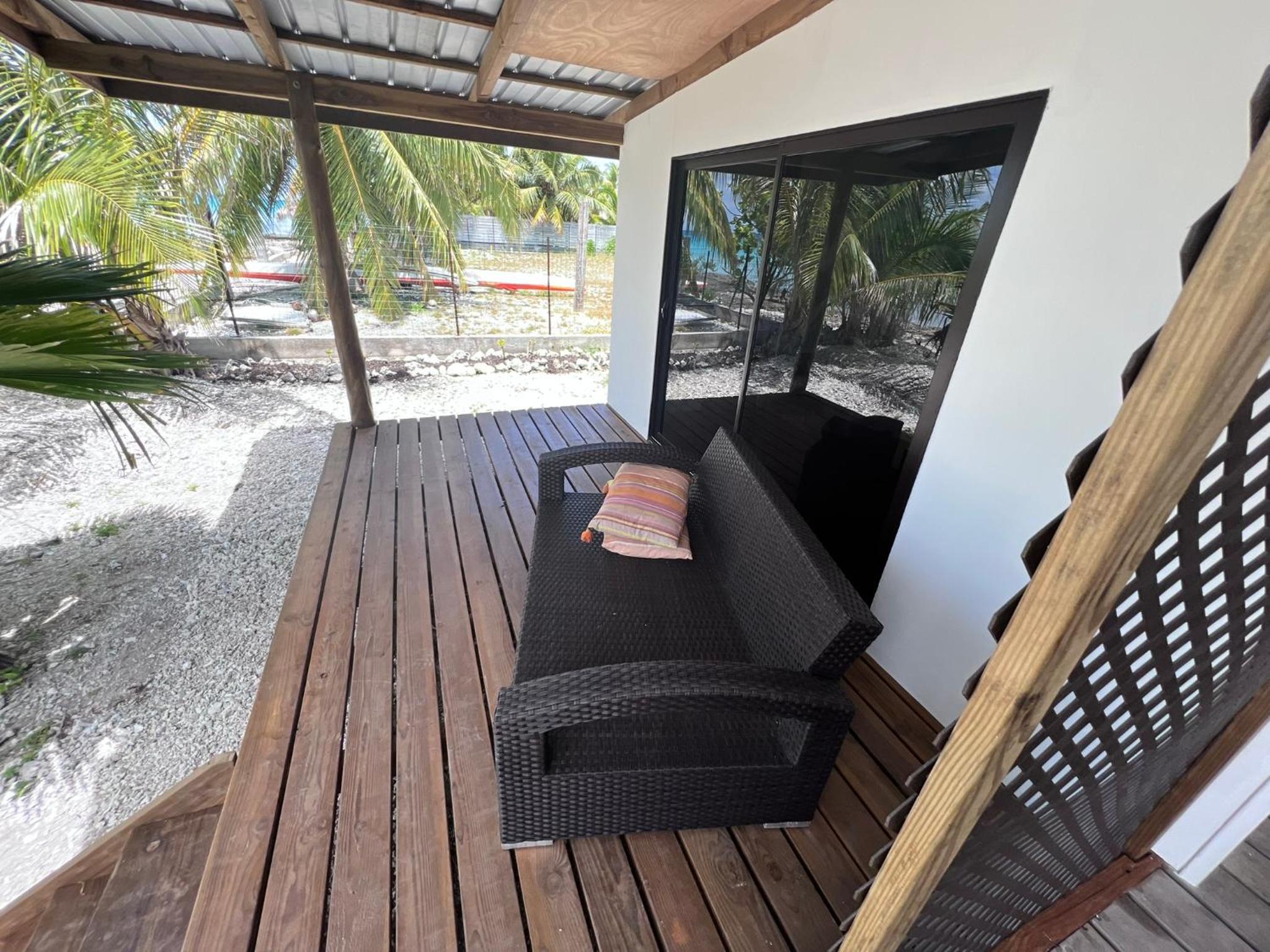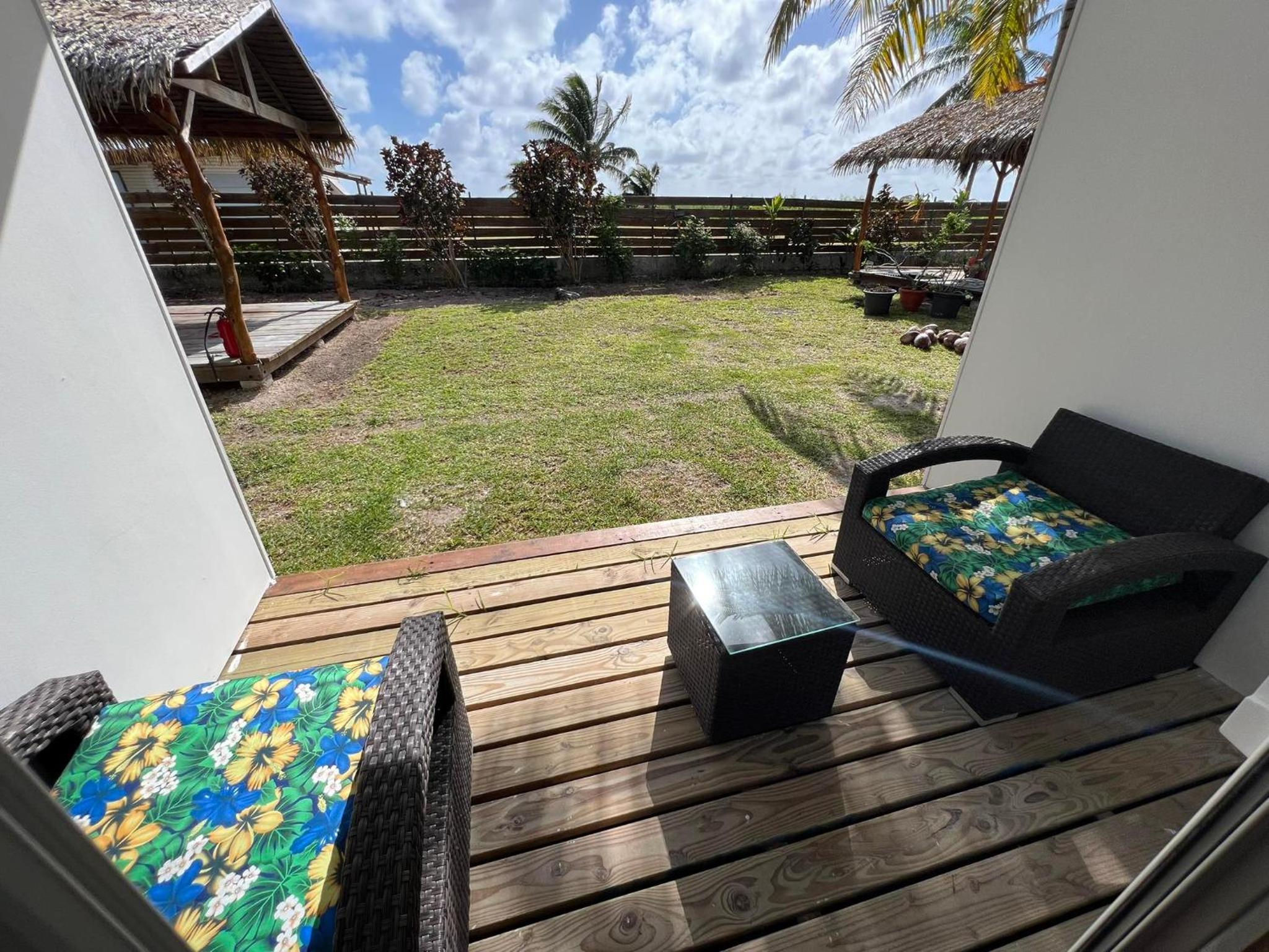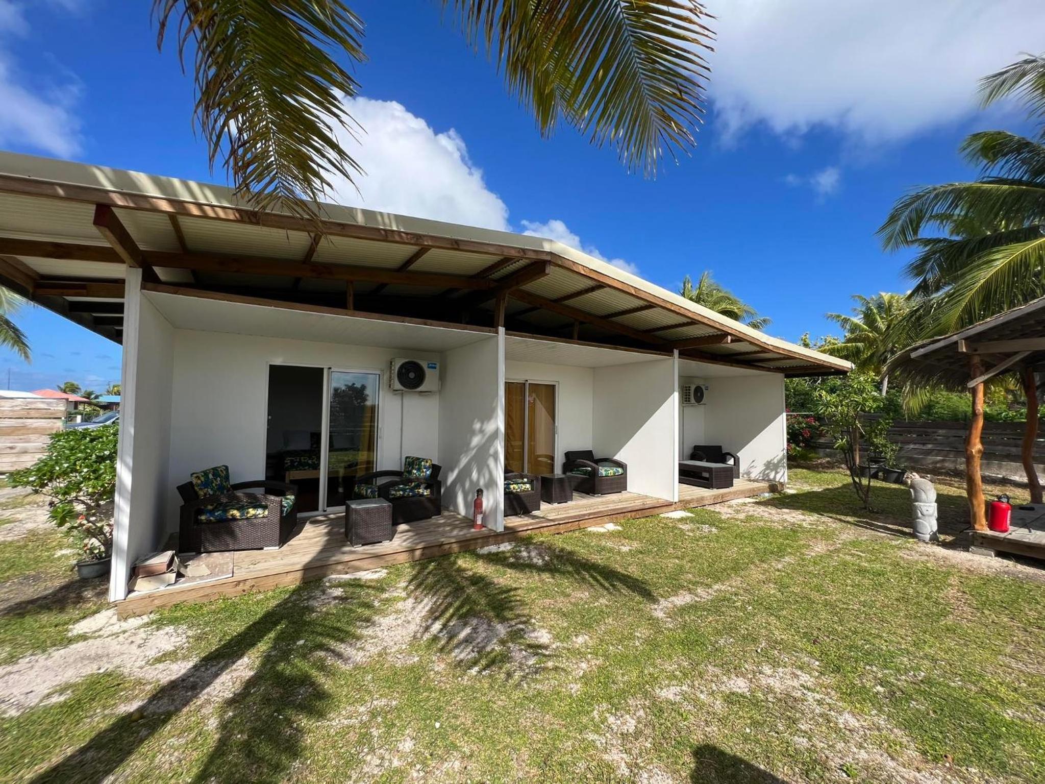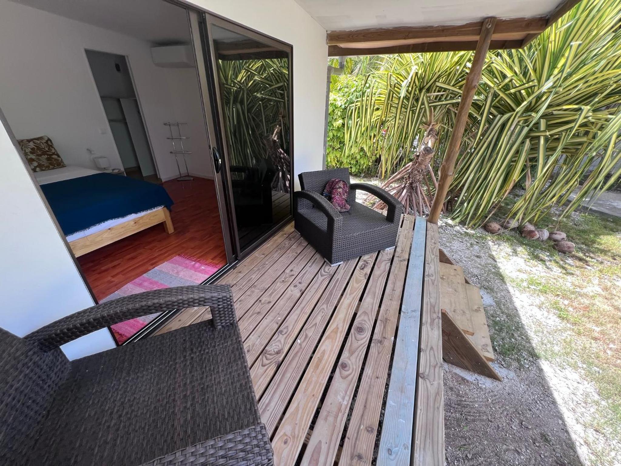 La chambre est grande et propre, avec salle de bain toute refaite. Il y a frigo, micro-onde, bouilloire, verres, assiettes, couverts.. donc pratique. La terrasse est très agréable. Il y a de quoi étendre le linge dehors. La localisation est bonne, a côté de l'aéroport, entre les deux villages Avatoru (30min vélo) et Tiputa (20min vélo). La location de vélos sur place est pratique. Transferts compris.