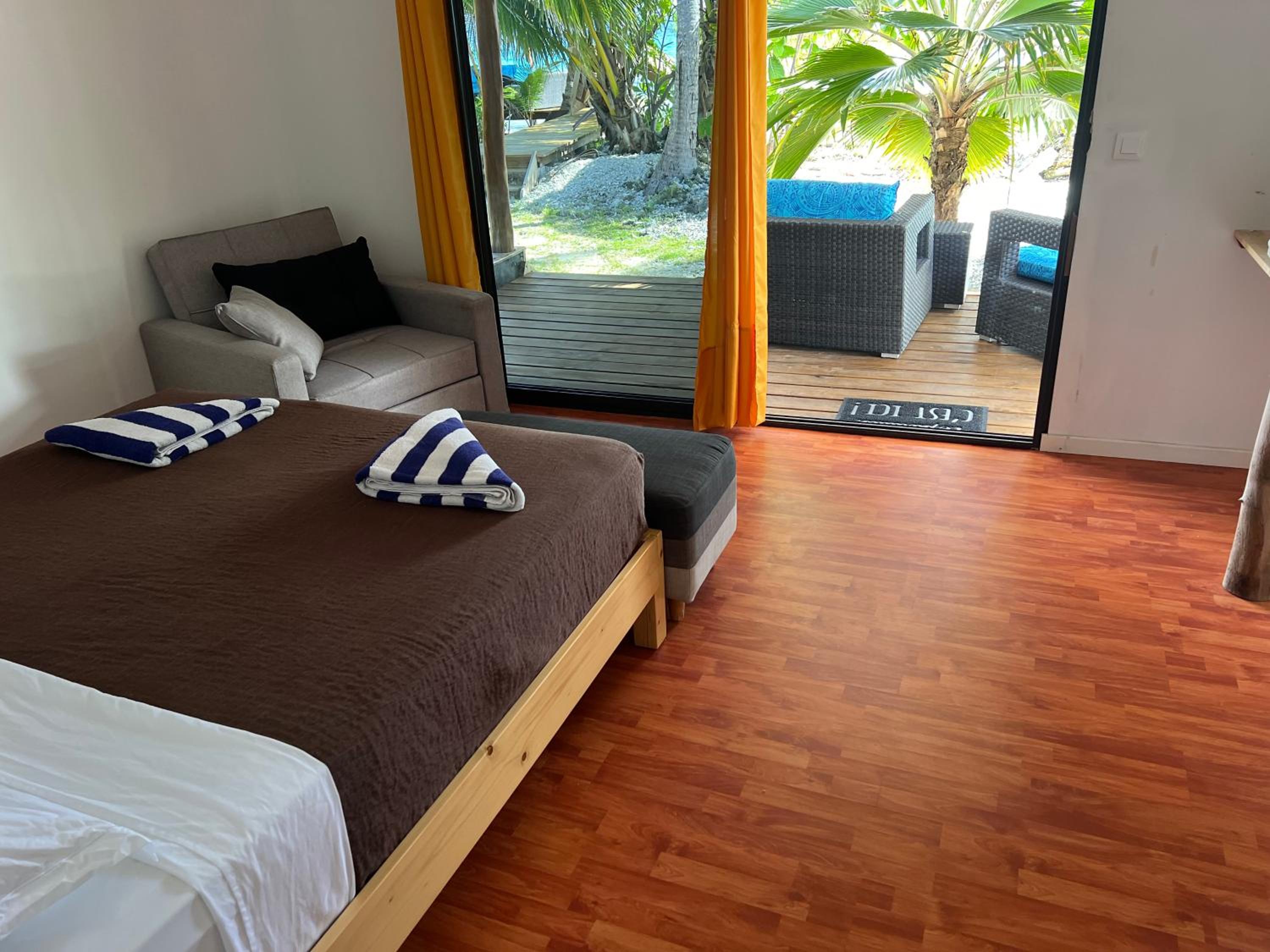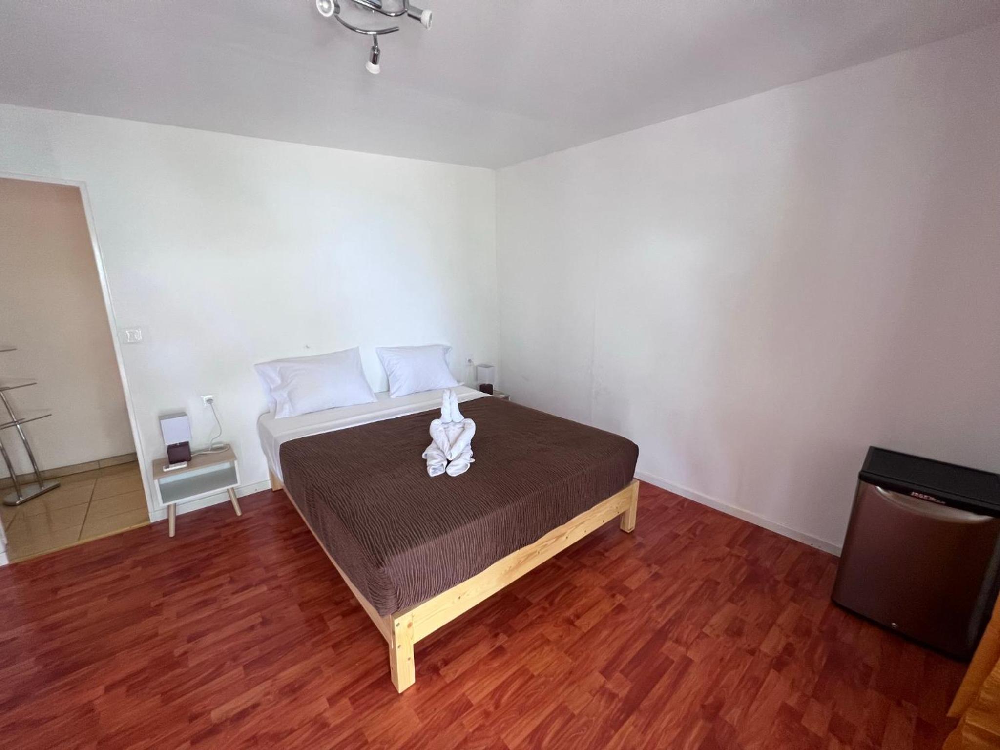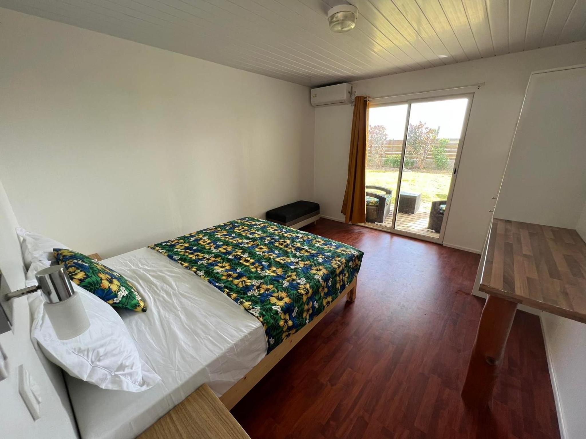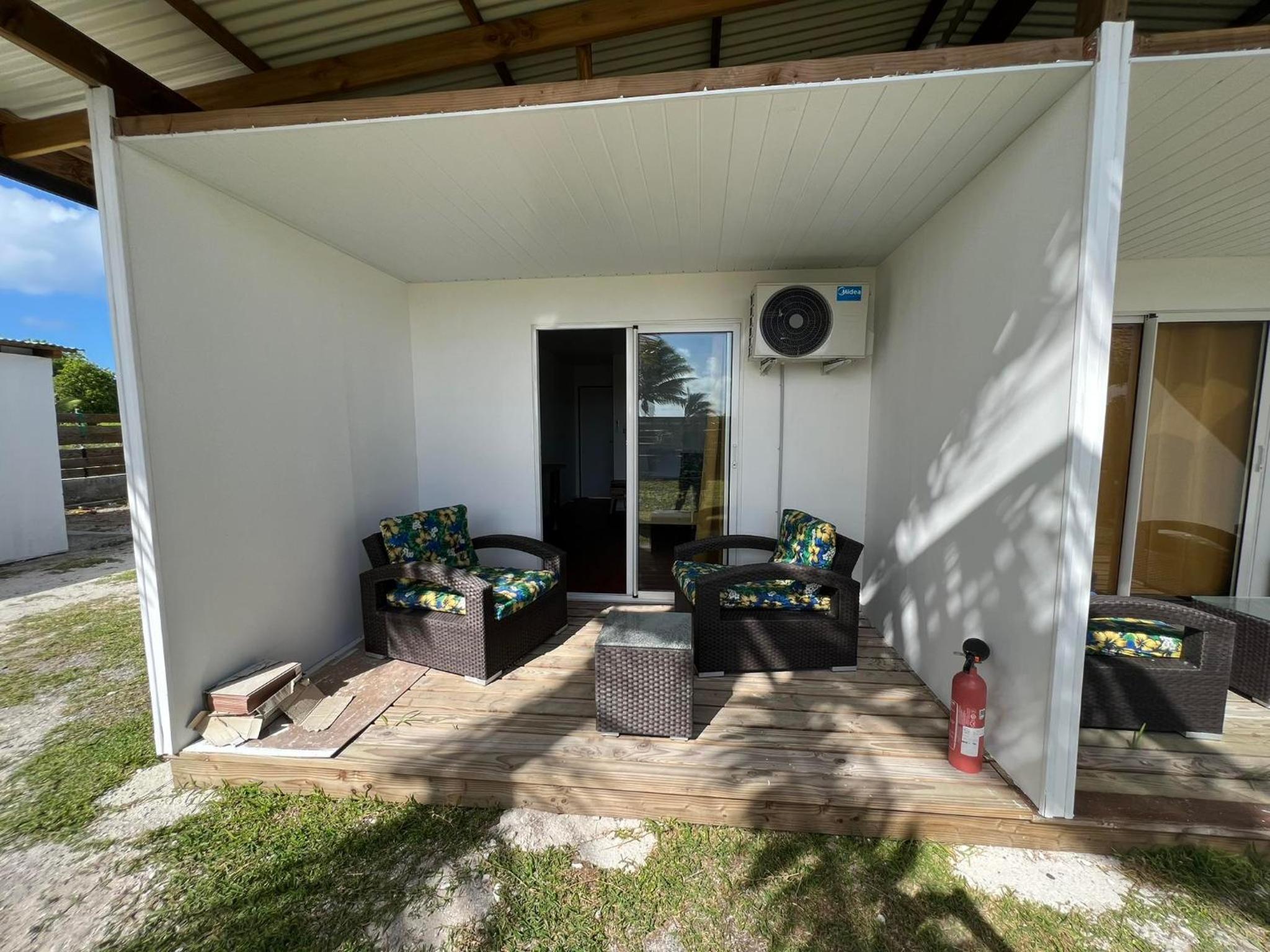 La chambre est grande et propre, avec salle de bain toute refaite. Il y a frigo, micro-onde, bouilloire, verres, assiettes, couverts.. donc pratique. La terrasse est très agréable. Il y a de quoi étendre le linge dehors. La localisation est bonne, a côté de l'aéroport, entre les deux villages Avatoru (30min vélo) et Tiputa (20min vélo). La location de vélos sur place est pratique. Transferts compris.