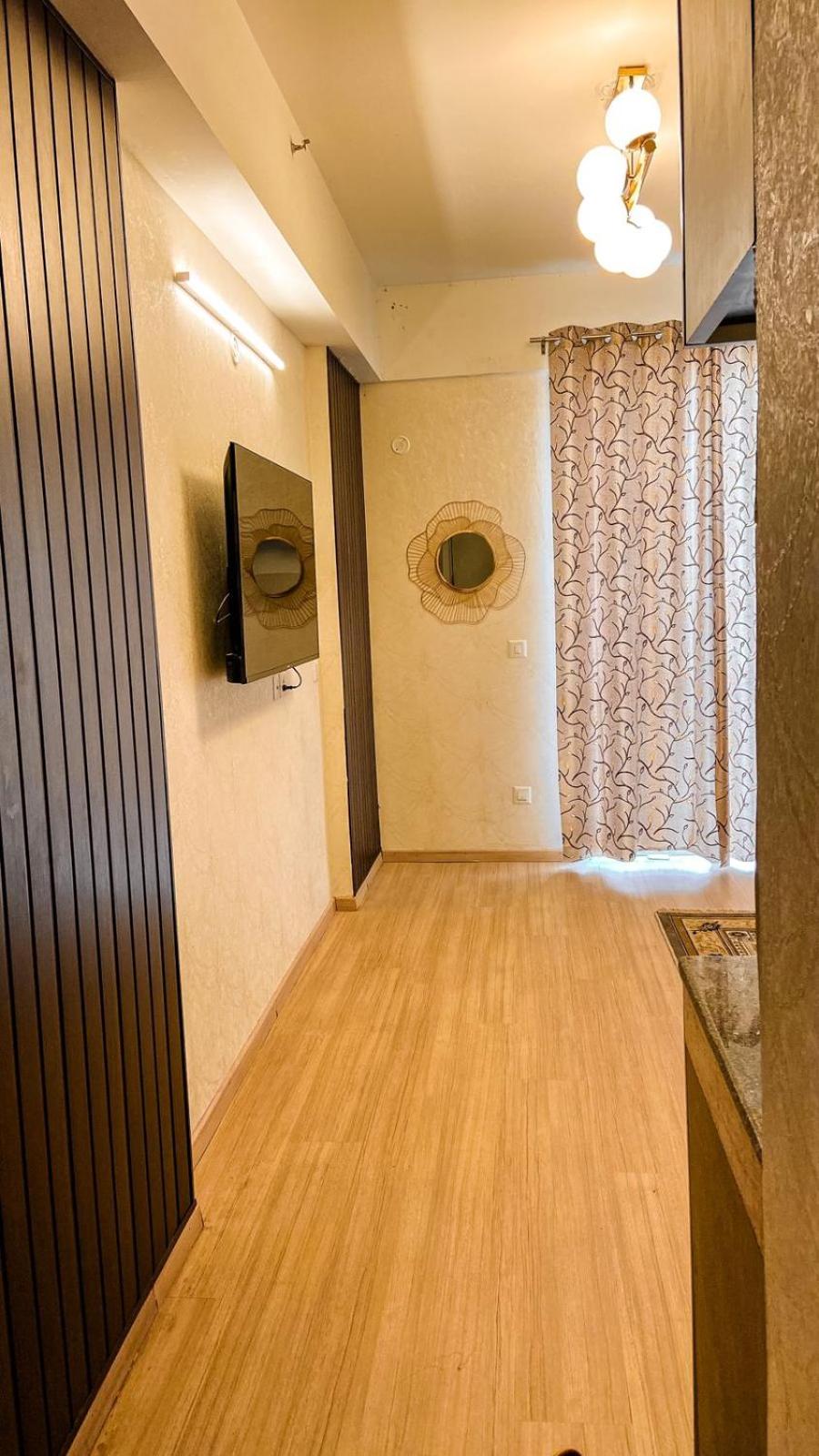 Indulge in the spacious aparthotel at Caramel DLF My Pad featuring a balcony with pool views, perfect for a relaxing stay.