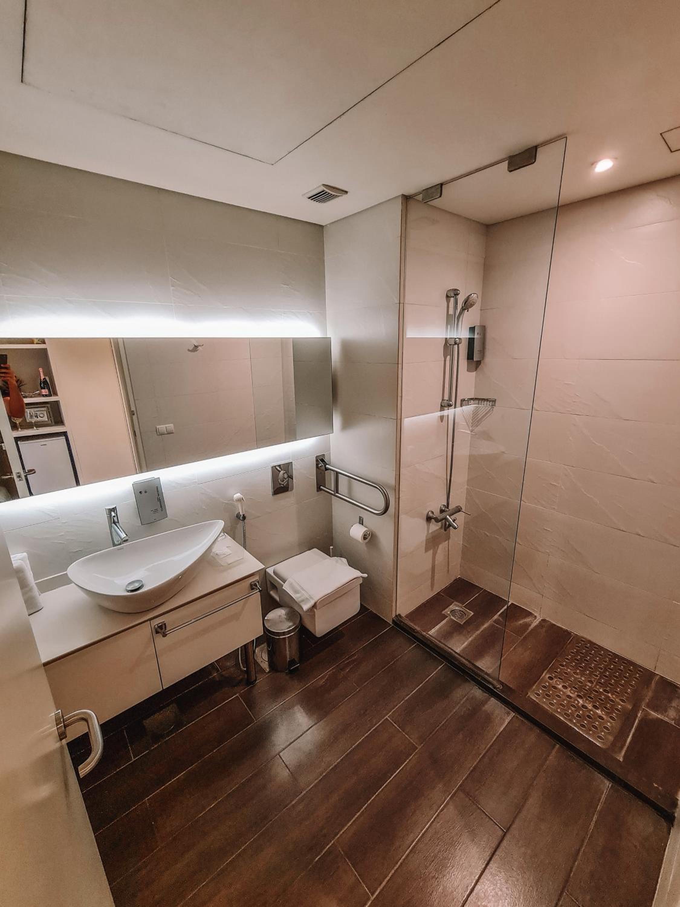 Un des murs de la salle de bain est en verre pas tellement pudique, il donne au salon. C’est bien pour un couple mais pas pour d’autres membres de famille ou amis