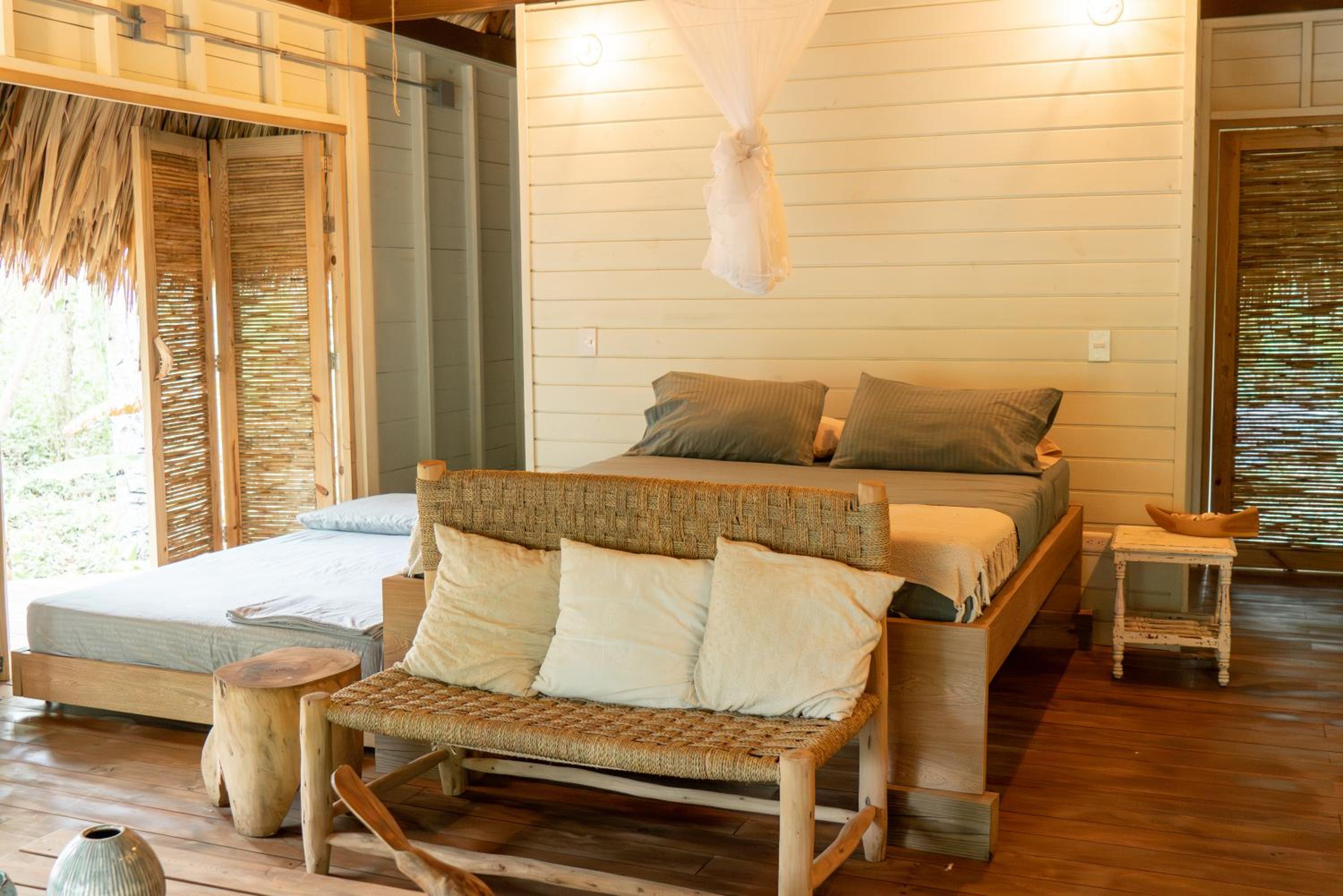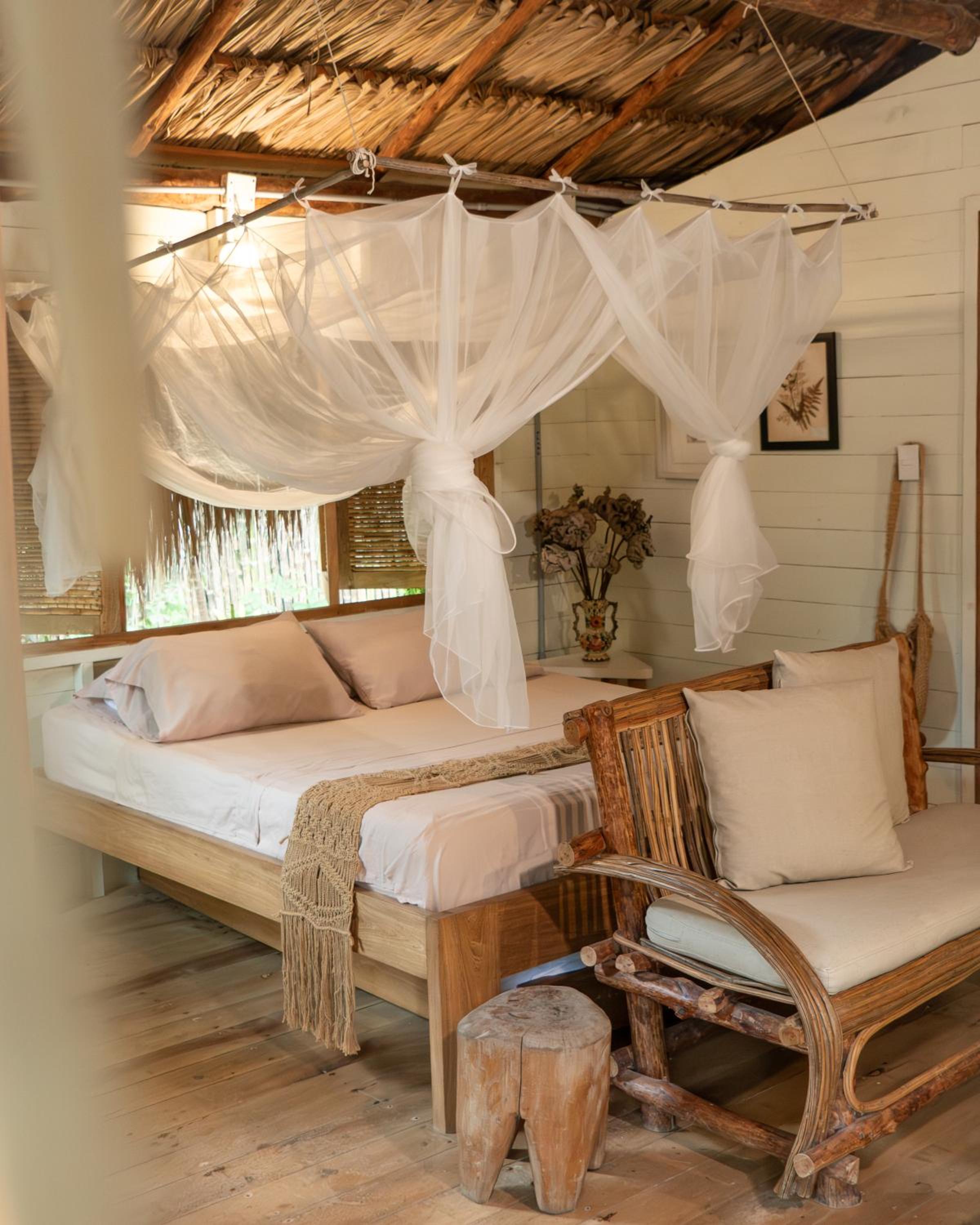 The bedroom is so large and comfortable with indoor and outdoor areas to relax. The bed has a great mosquito net for protection at night.