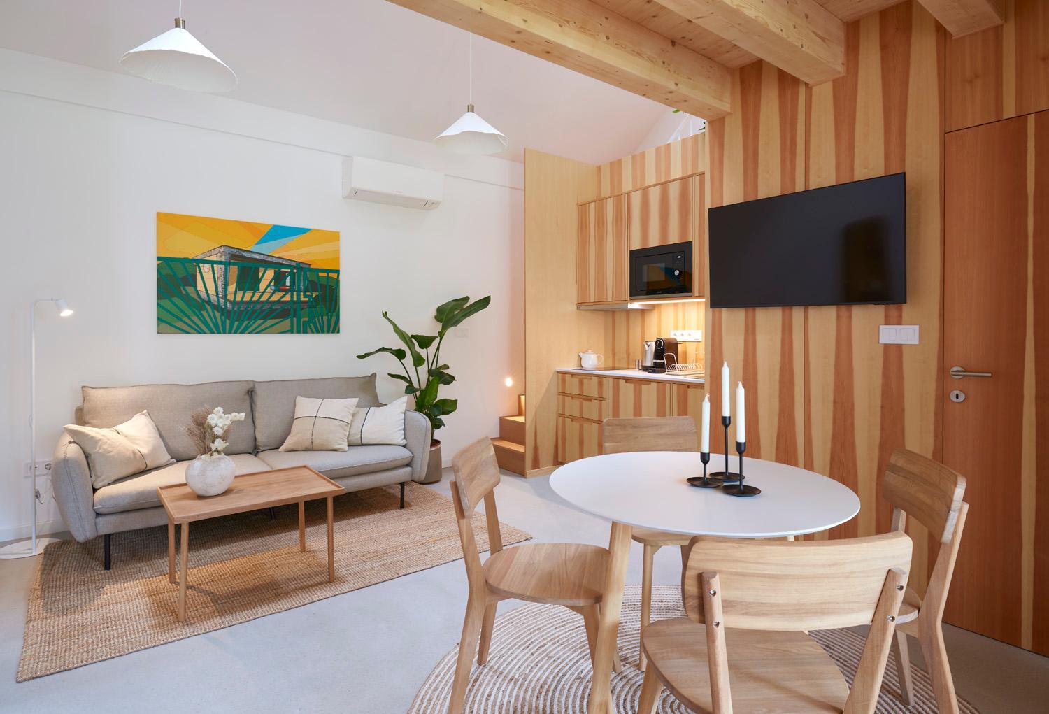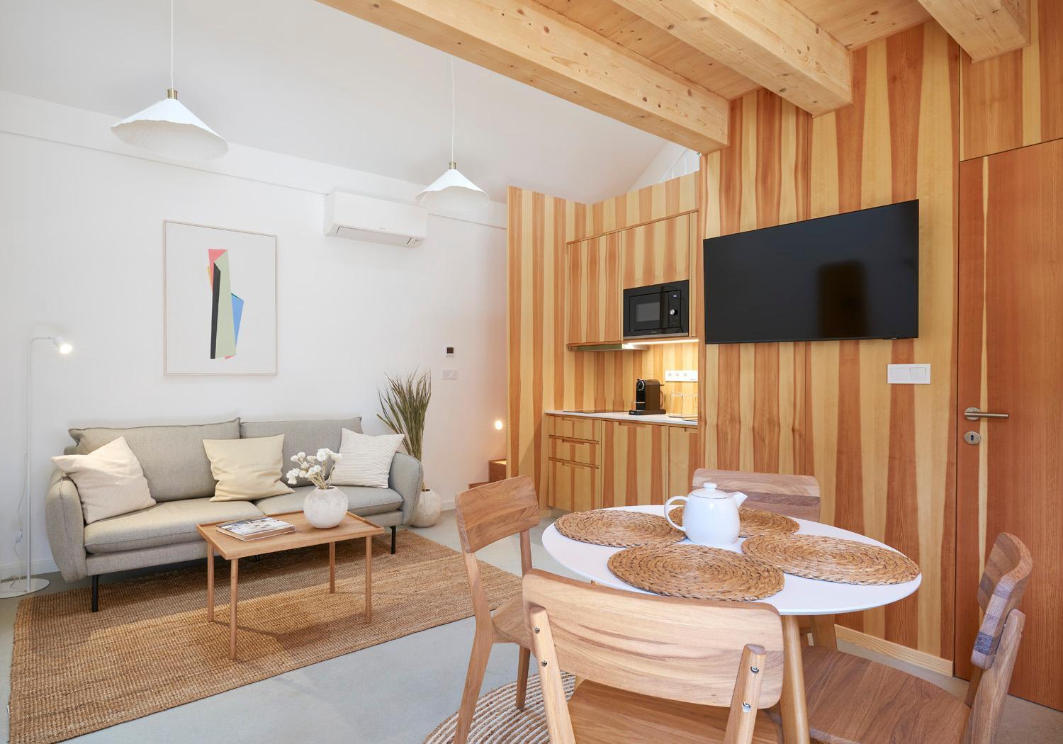 Each unit is equipped with air conditioning, a flat-screen TV with streaming services, and a fully stocked kitchen including a coffee machine and microwave. Guests can enjoy the convenience of free WiFi, a shower, hair dryer, and wardrobe in every room.