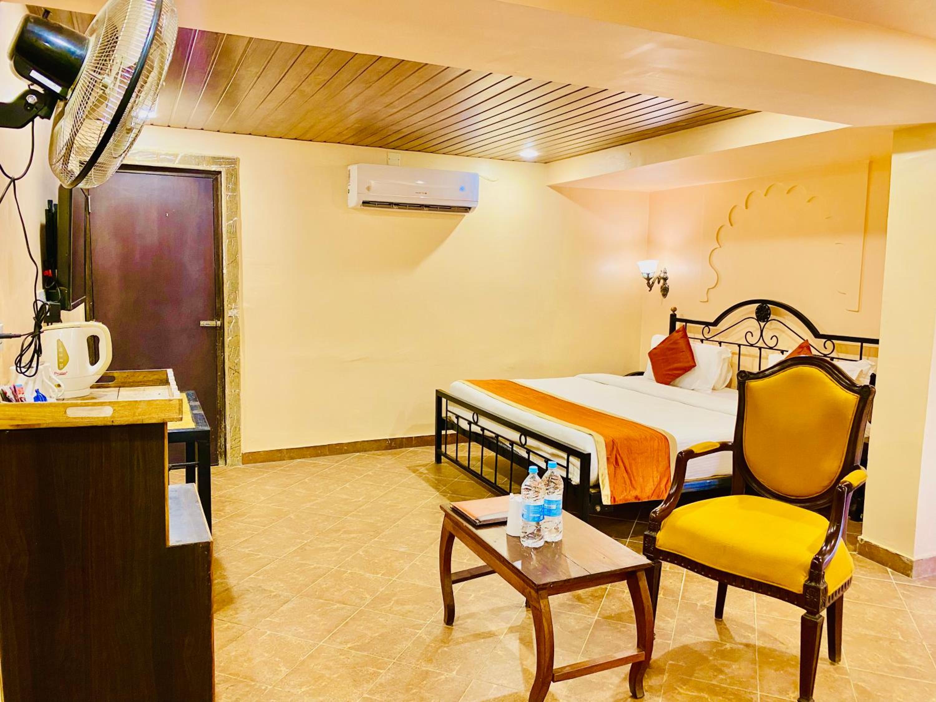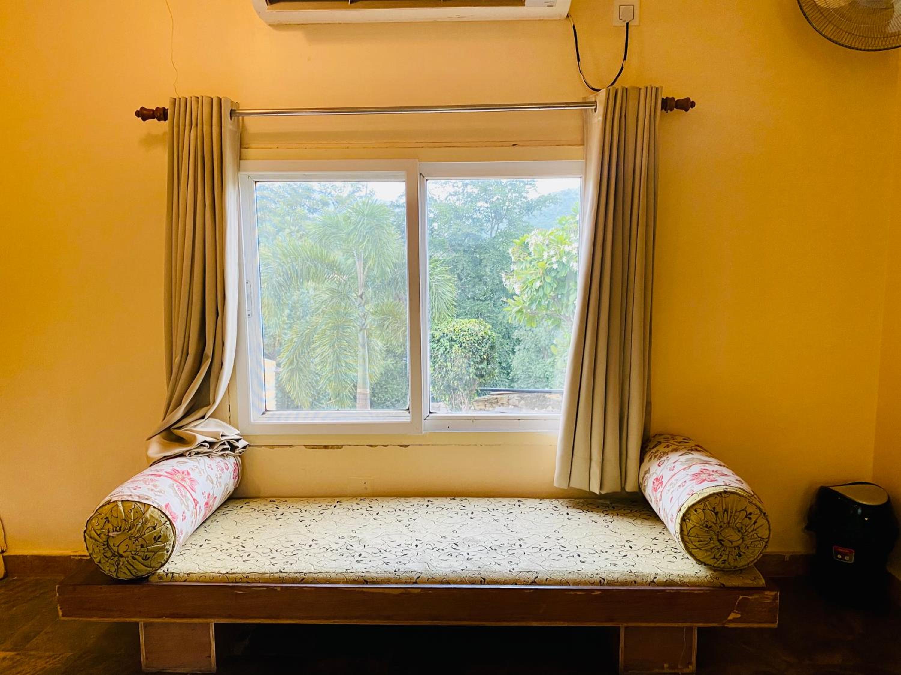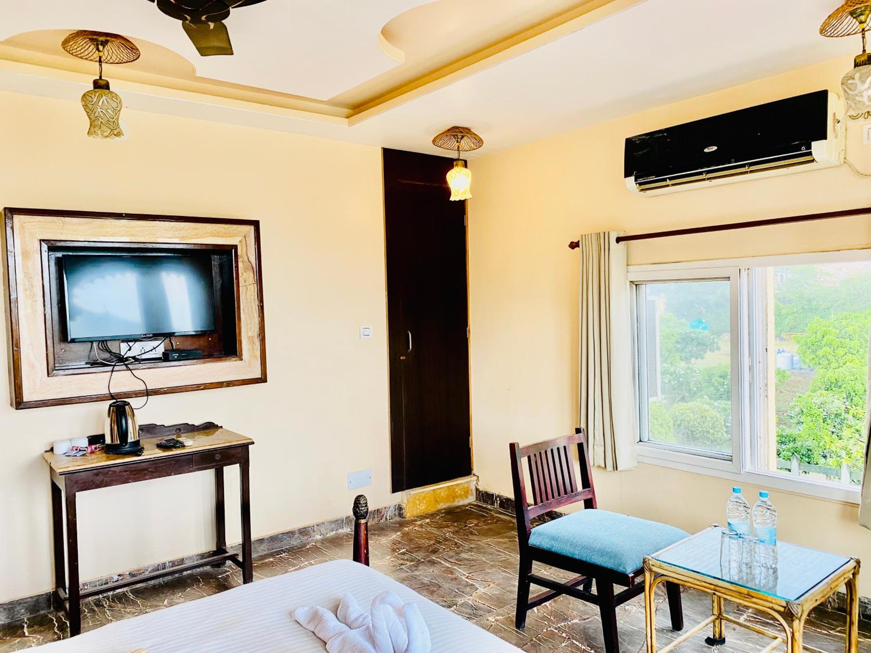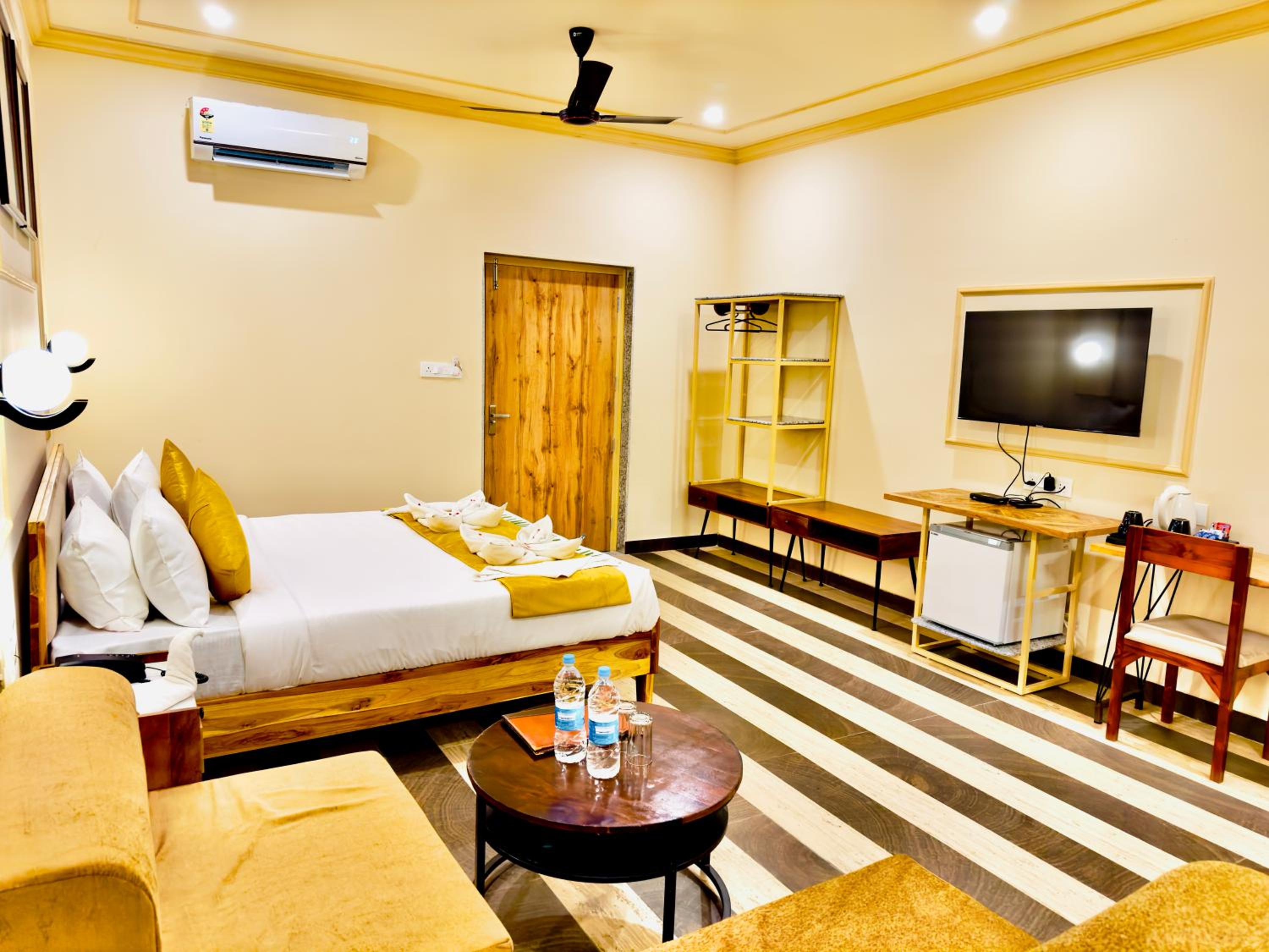 Experience comfortable rooms with modern amenities and stunning mountain views at Udai Valley Resort.