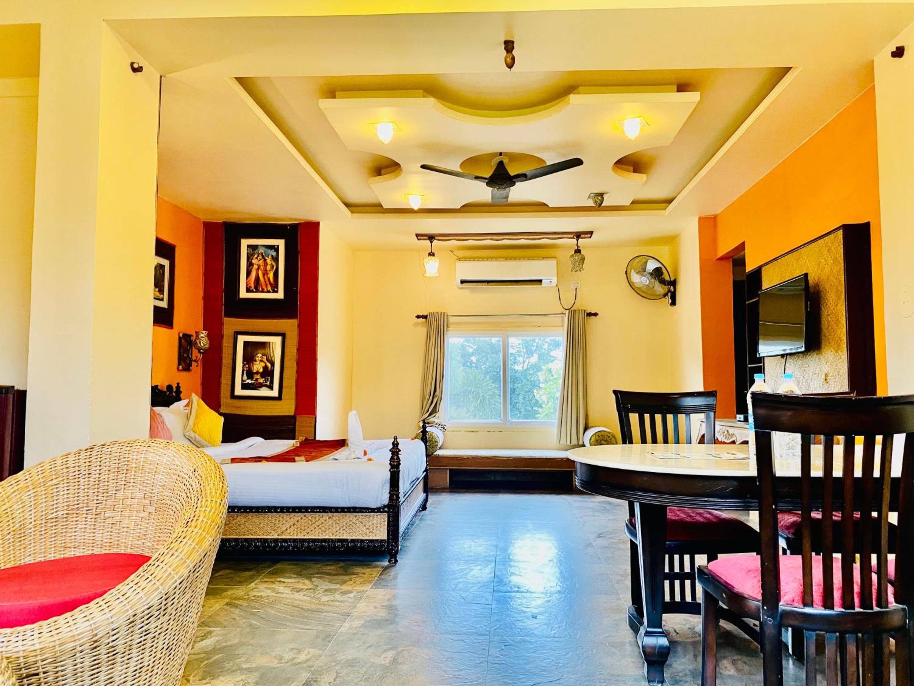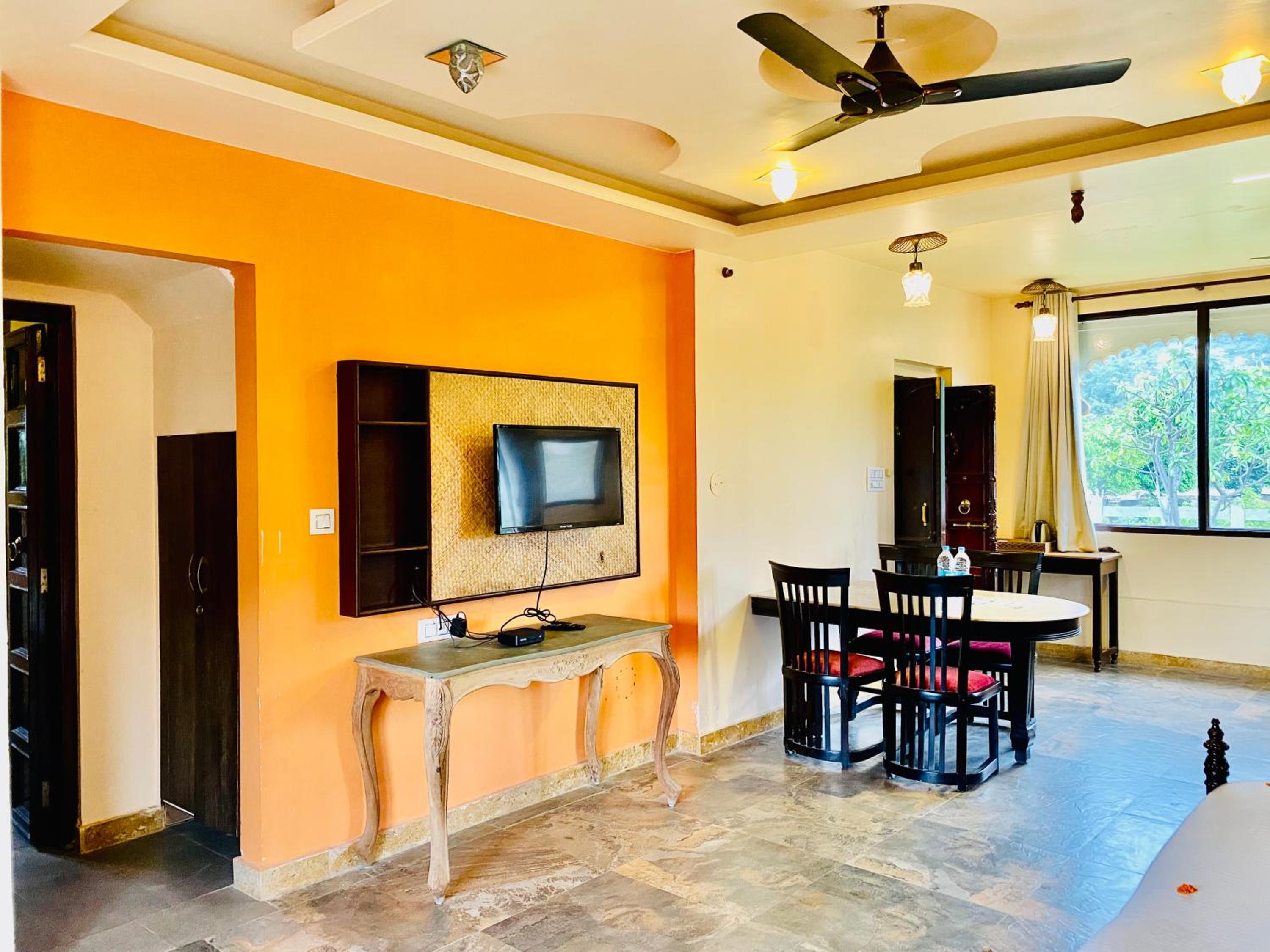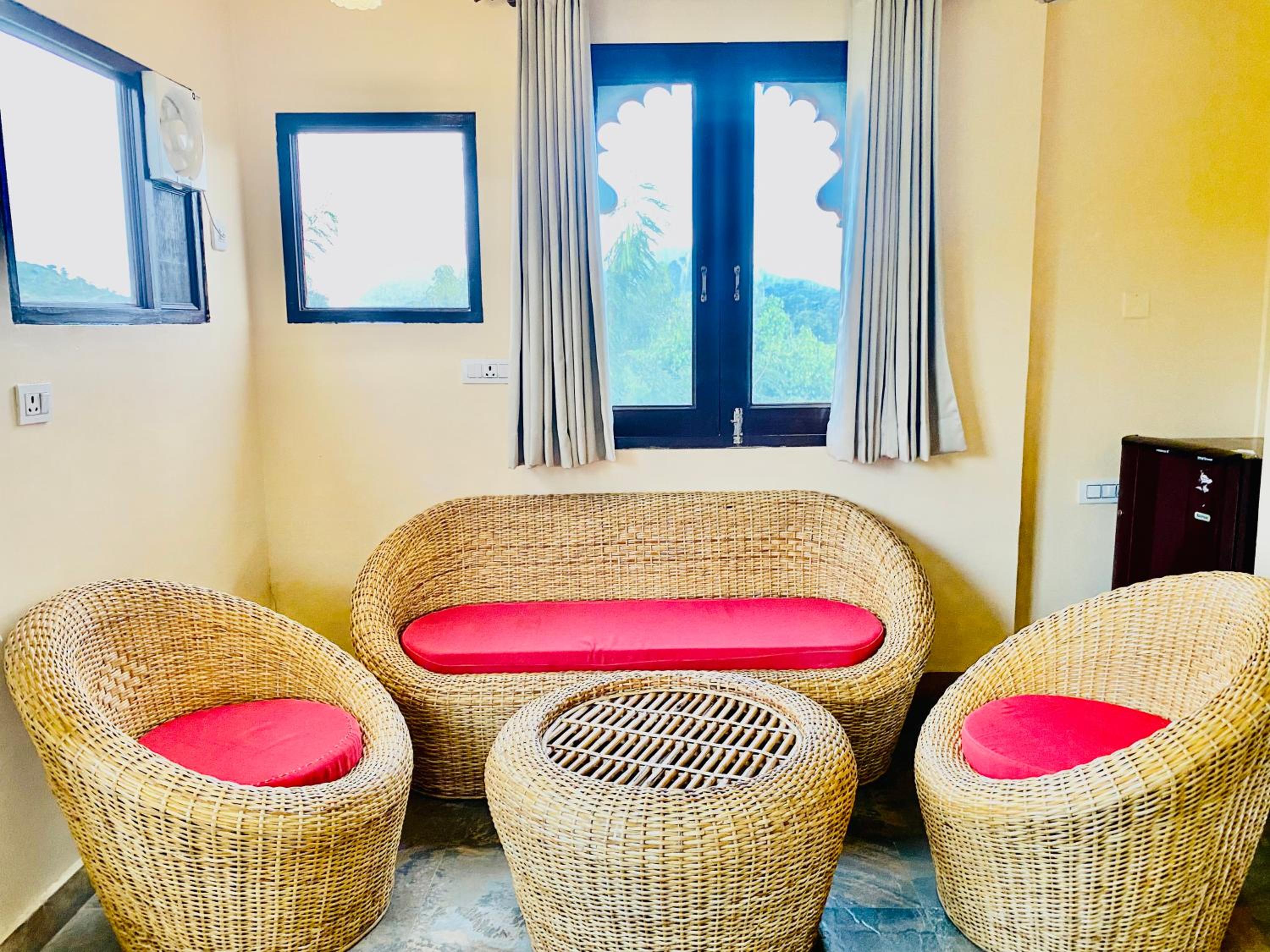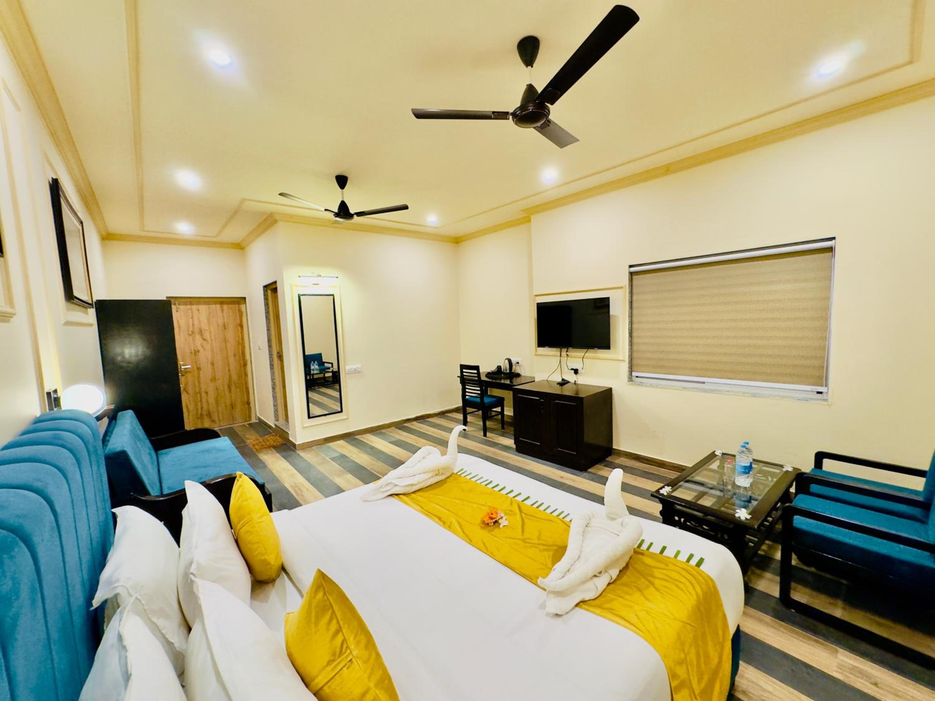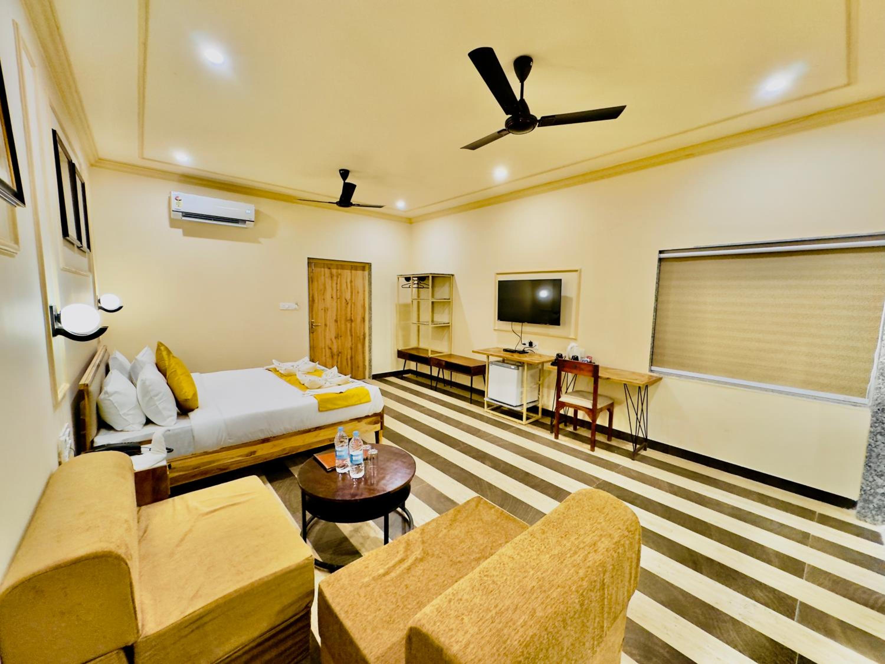Experience comfortable rooms with modern amenities and stunning mountain views at Udai Valley Resort.