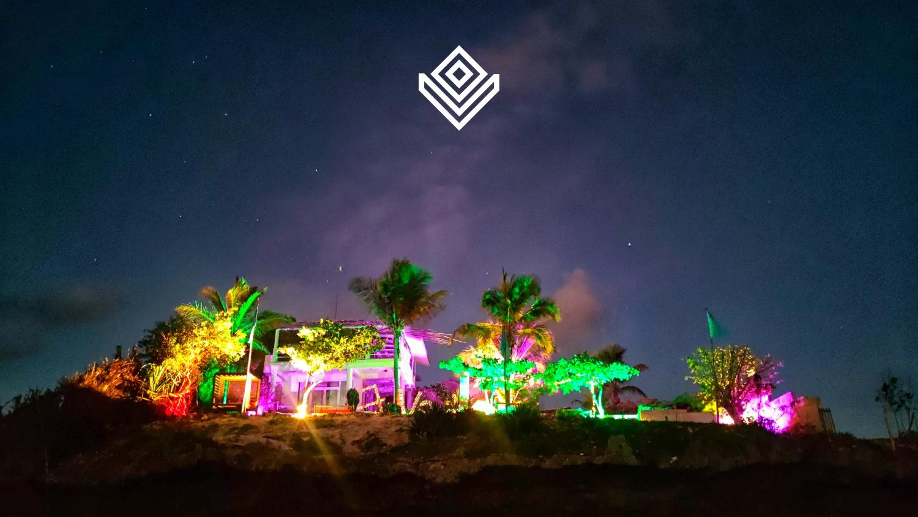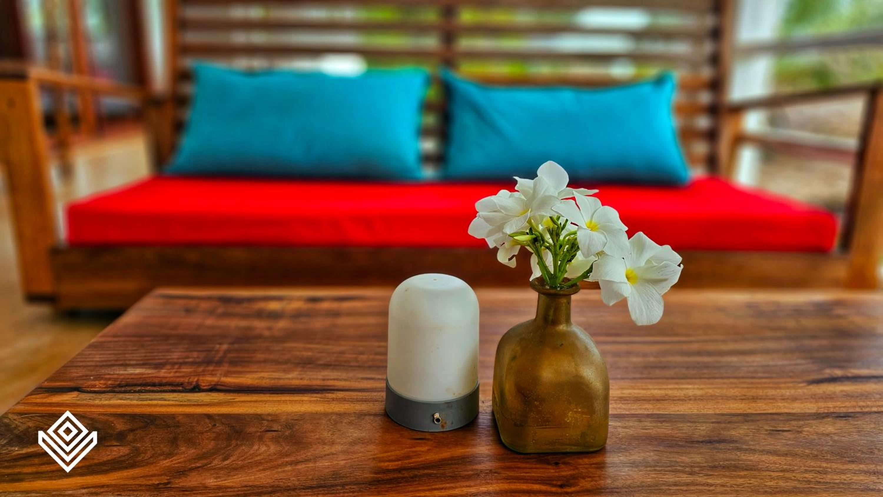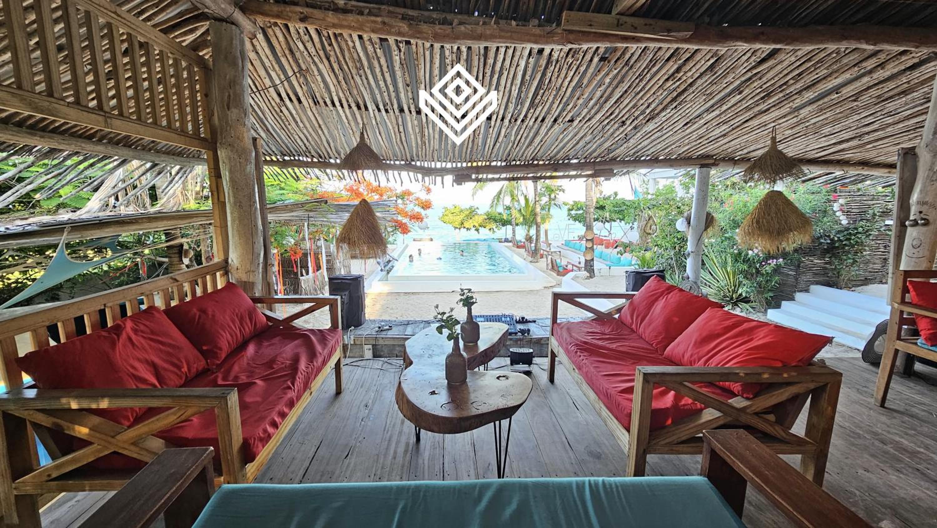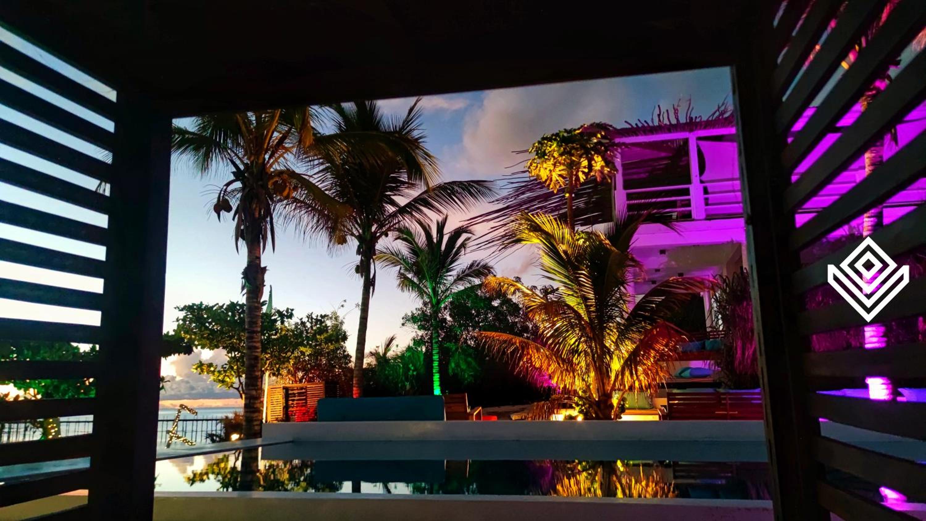 We especially loved the villa’s outdoor design, where bold red and sea-green accents beautifully contrast with the dominant whites of sand and concrete, the turquoise shimmer of the pool and ocean, and the lush greens of the plants. It feels like a small, creatively designed paradise — one that looks just as stunning at night under the soft glow of the lights.