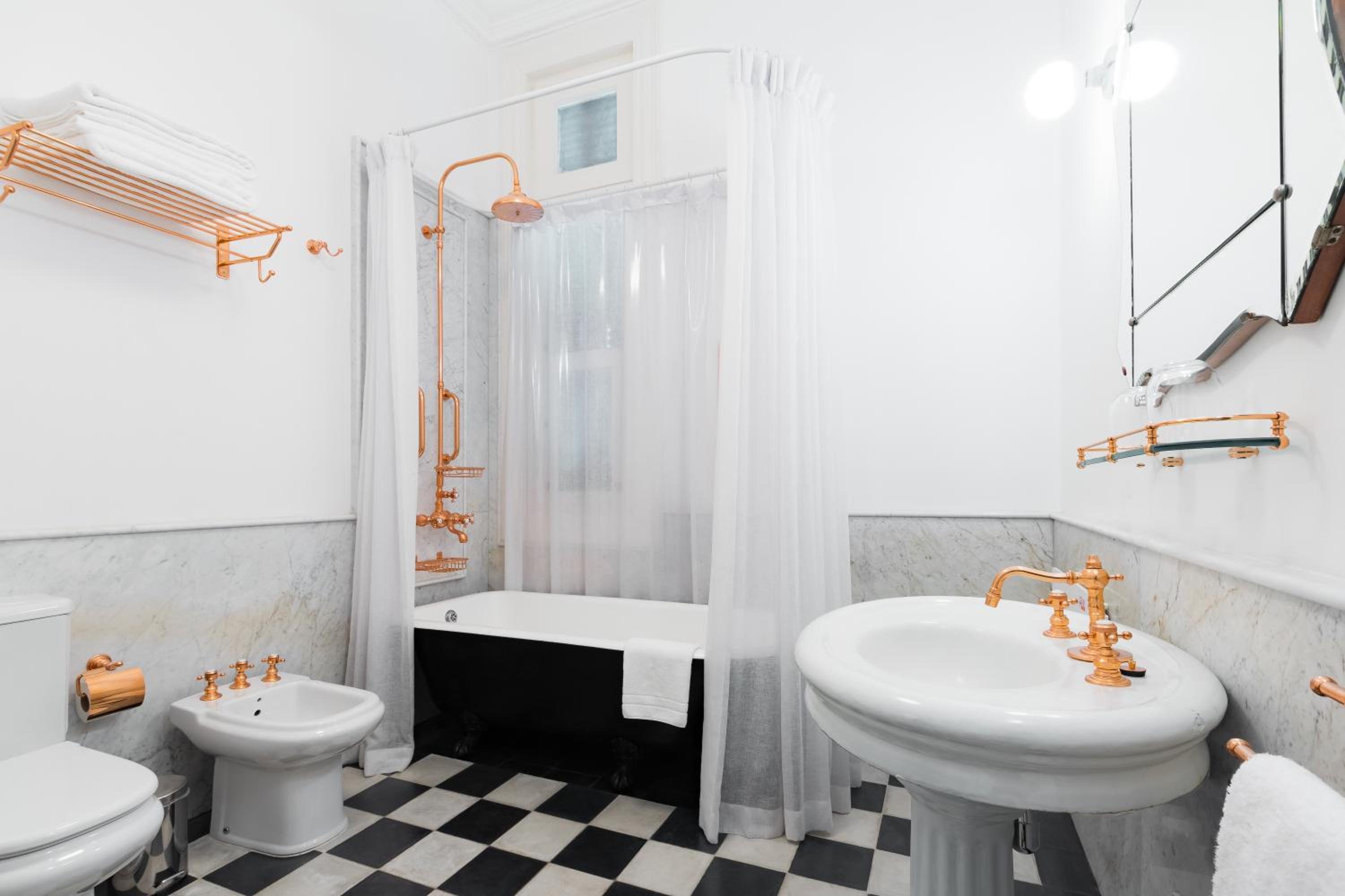 Elegant furnished room with historical items. Very nice bathroom. Really good restaurant, the chef is a master of his art.