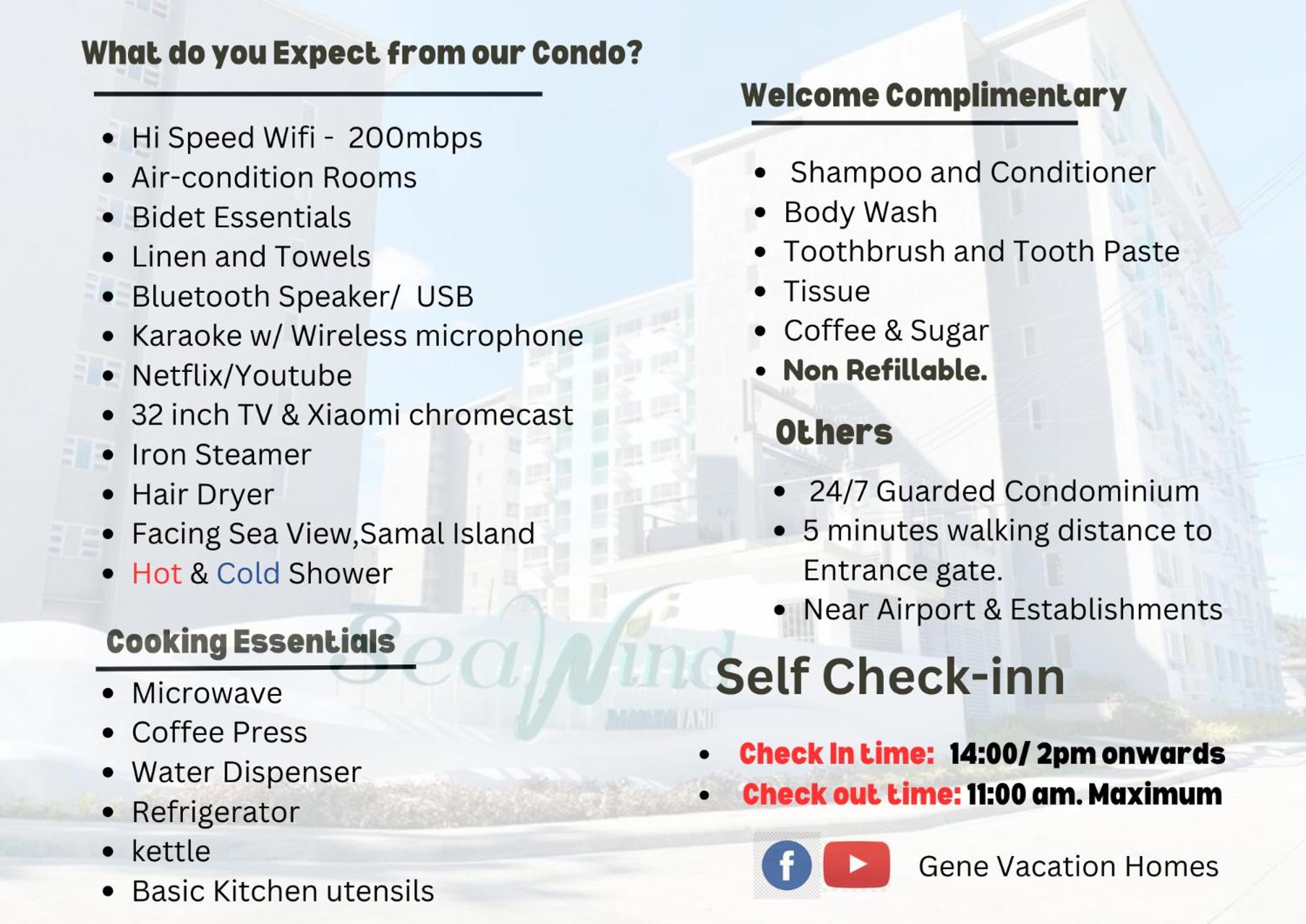 Very well equipped. Comfortable. Loved sitting on the balcony looking at sea view to Samal island. Very helpful security staff.