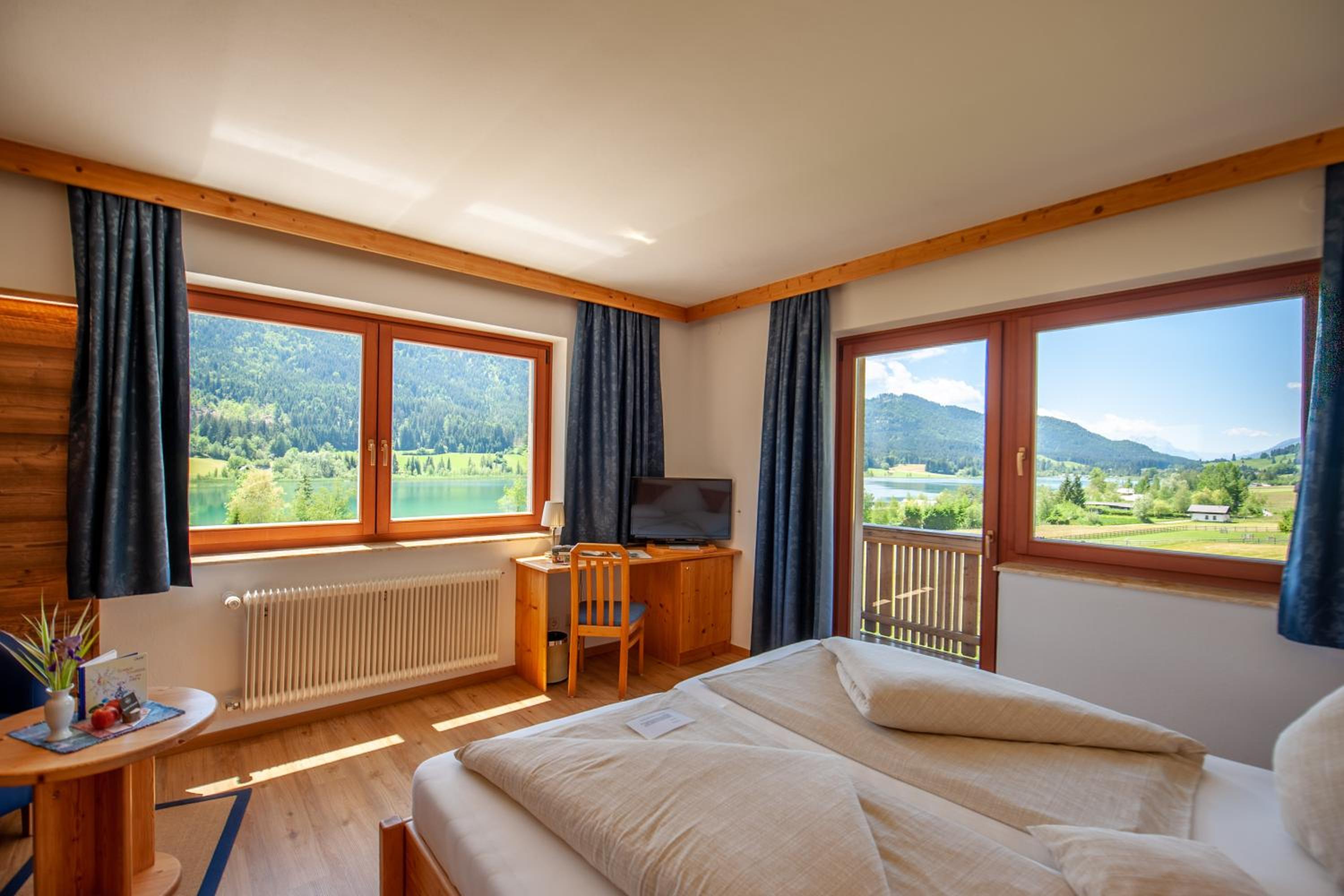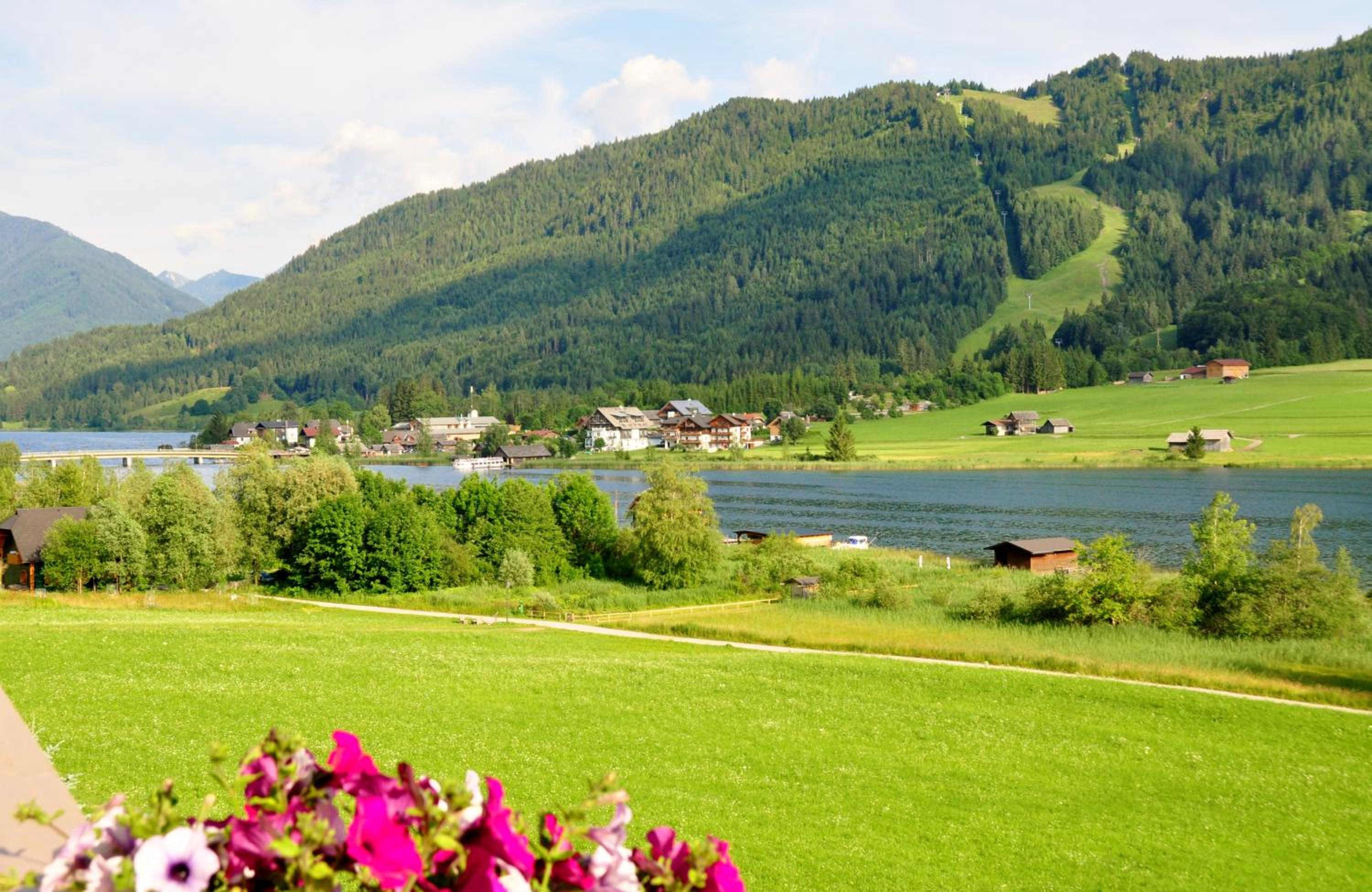 Experience tranquility at The Wiesenhof, nestled on the sunny shore of Weißensee lake. Enjoy a private beach and complimentary rowing boats for a serene getaway.