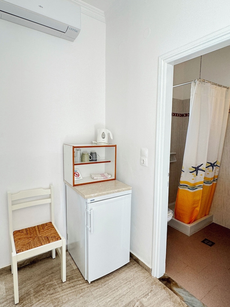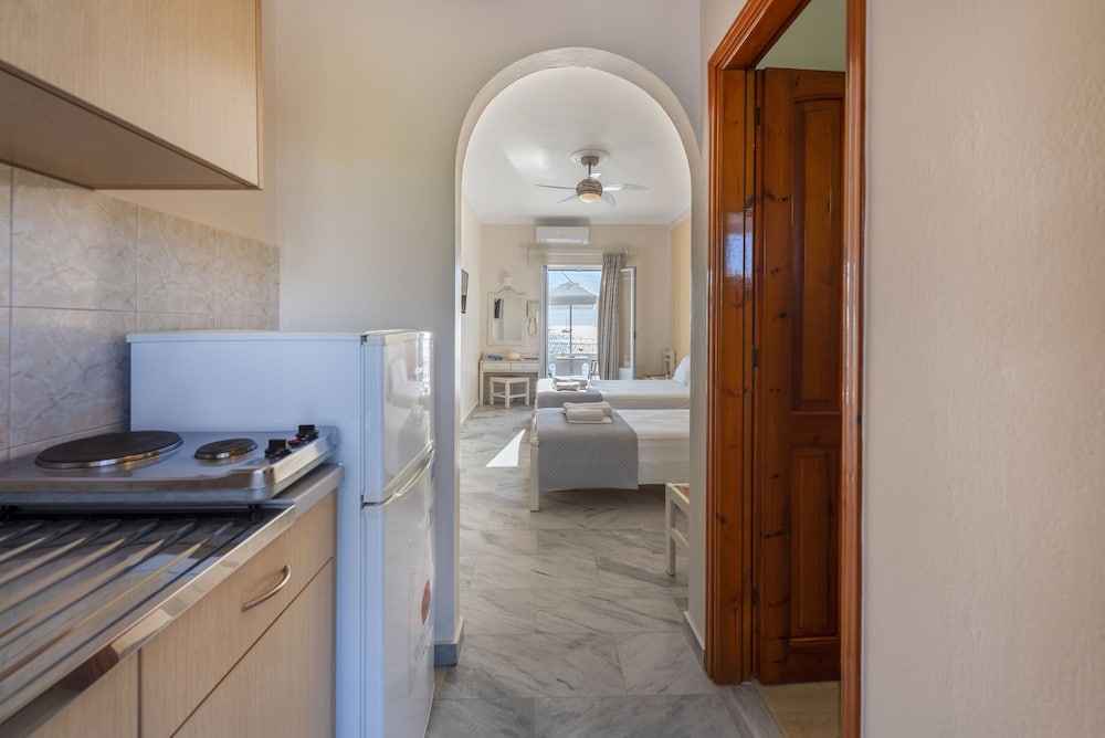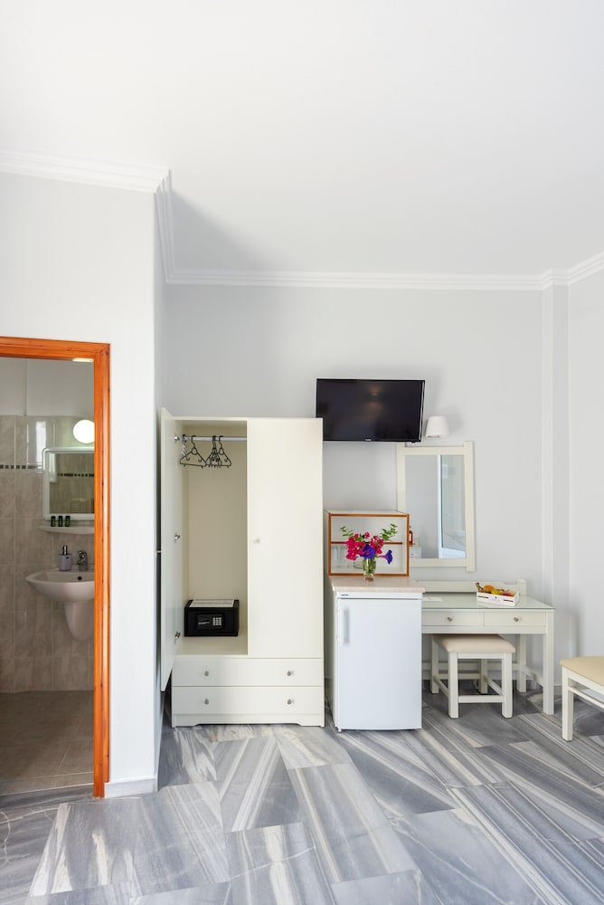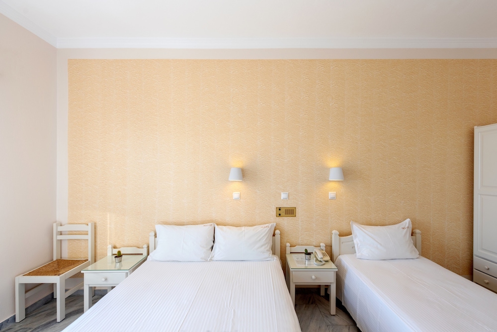 Our room was clean, but viewed the parking lot. Family run with a helpful staff. In a great location, surrounded by restaurants, across the street from the beach and a 10-min walk to Parikia. Staff helped us rent a car, recommended us stuff to do and how to get there.