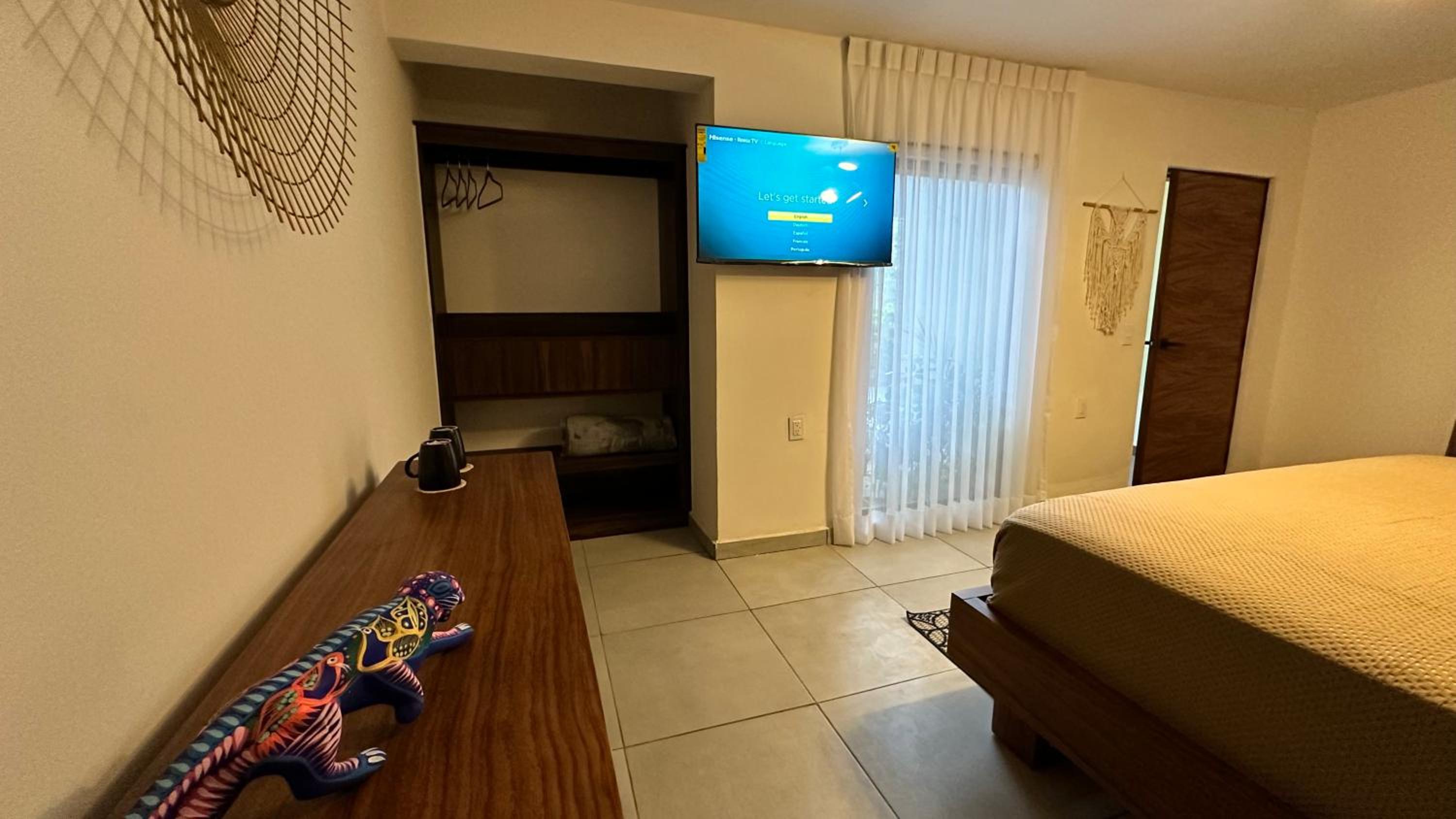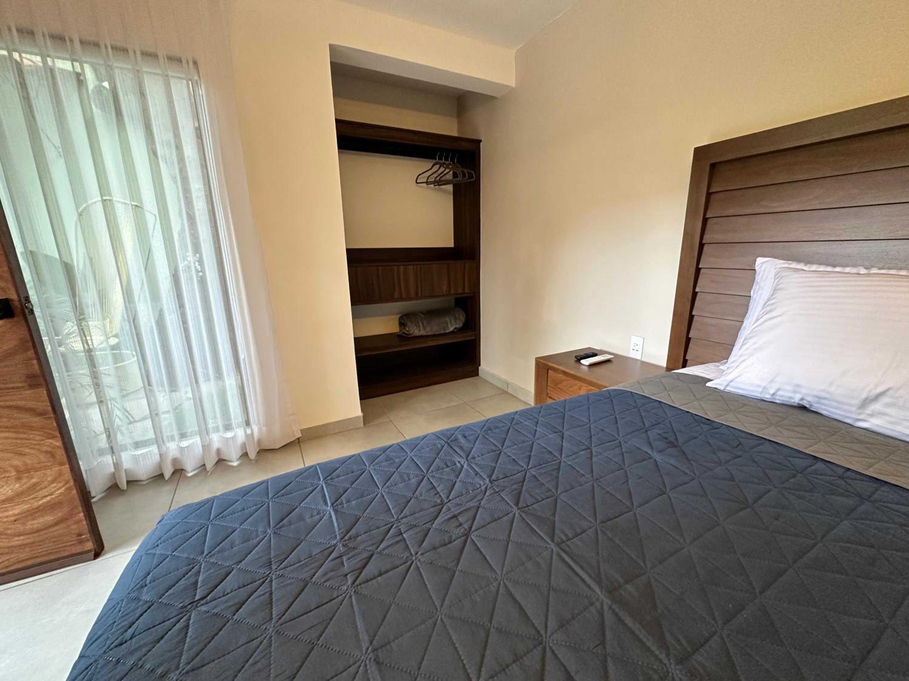 Very small of a room, no chairs. loose backboard on bed, screeching bathroom door. moisture stains and smell on closet and bathroom. No space for luggage. No space to hang dresses. Only shirts/blouses. No cleaning service.. “ do it yourself trash/towels/sheets. Limited customer service on site. NO SWIMMING POOL. It’s more like a large shallow tub.