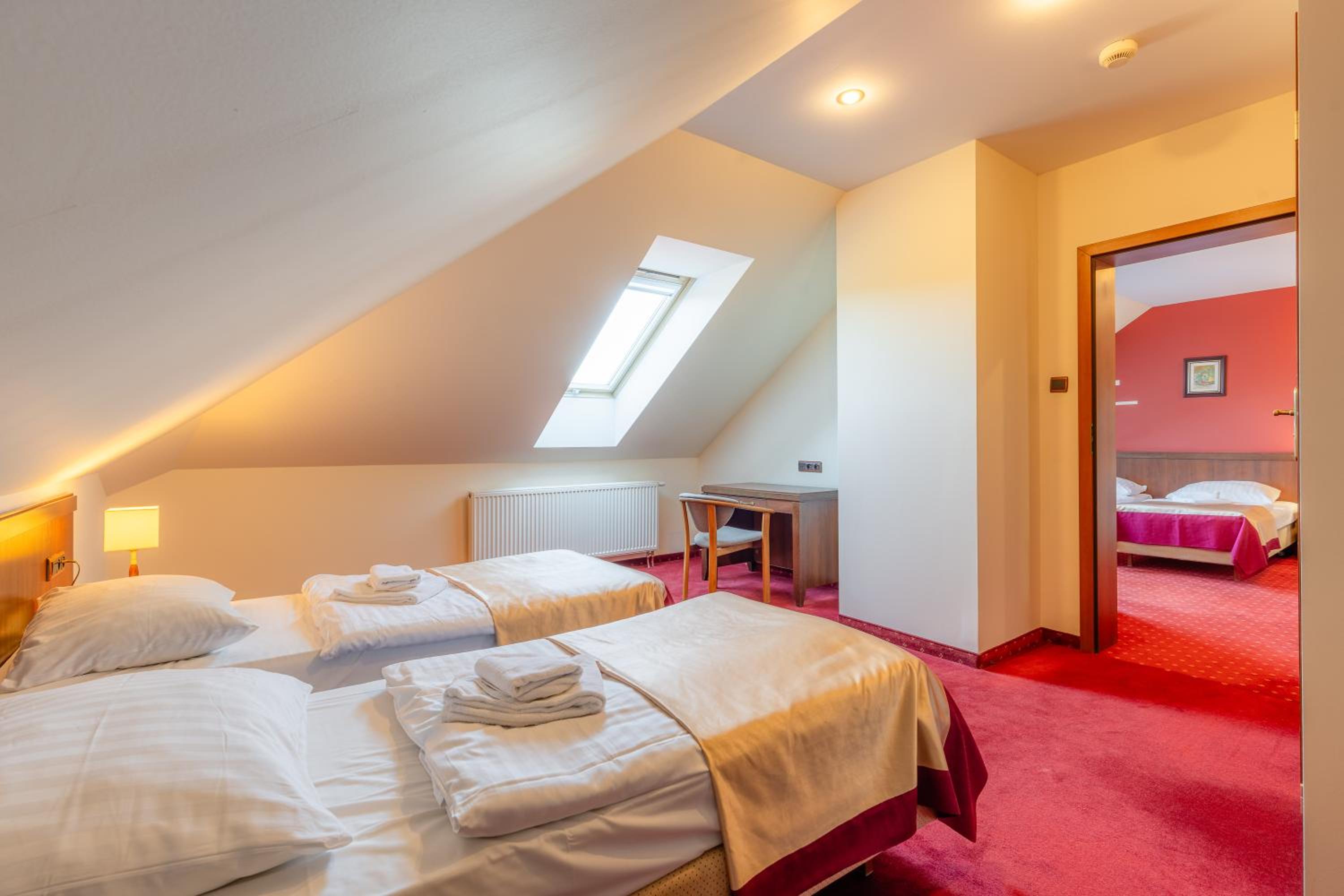 Zarezerwowane trzy pokoje o jednym standardzie , jeden pokój dostaliśmy o podwyższonym standardzie a dwa o niskim , daleko od siebie. W pokoju o podwyższonym standardzie nie działa lodówka, suszarka do włosów cały czas się włącza, generalnie pokoje wymagają wymiany sprzętu.