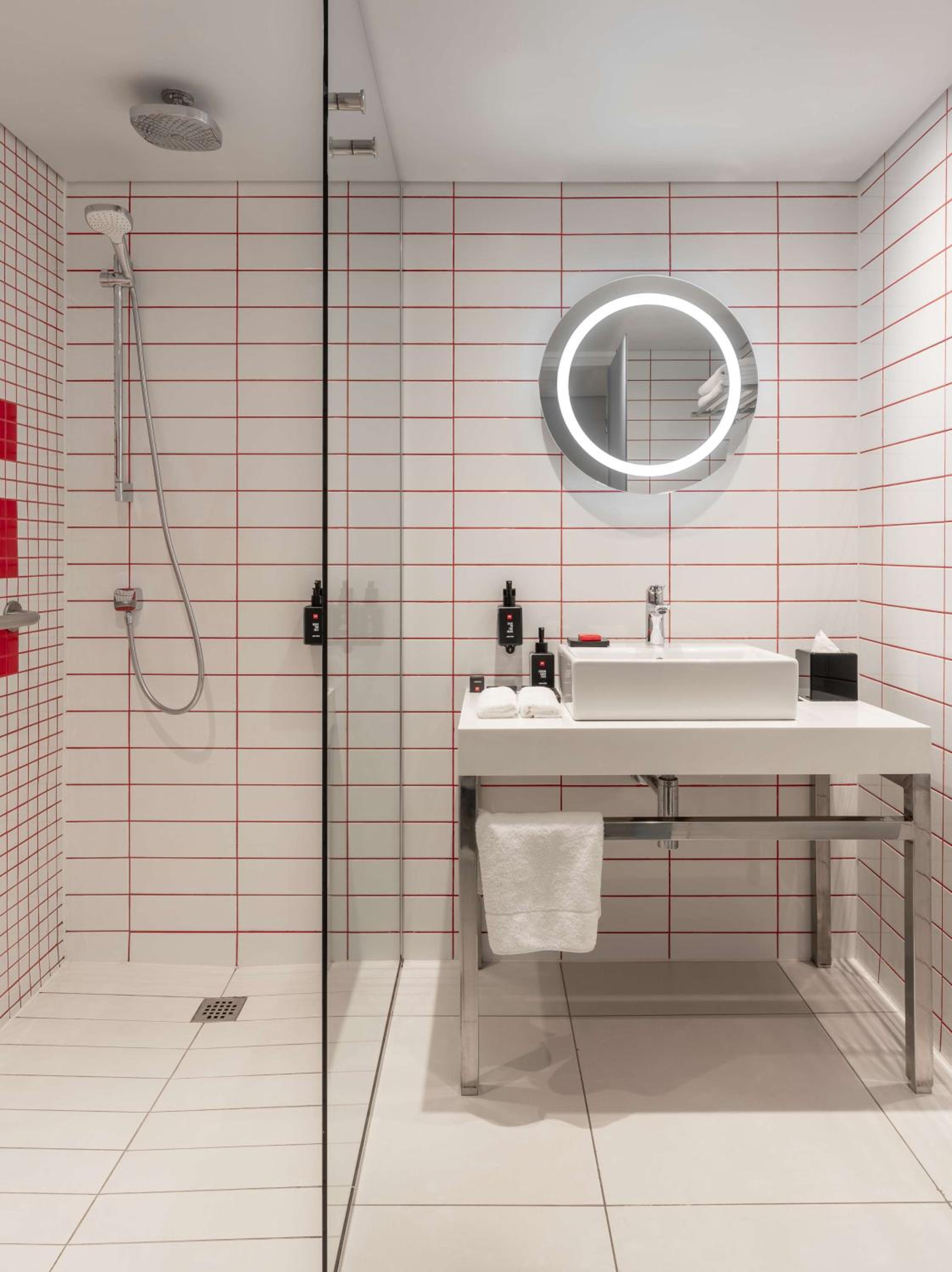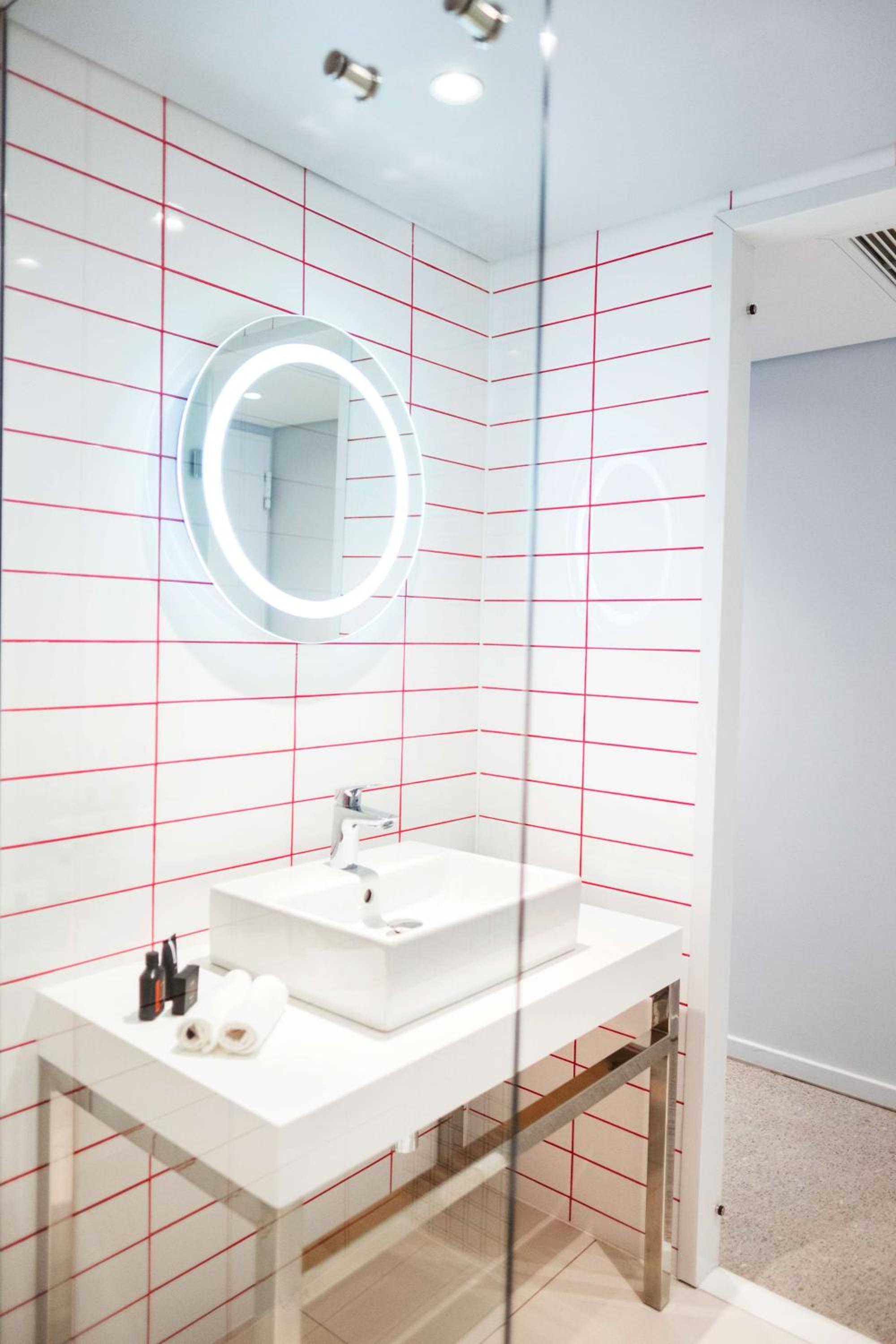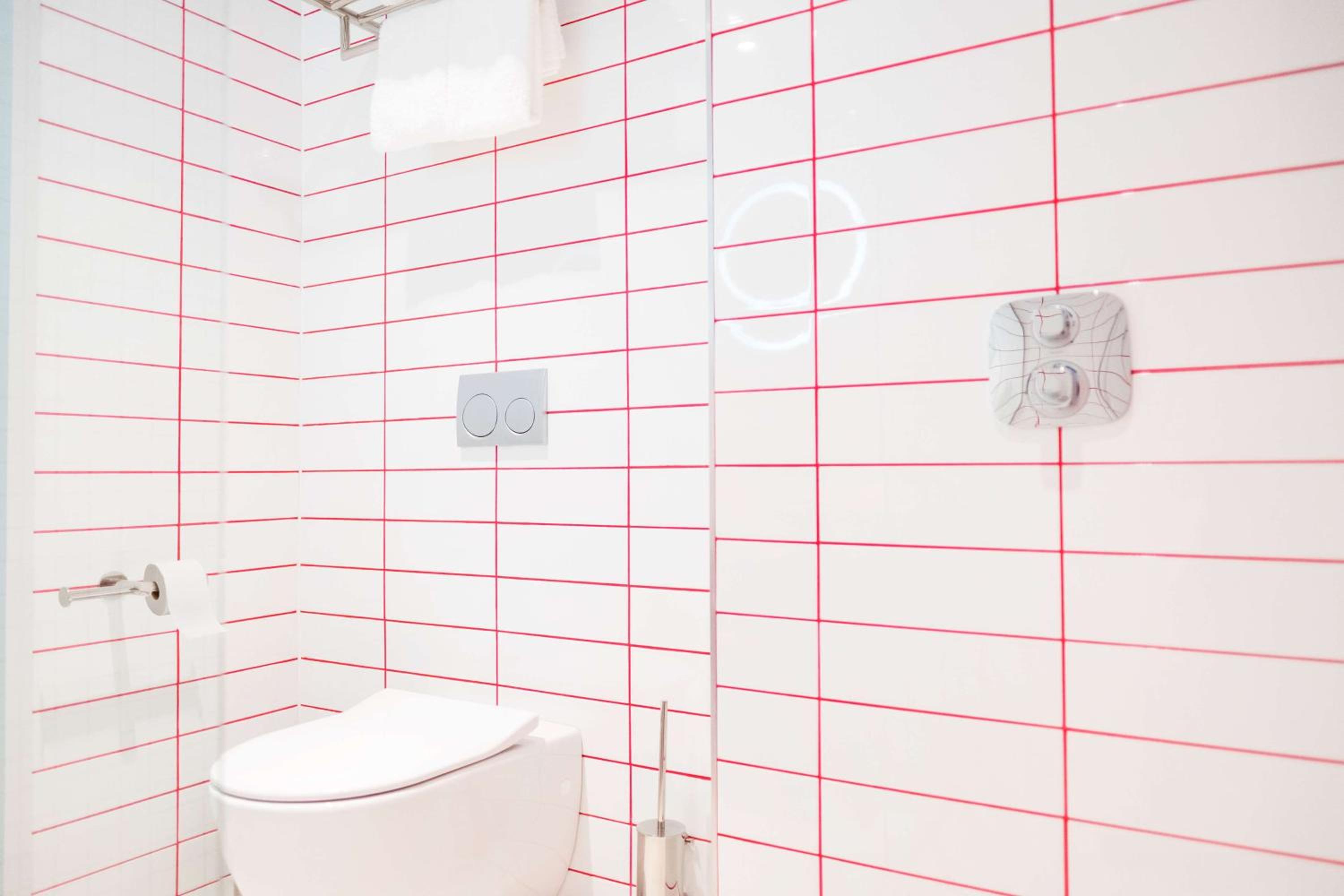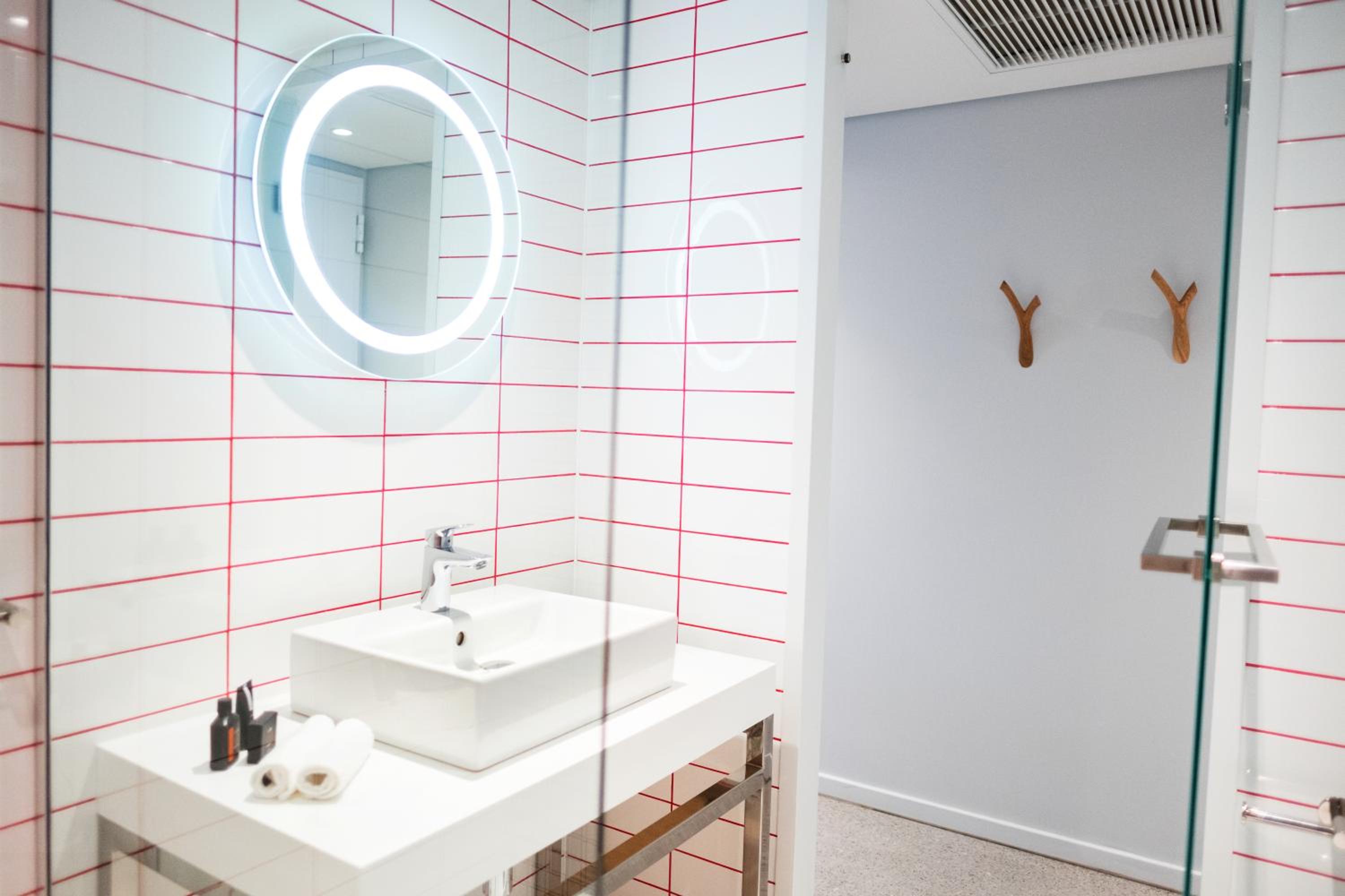 Indulge in modern rooms adorned with captivating wall art, featuring top-notch amenities such as a 55-inch smart LED TV, customizable lighting, and a convenient in-room fridge. Relax in the art-tiled bathrooms with a luxurious walk-in rain shower and complimentary toiletries.