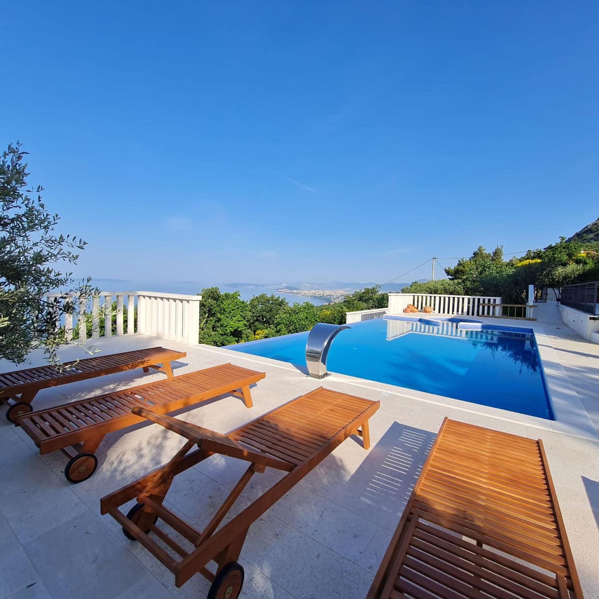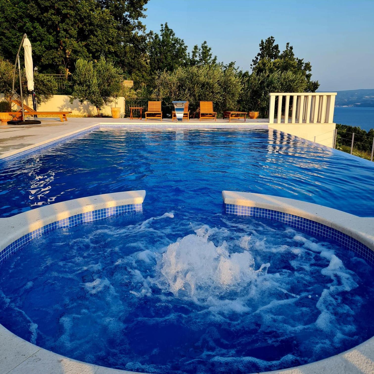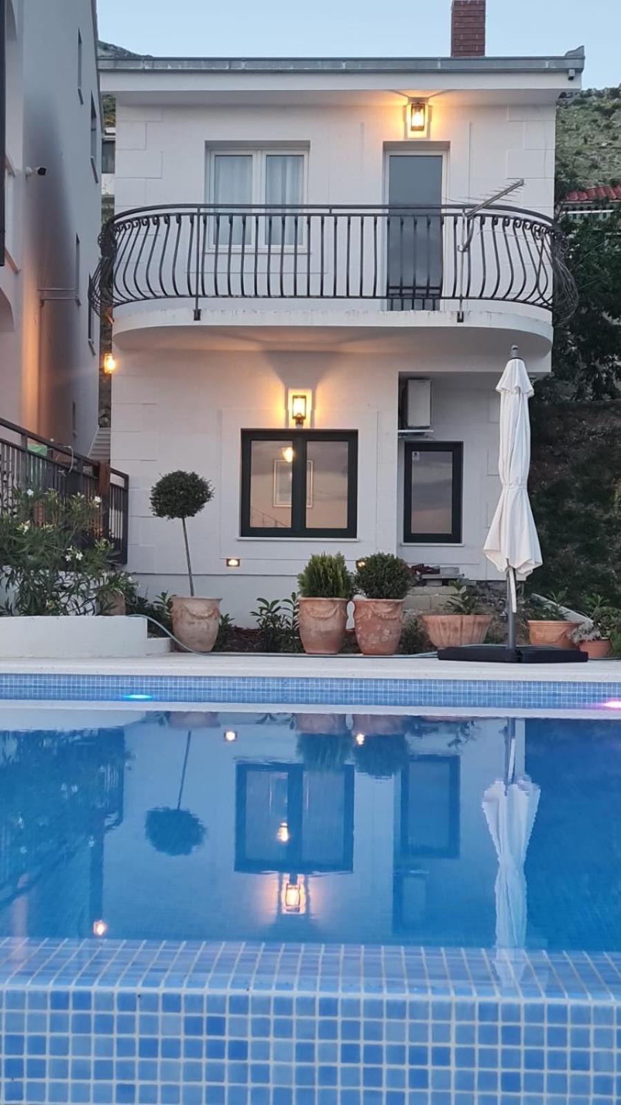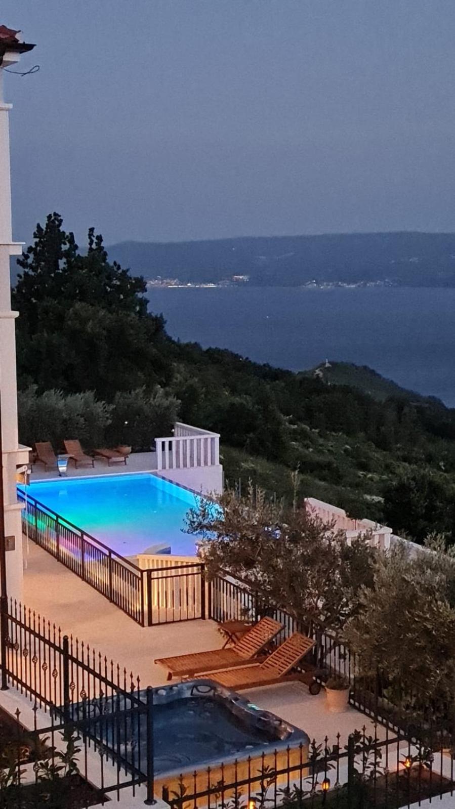 Experience the ultimate relaxation at Sea view Luxury Apart Hotel Villa Conte with its romantic SPA, infinity pool, and sauna. Savor the stunning views of both the mountains and pool while enjoying top-of-the-line amenities.