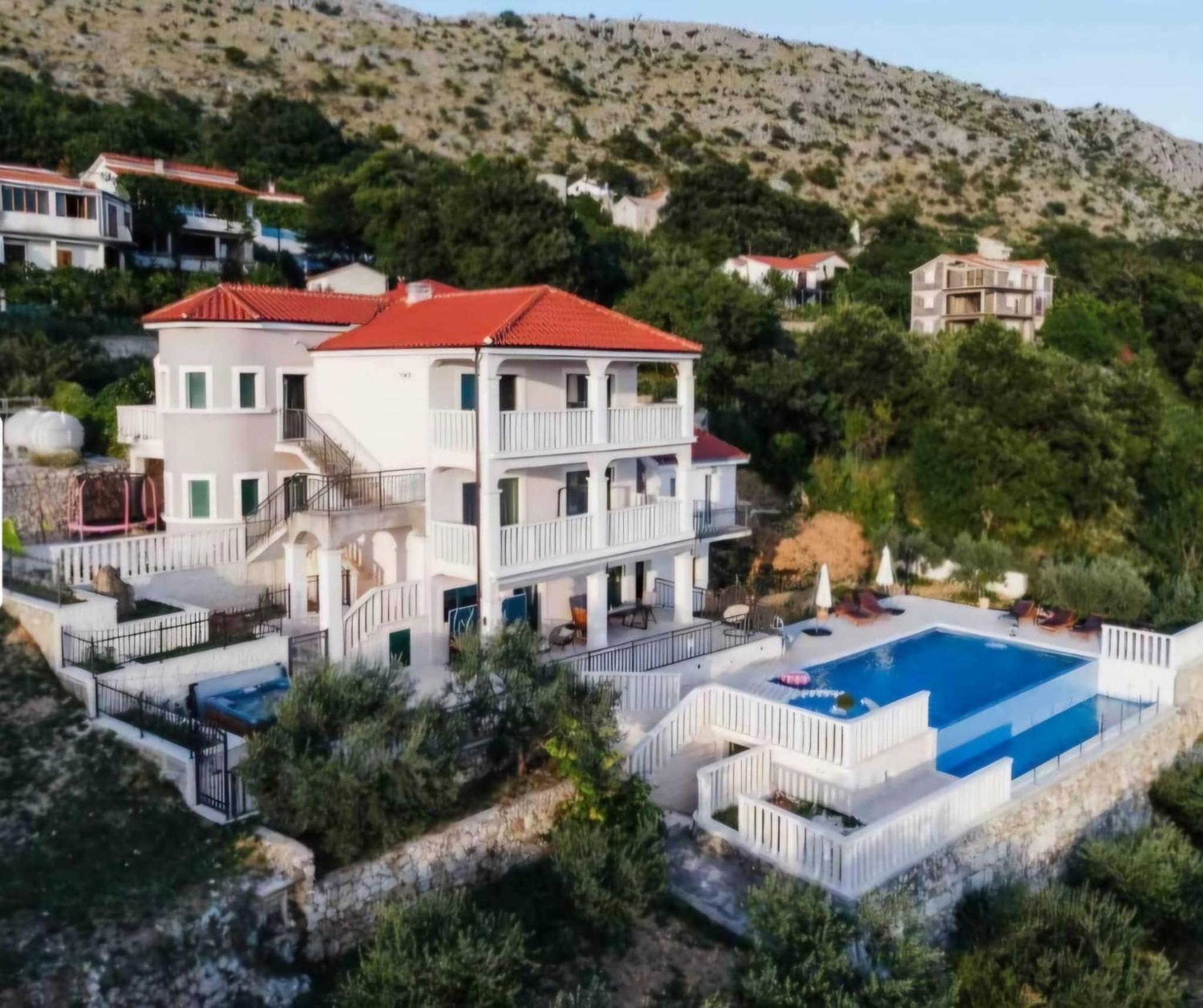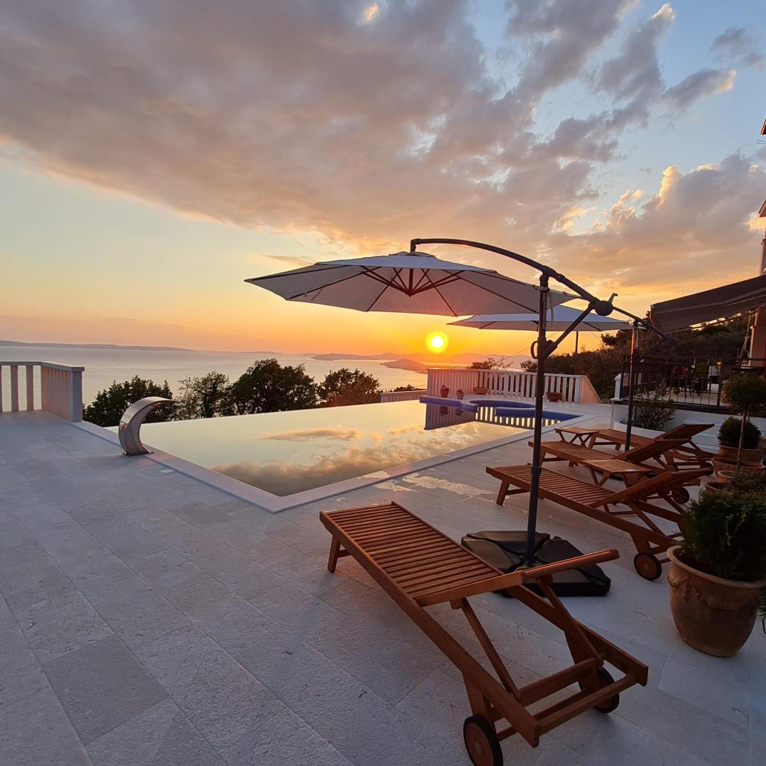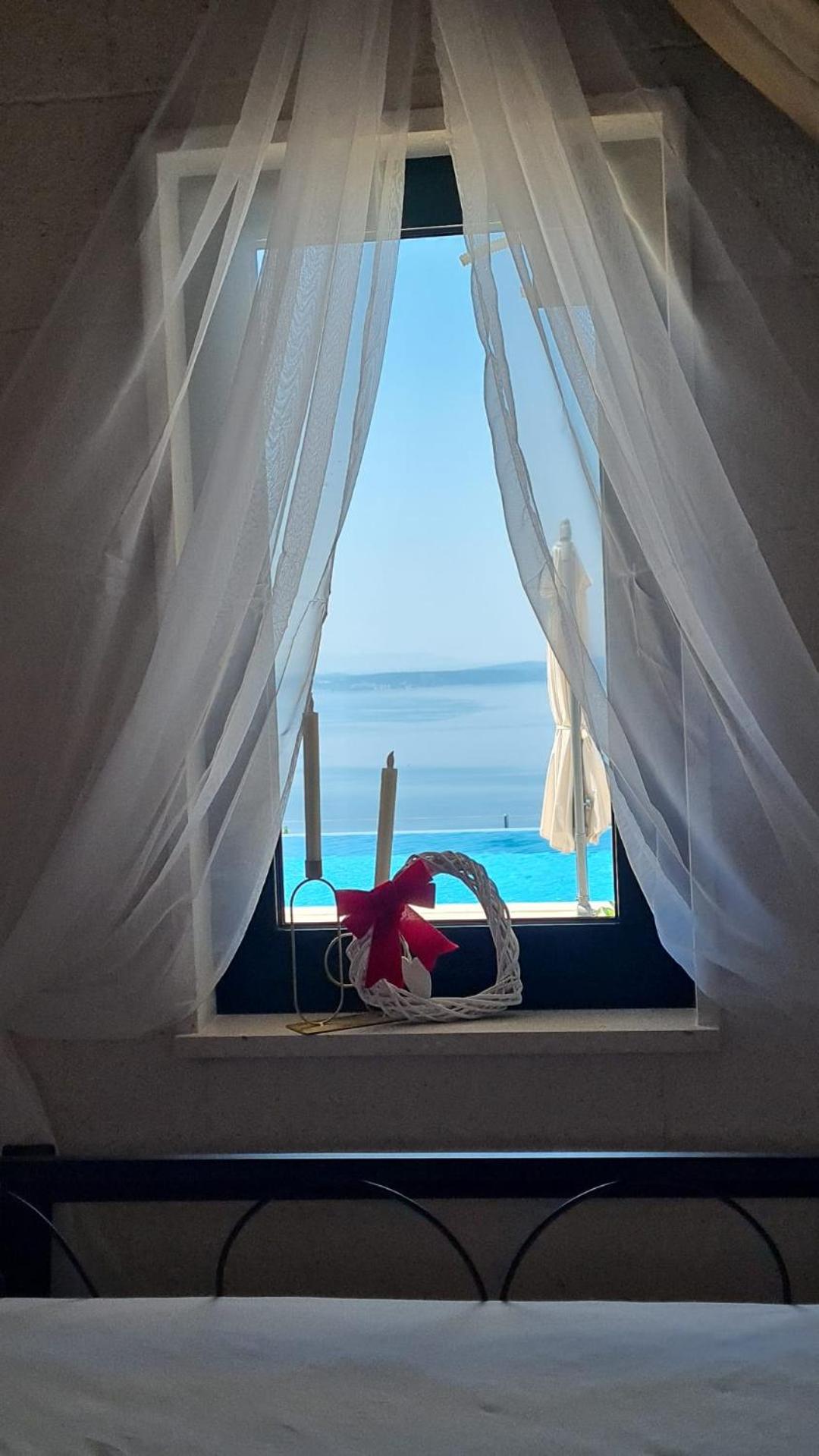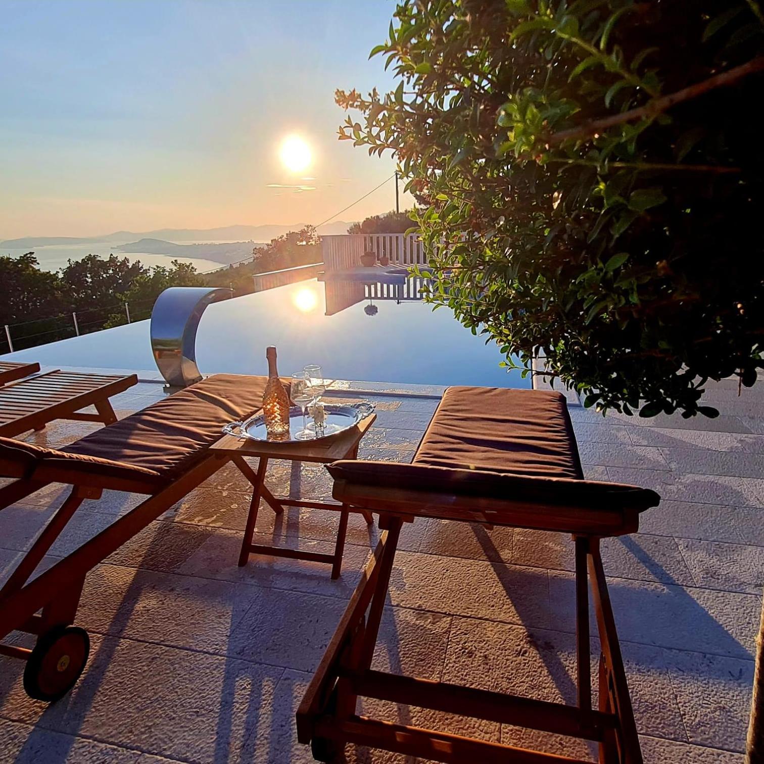 Experience the ultimate relaxation at Sea view Luxury Apart Hotel Villa Conte with its romantic SPA, infinity pool, and sauna. Savor the stunning views of both the mountains and pool while enjoying top-of-the-line amenities.