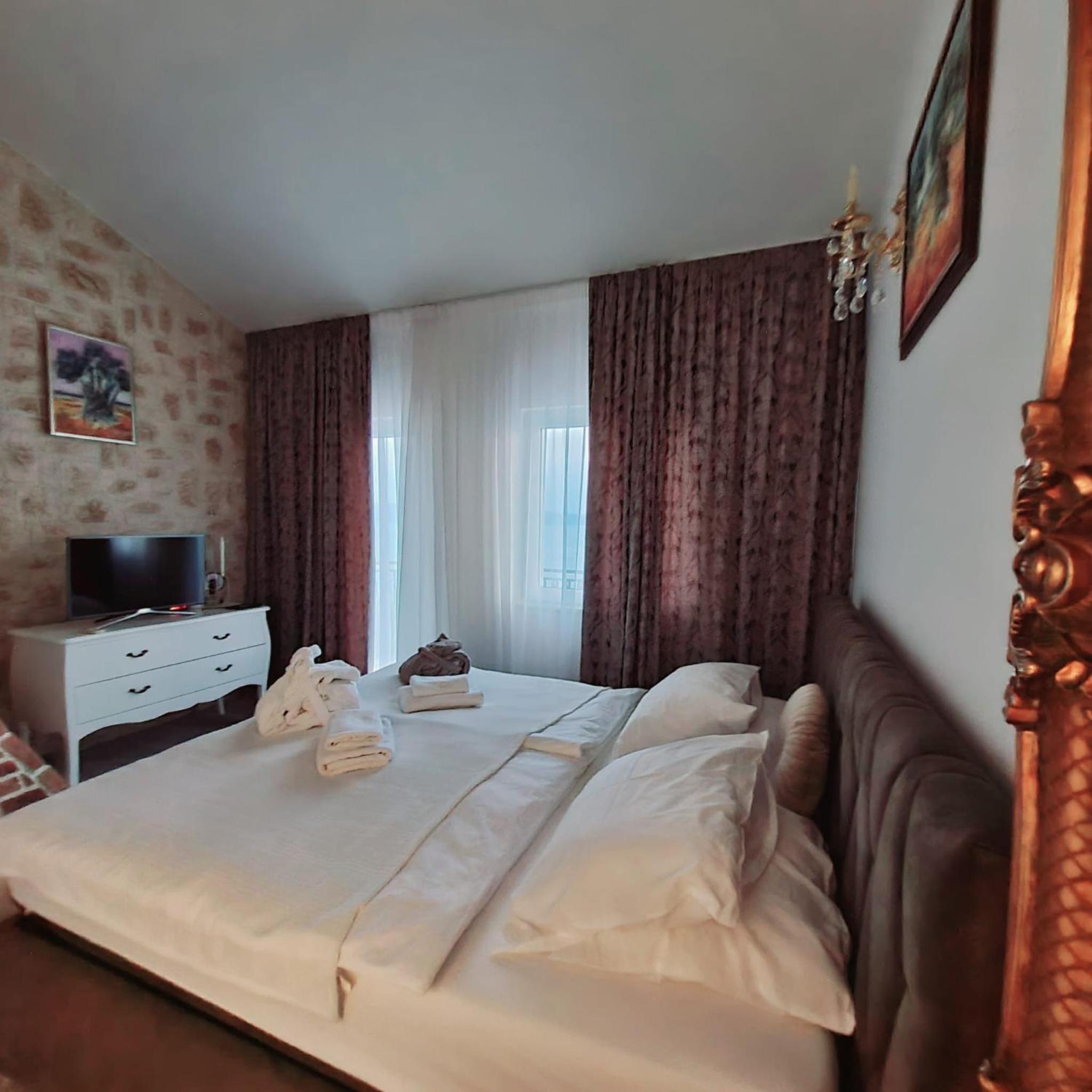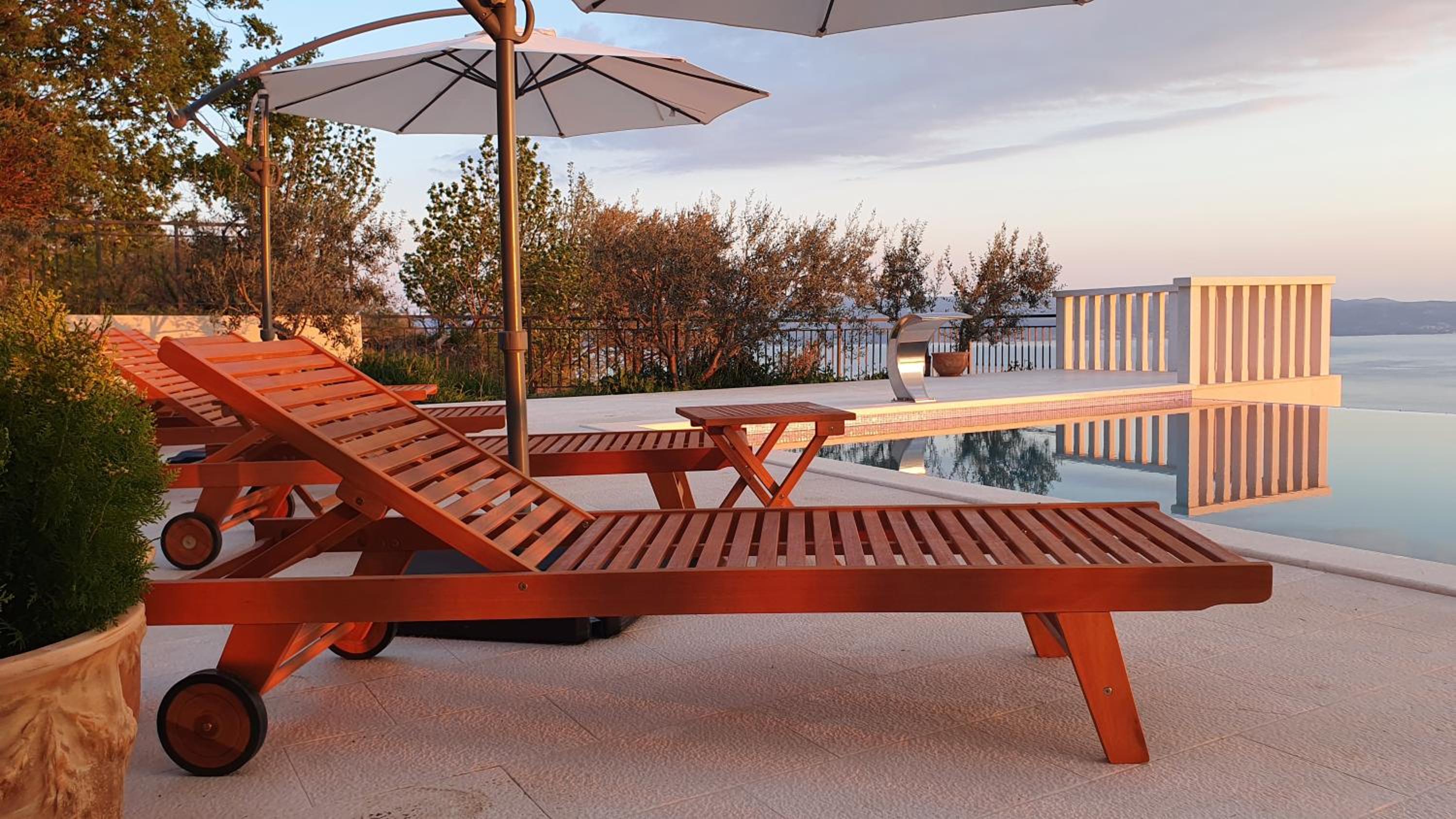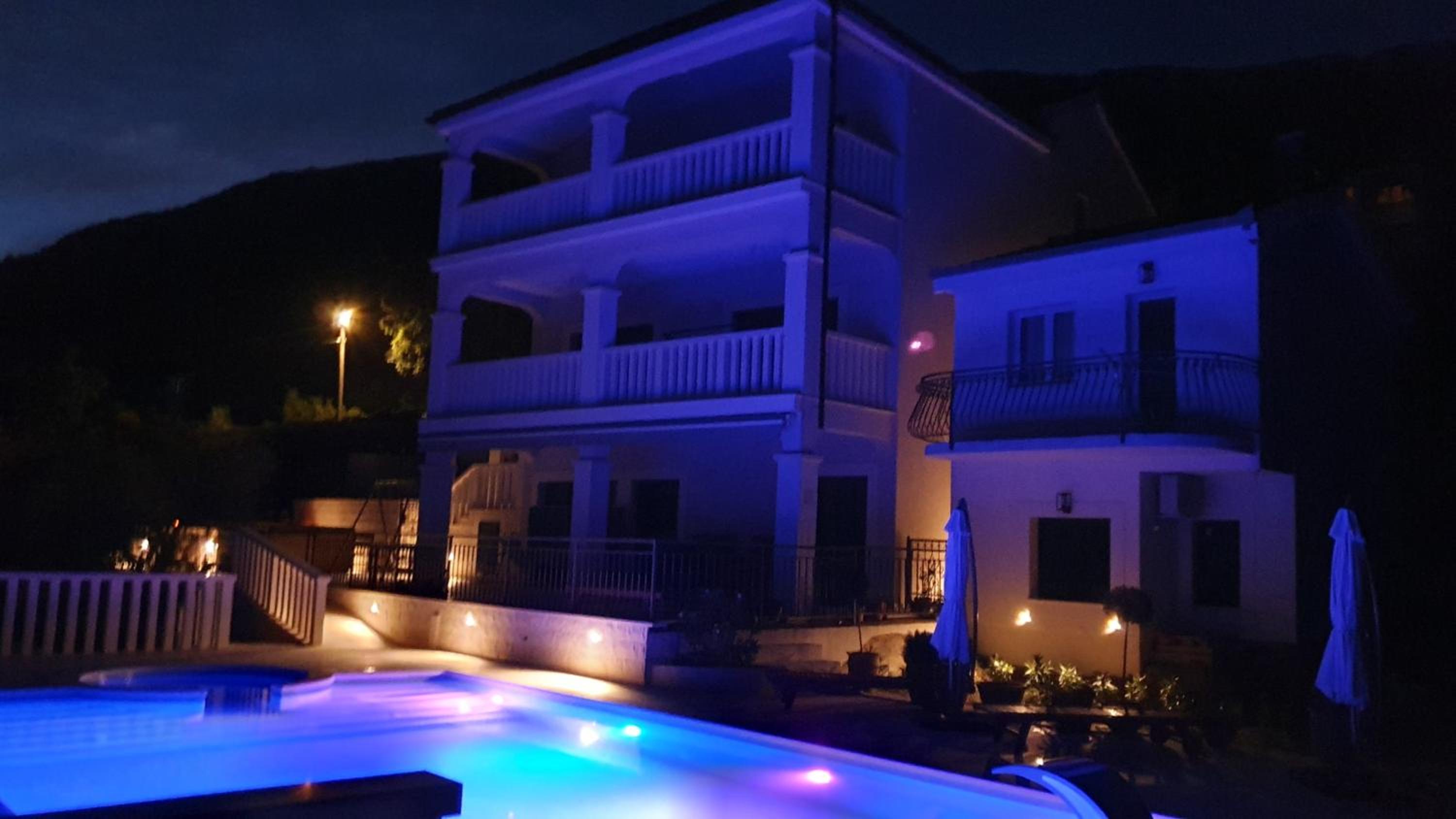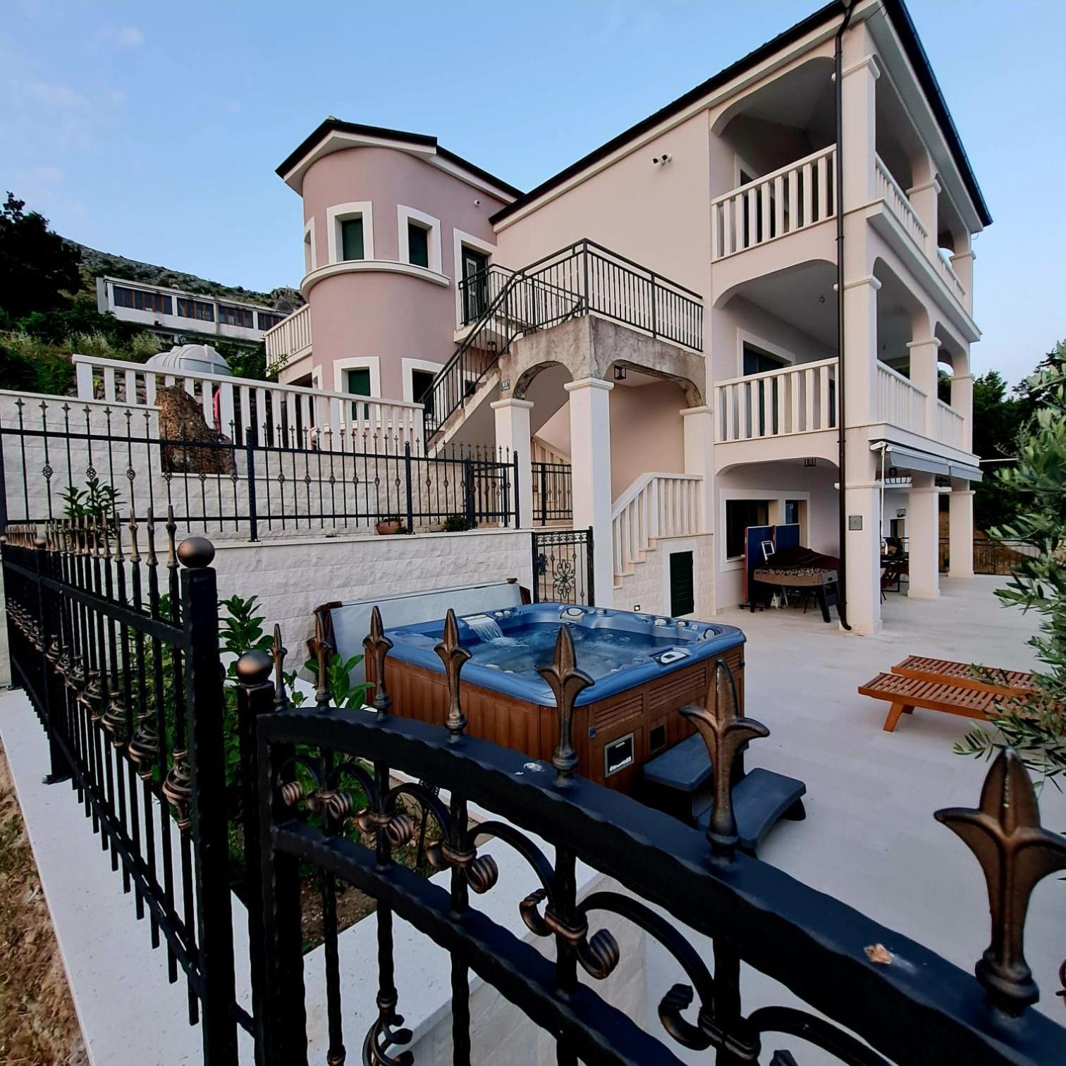 Experience the ultimate relaxation at Sea view Luxury Apart Hotel Villa Conte with its romantic SPA, infinity pool, and sauna. Savor the stunning views of both the mountains and pool while enjoying top-of-the-line amenities.