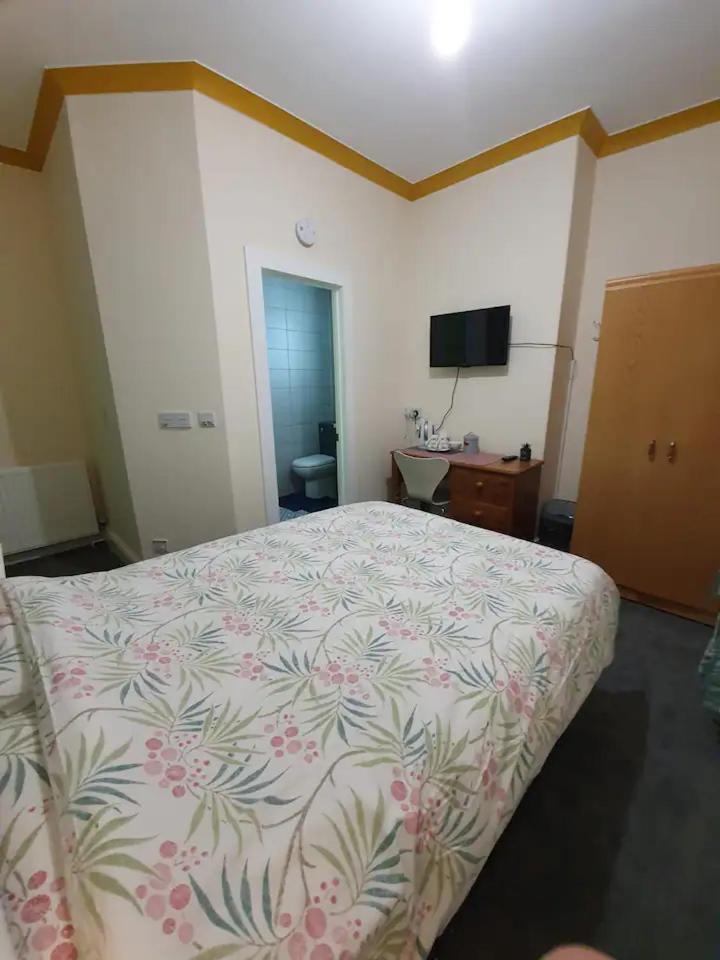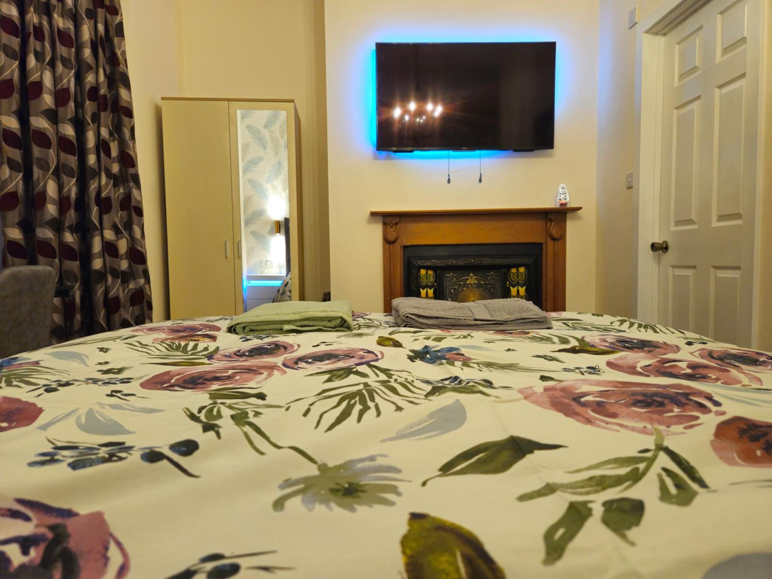A beautiful original fire place made a gorgeous feature in our room and a large television was above this.