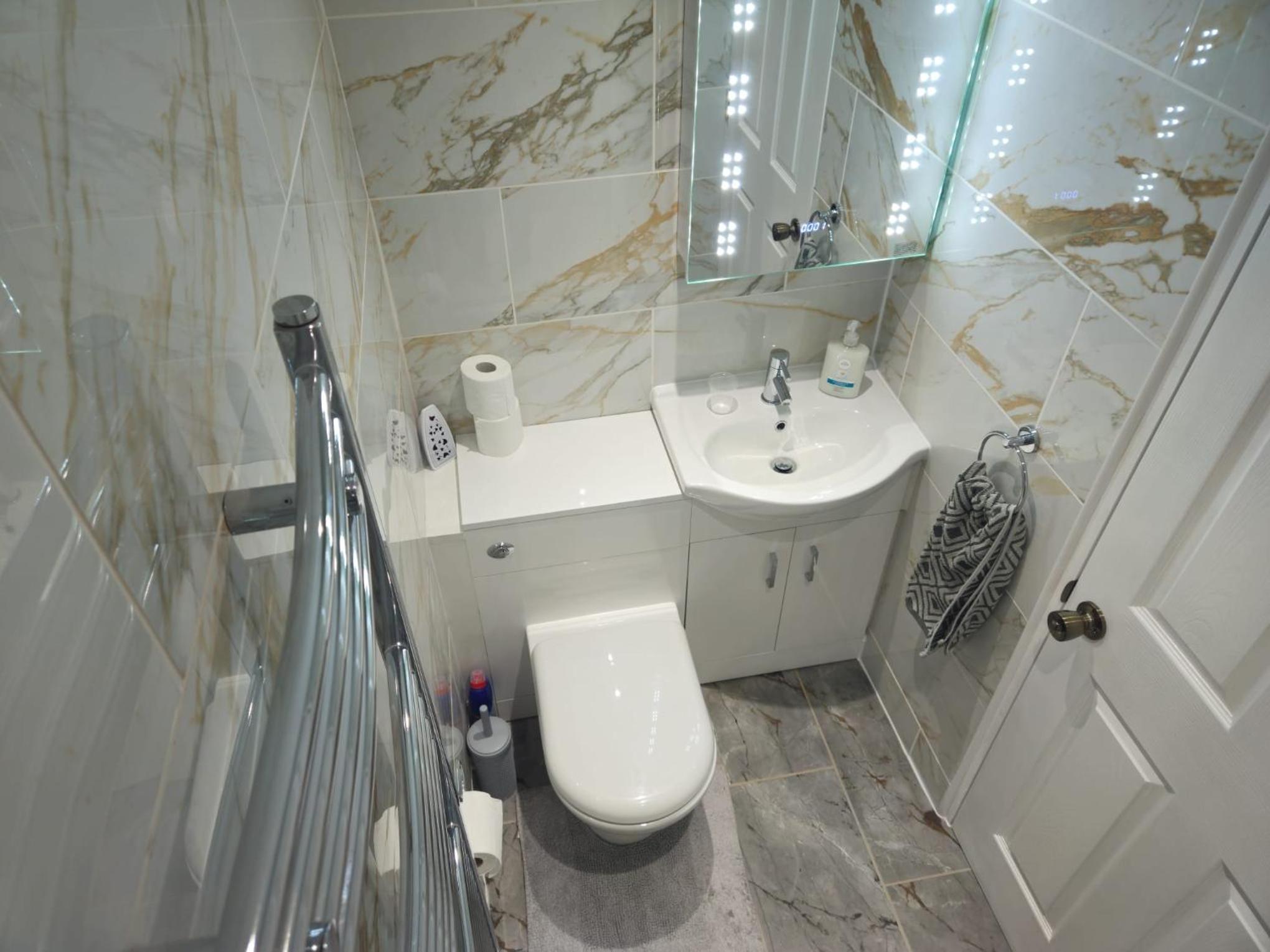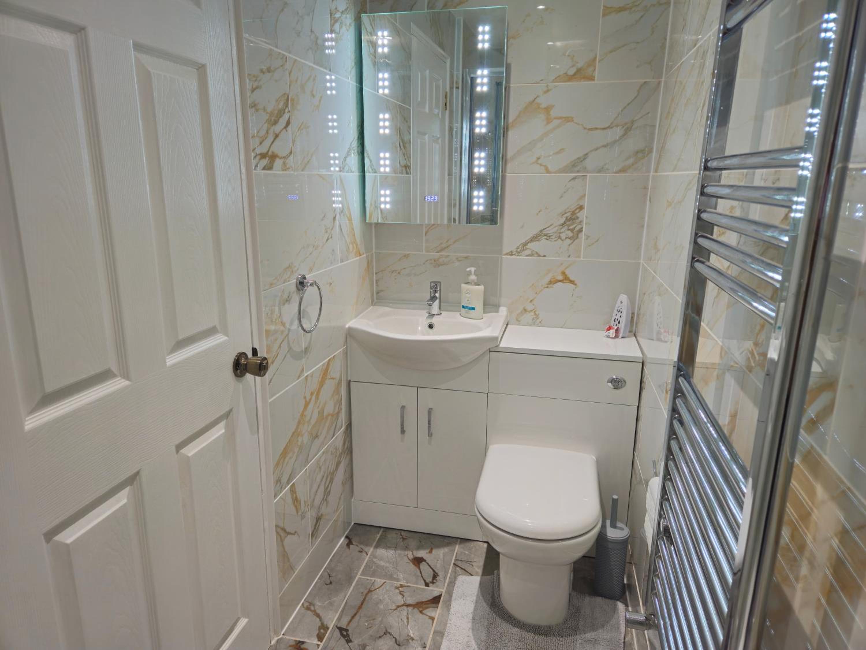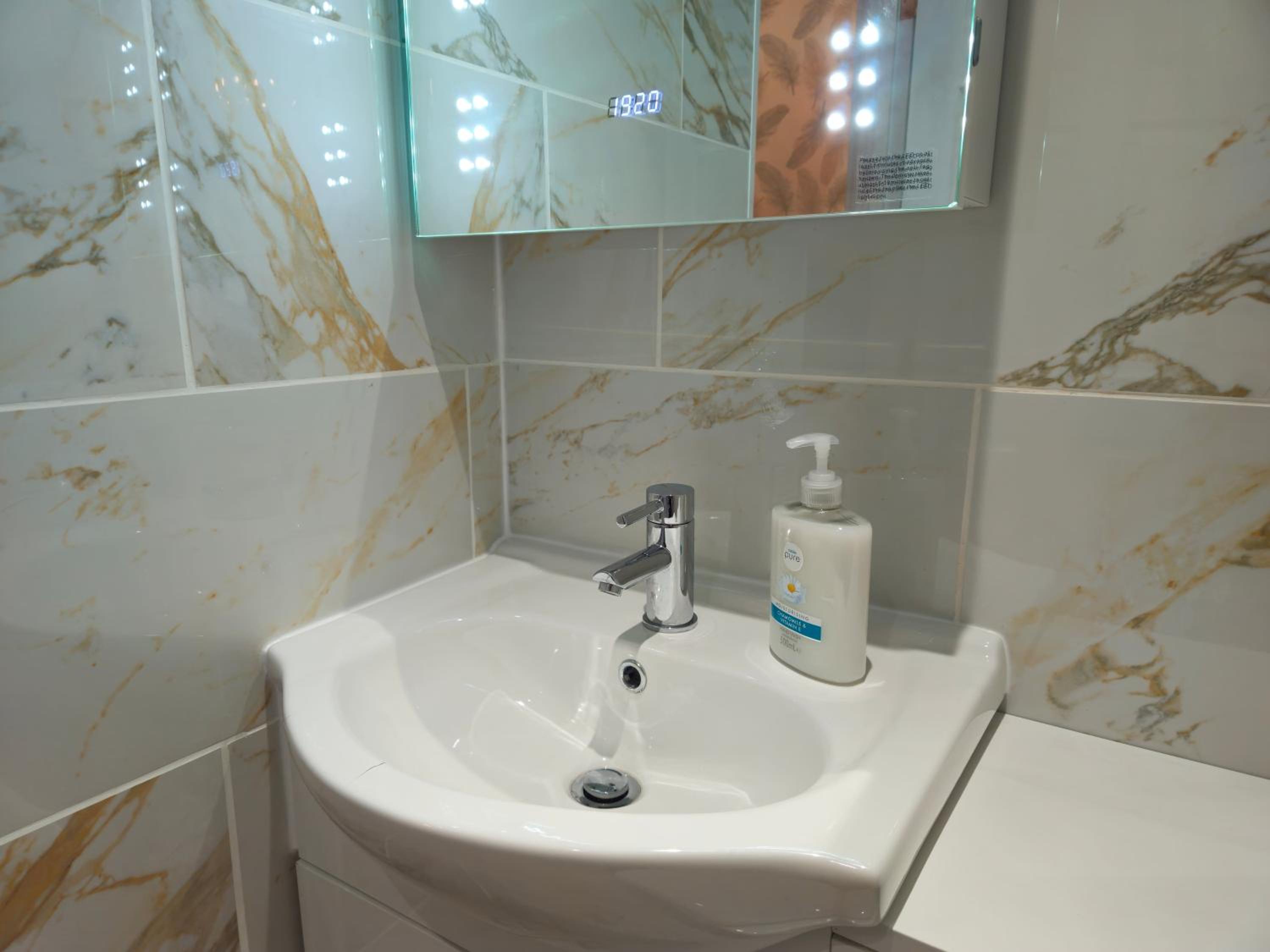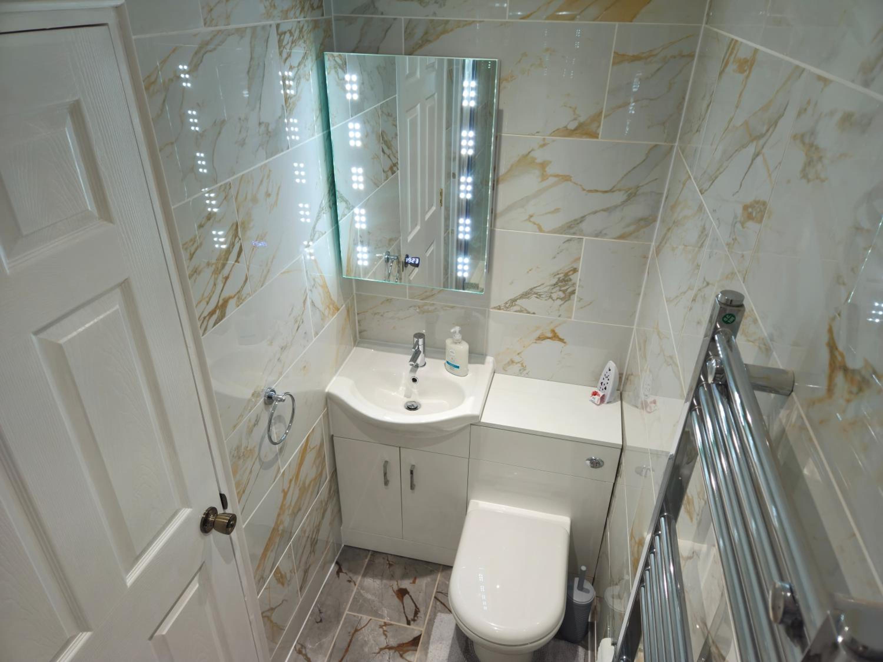 A touch light vanity unit with the time on was in the bathroom, just wave your hand under and it comes on.