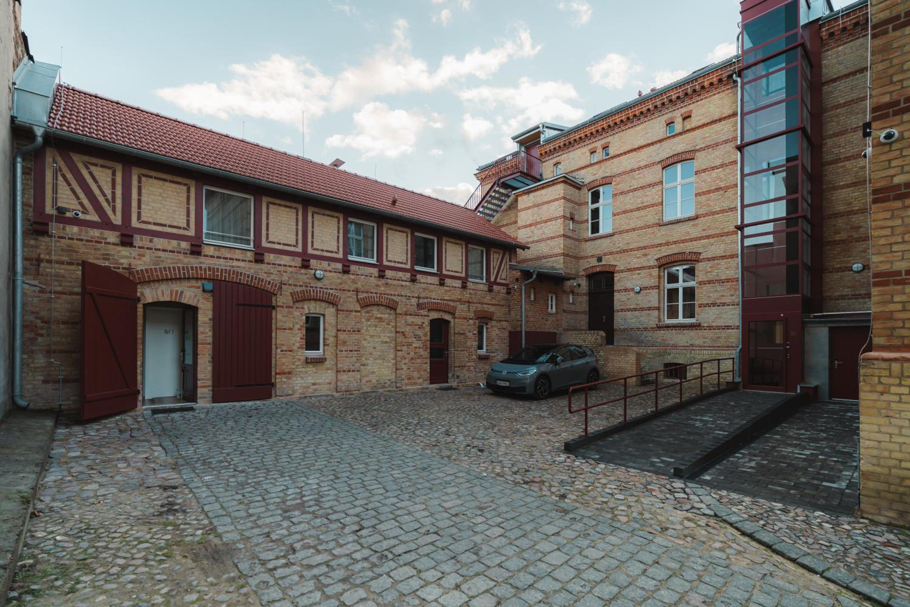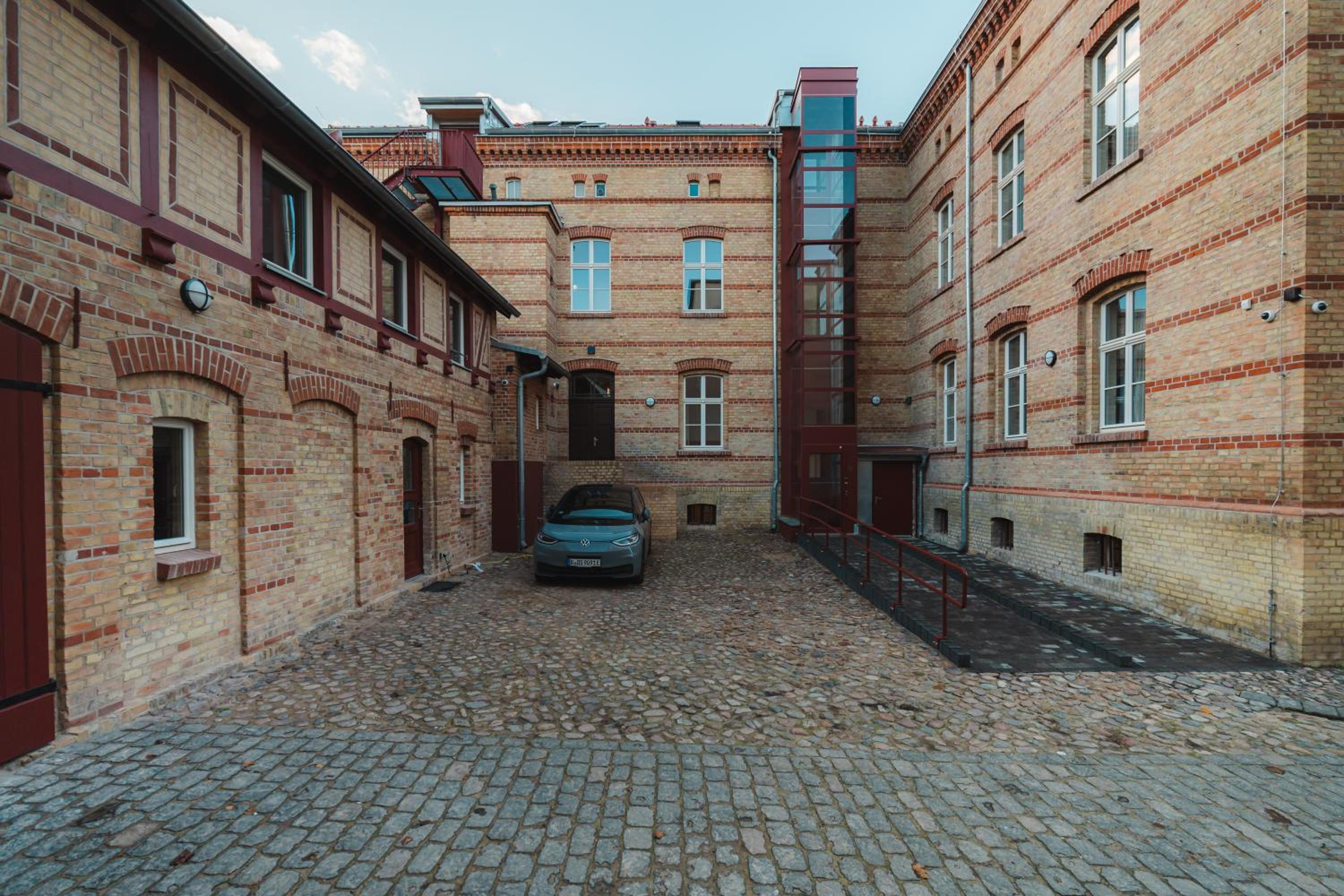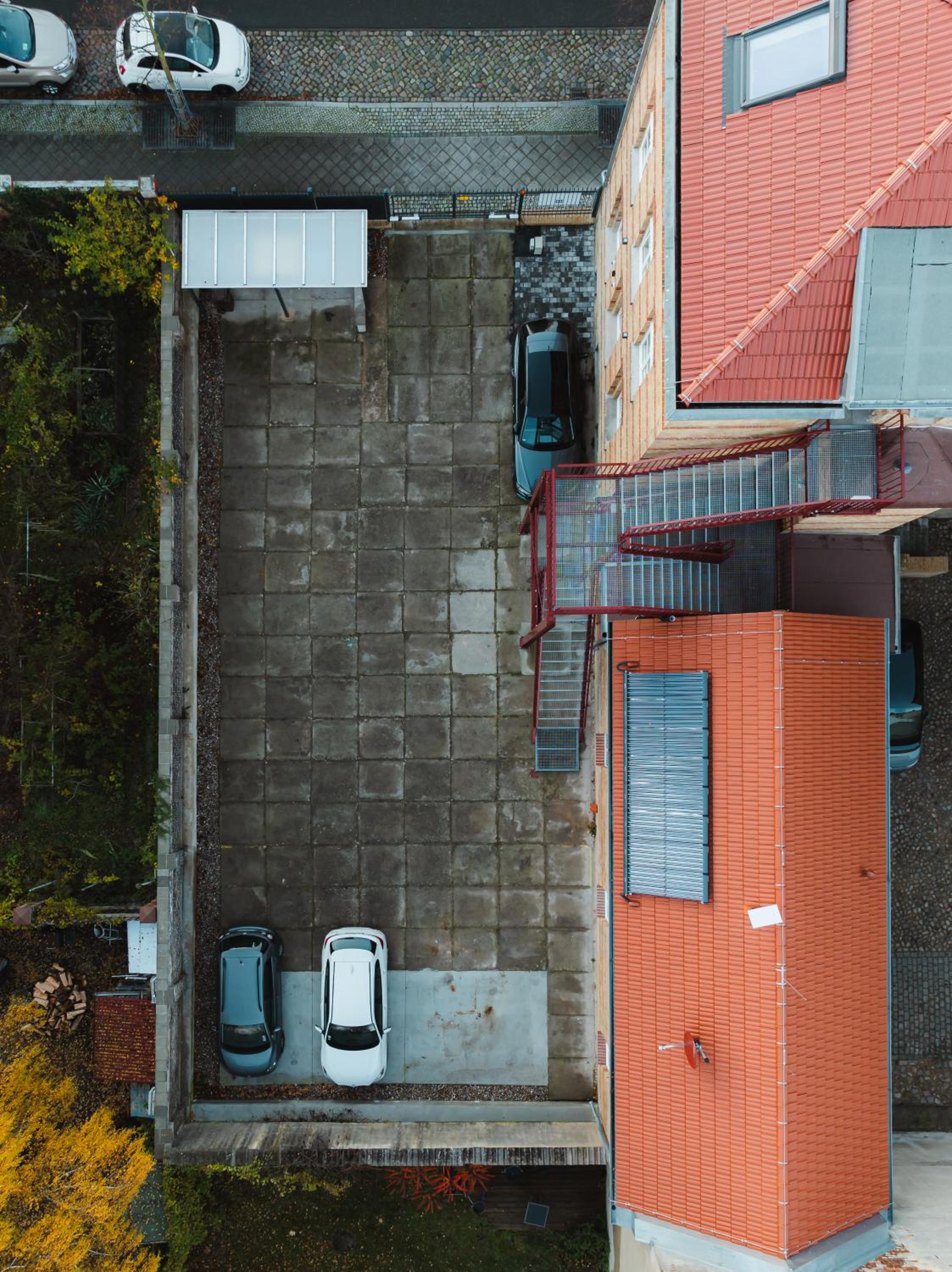 Parkplätze sind für mehrere SUV eingeschränkt anzufahren wegen er rettungstreppe.