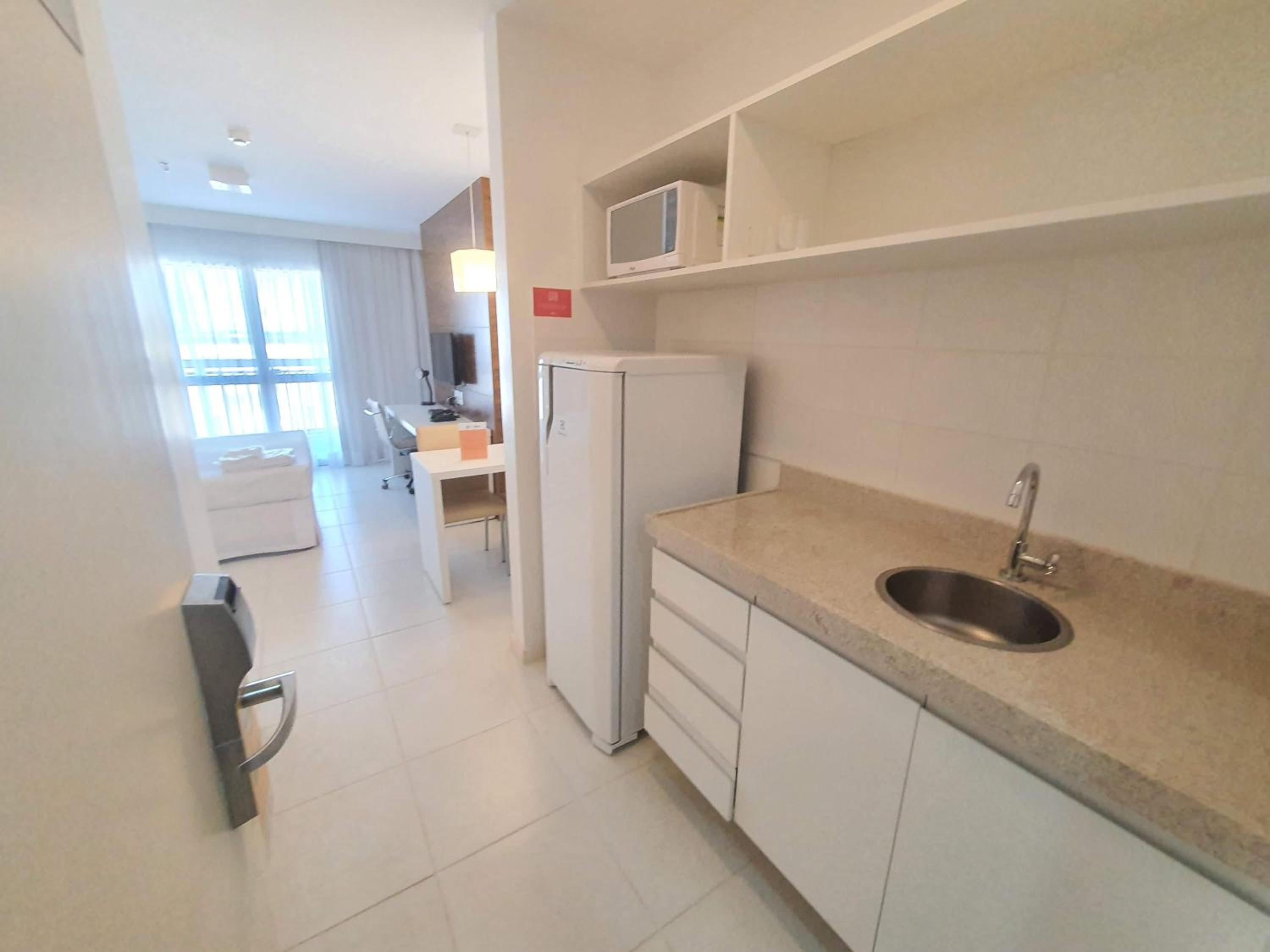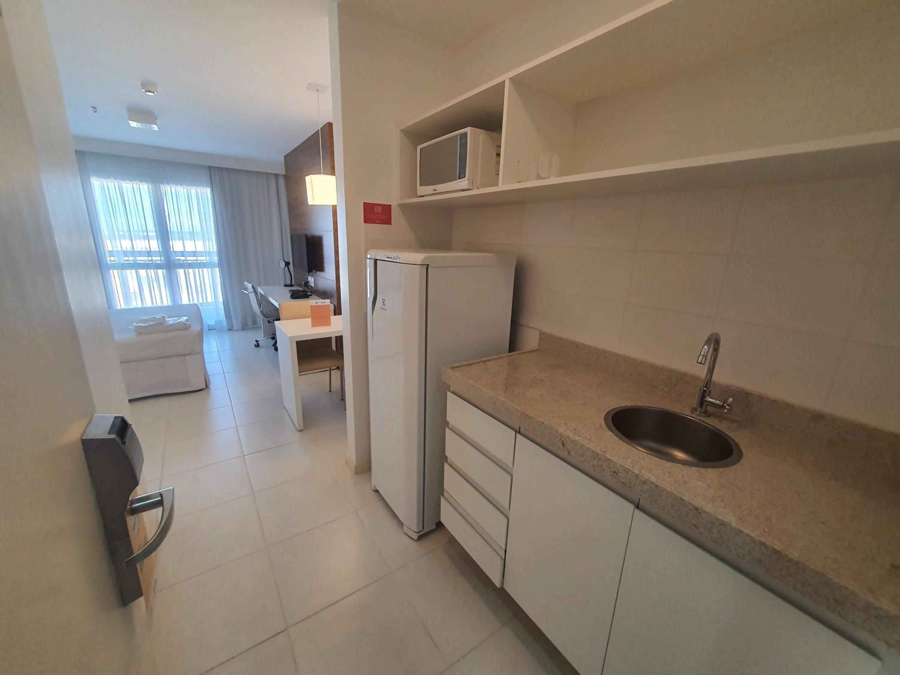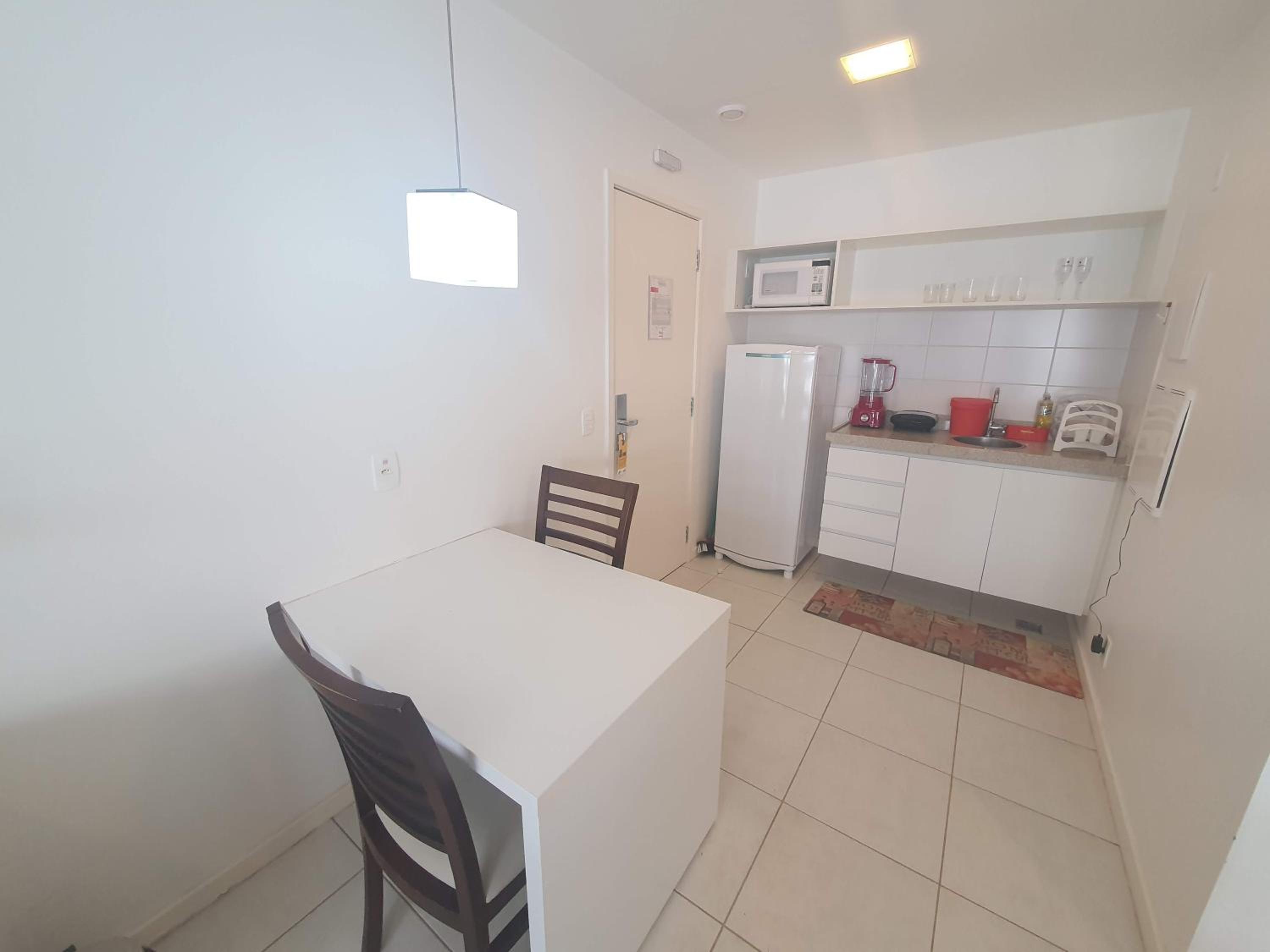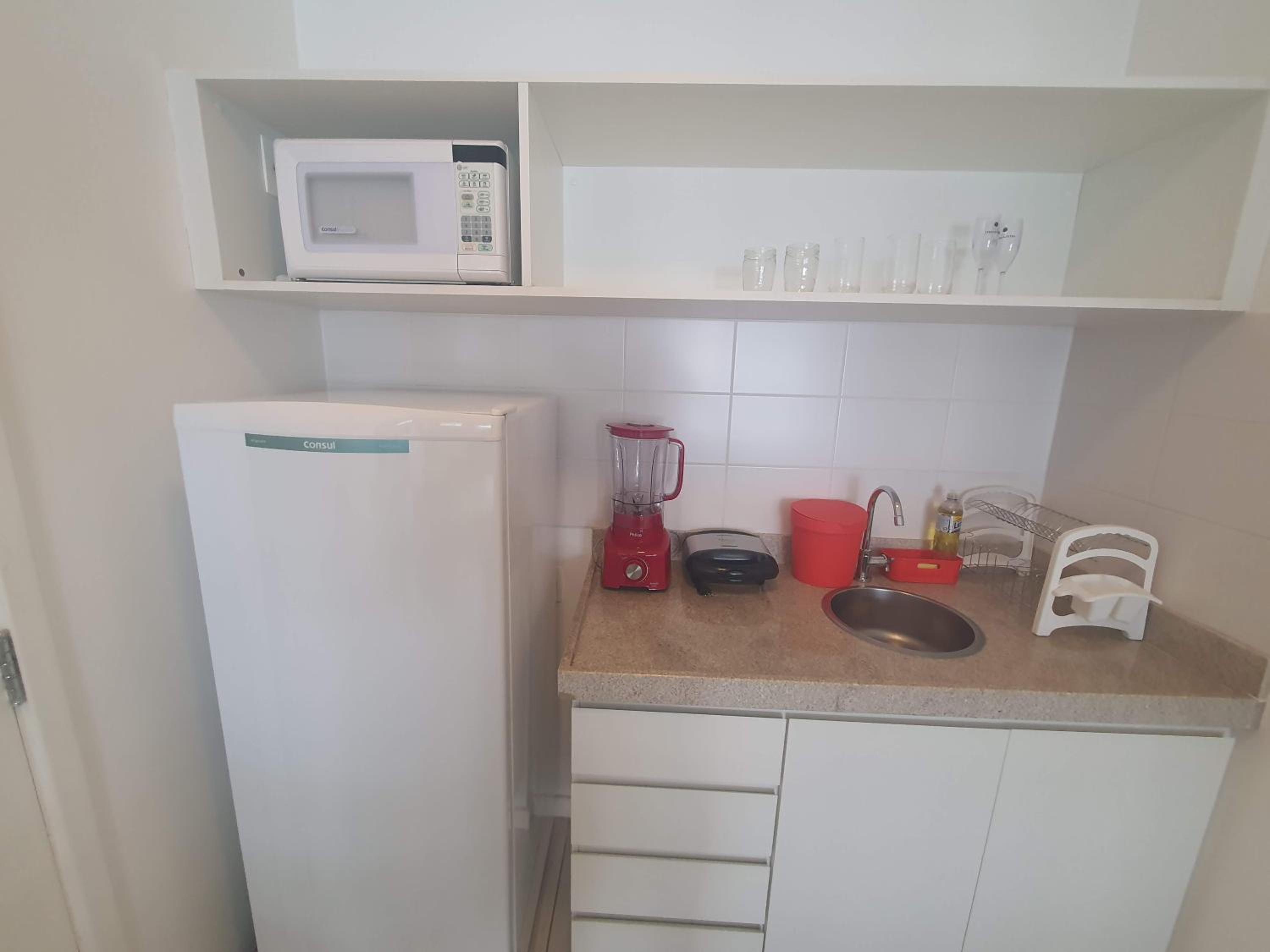 Flat completo com eletrodomésticos disponíveis para uso.