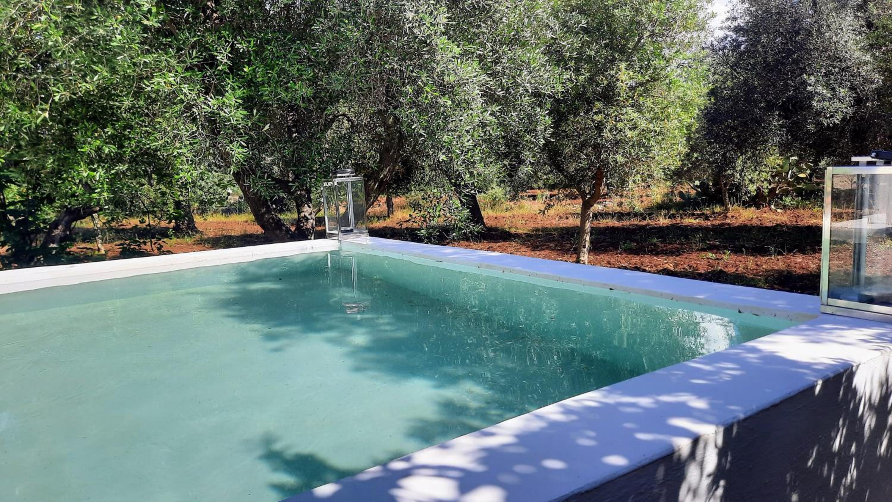 Experience breathtaking views of the surrounding landscape from the pool and terrace at Casa Trullo Bianco: Casa Limone. Relax on the patio while enjoying the serene garden views.