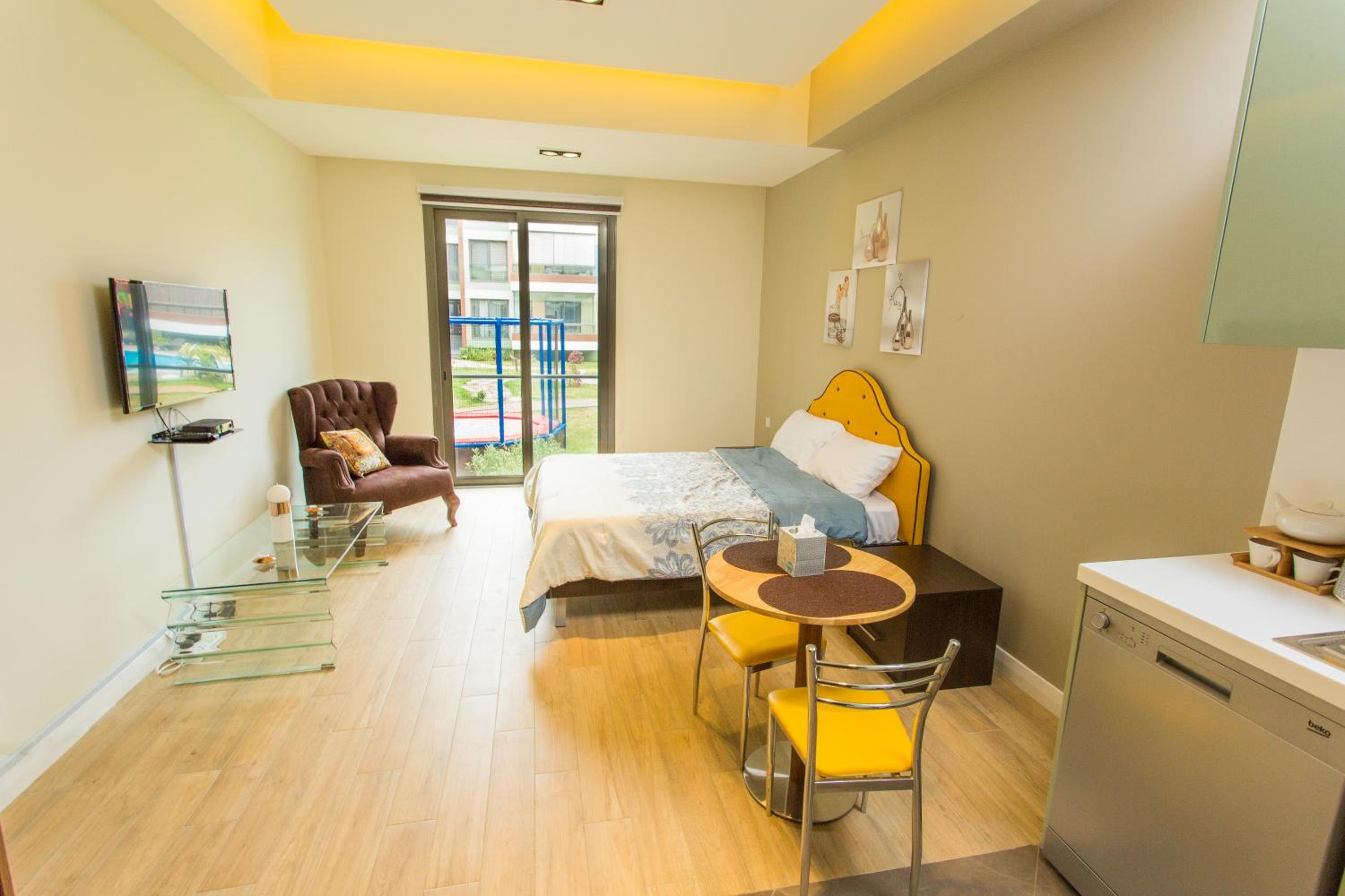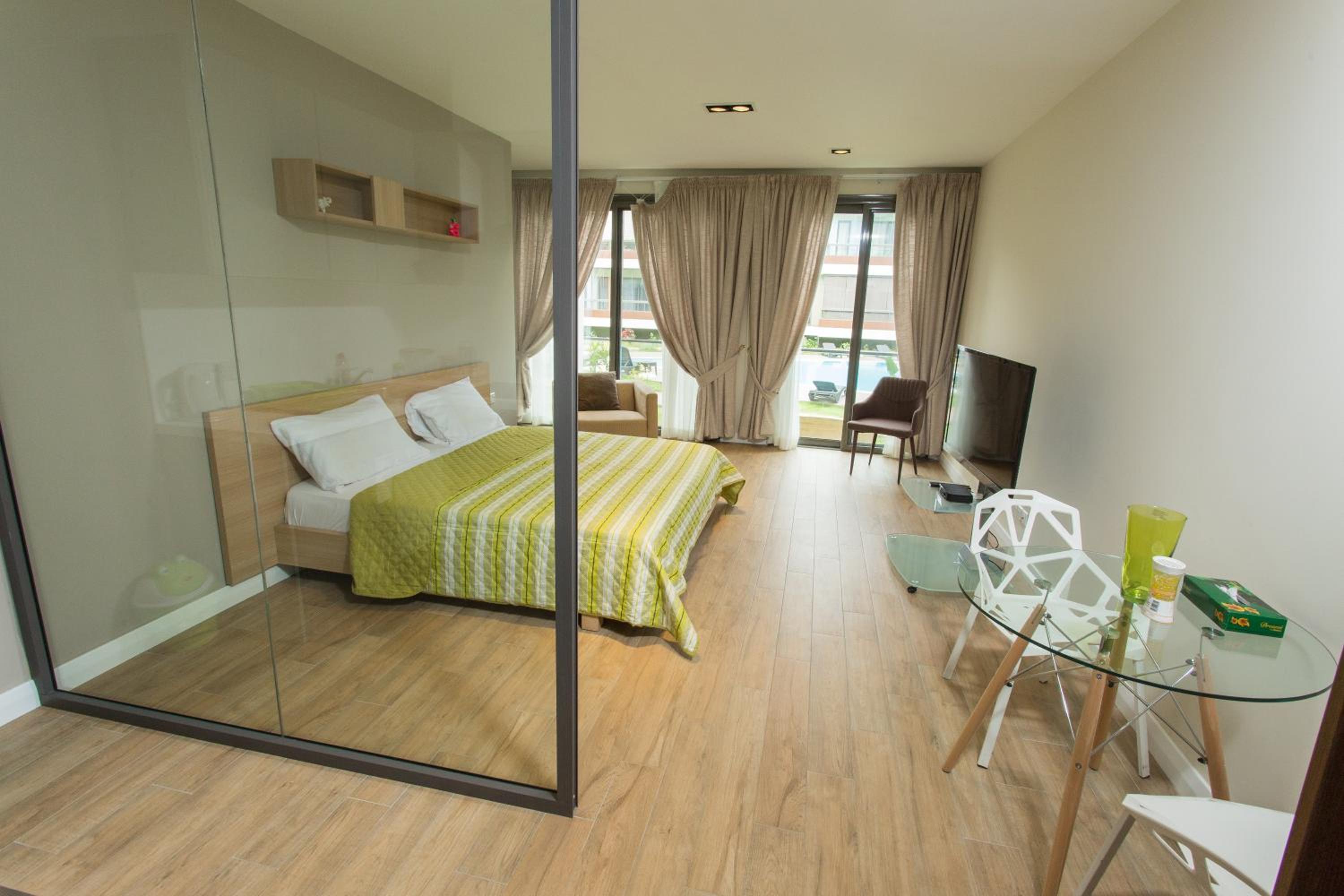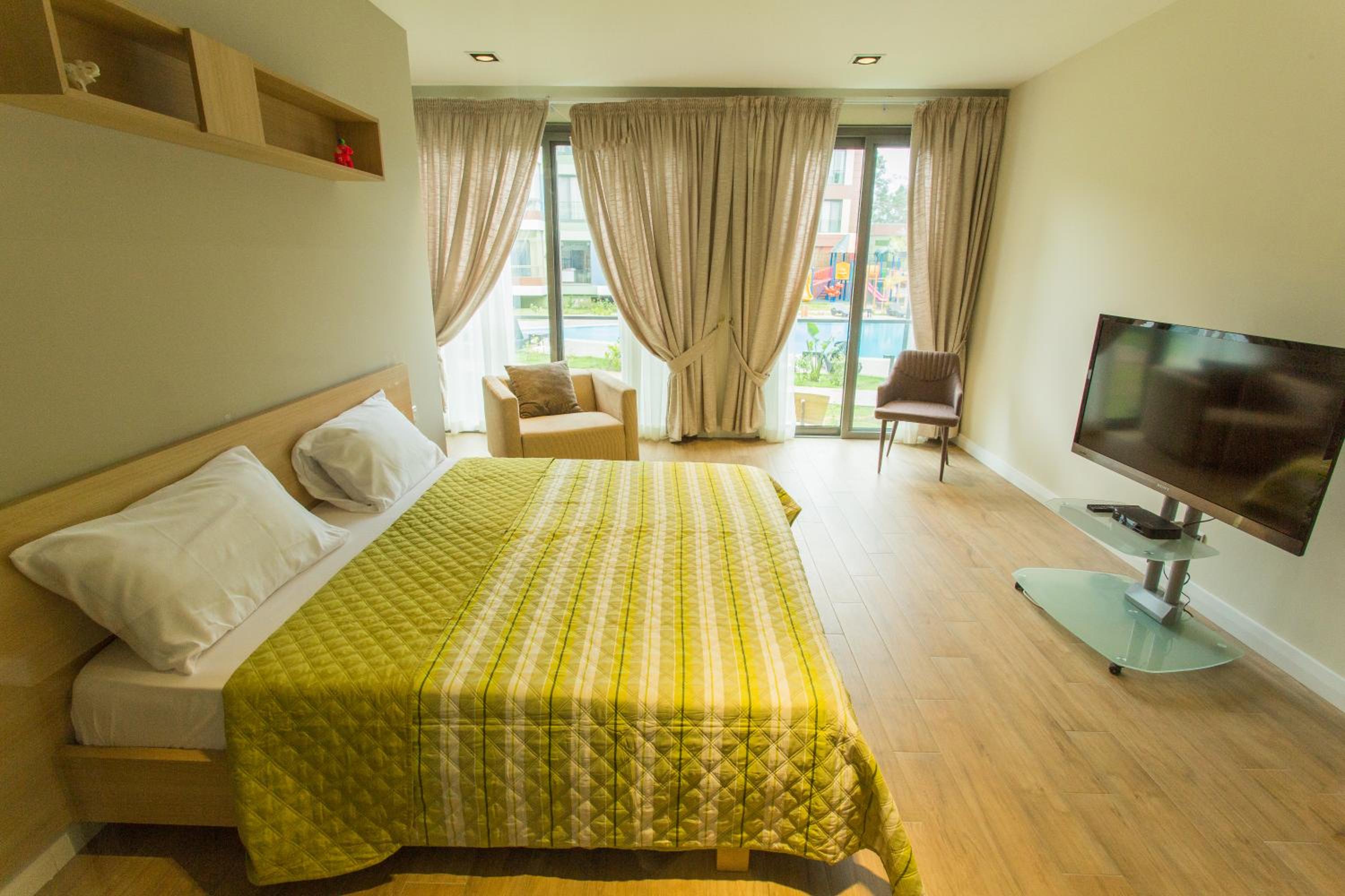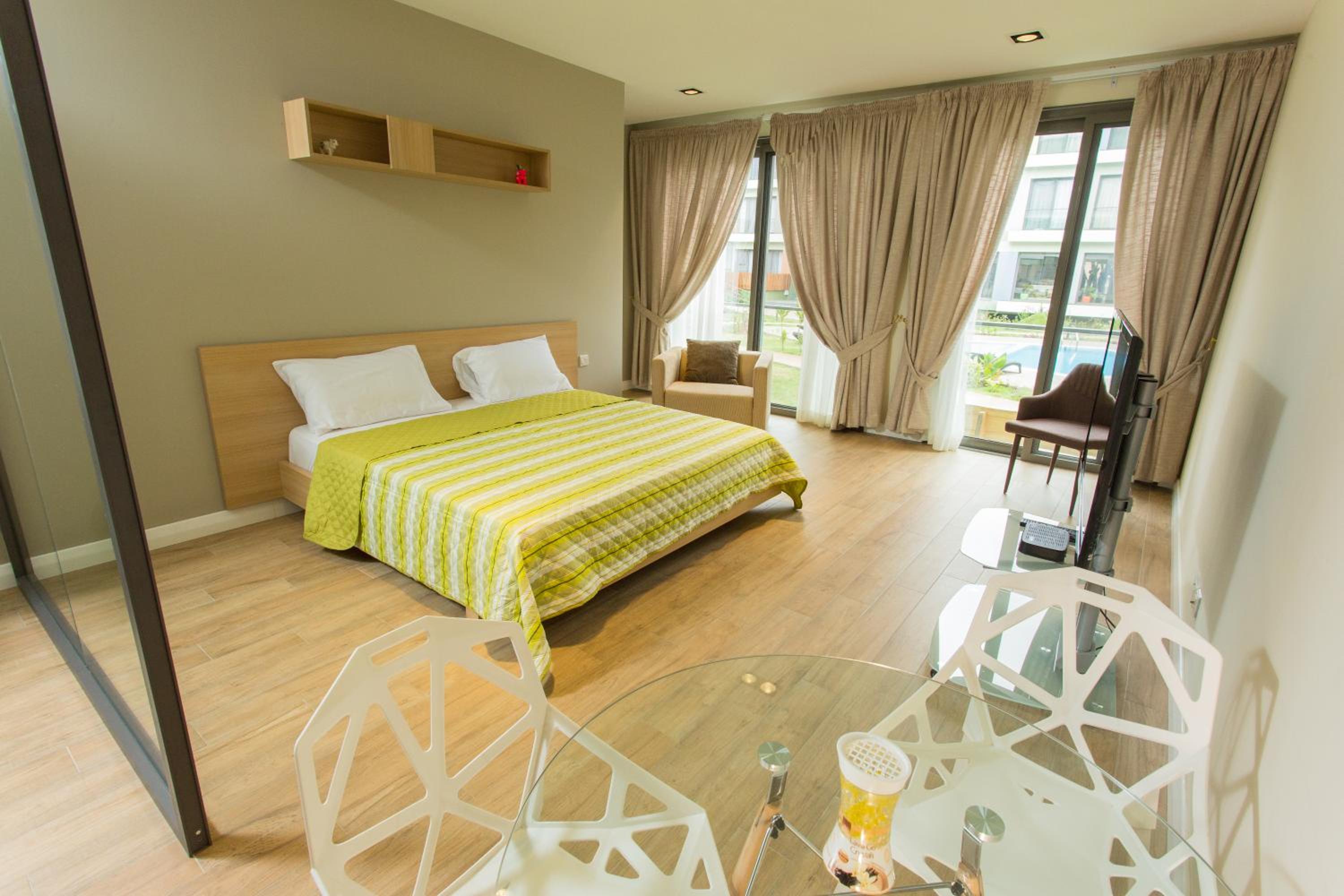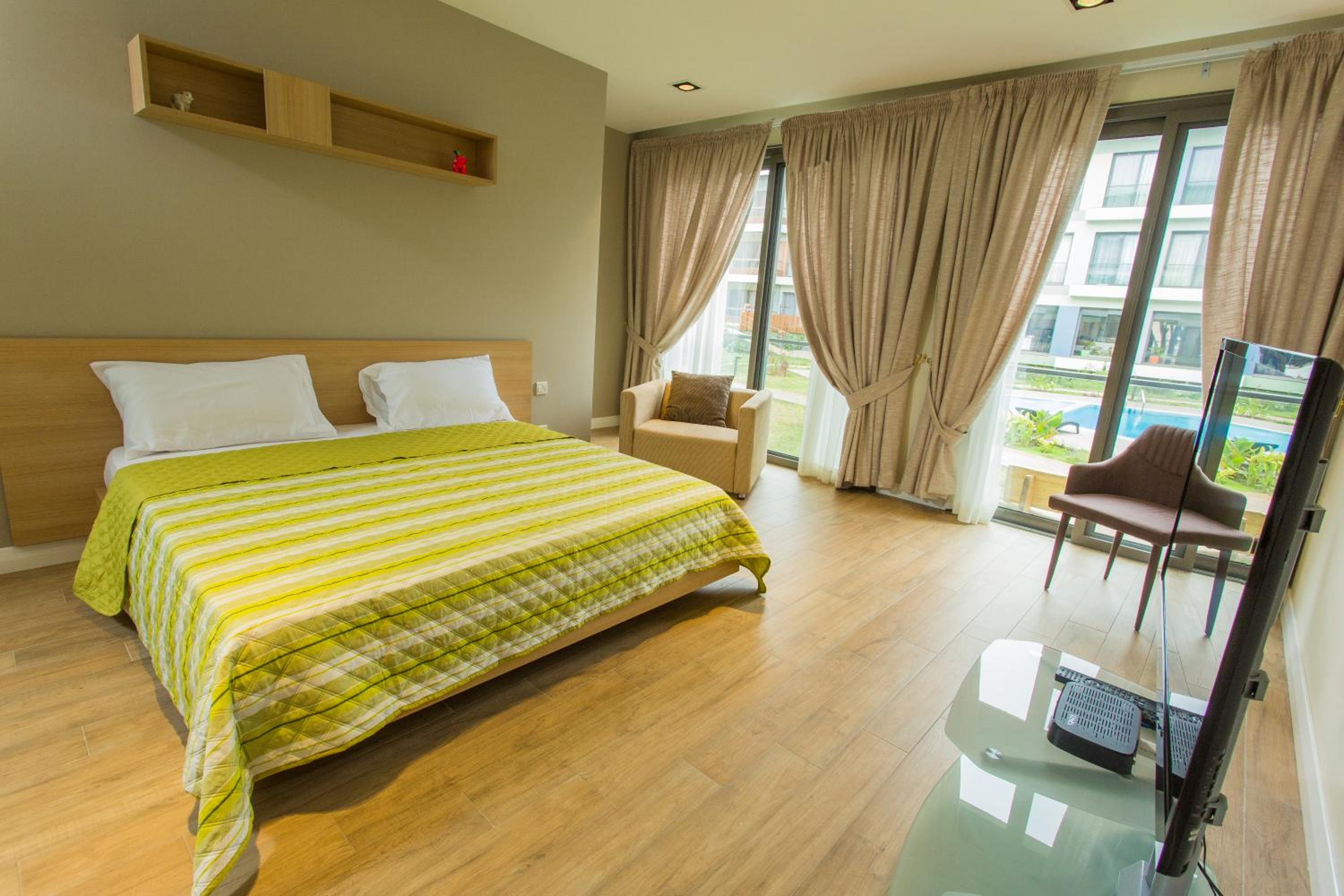 Sustainable Comfort: Enjoy air-conditioned units with modern amenities like a coffee machine, oven, and flat-screen TV. Relax on the balcony with garden views or take a dip in the outdoor pool.