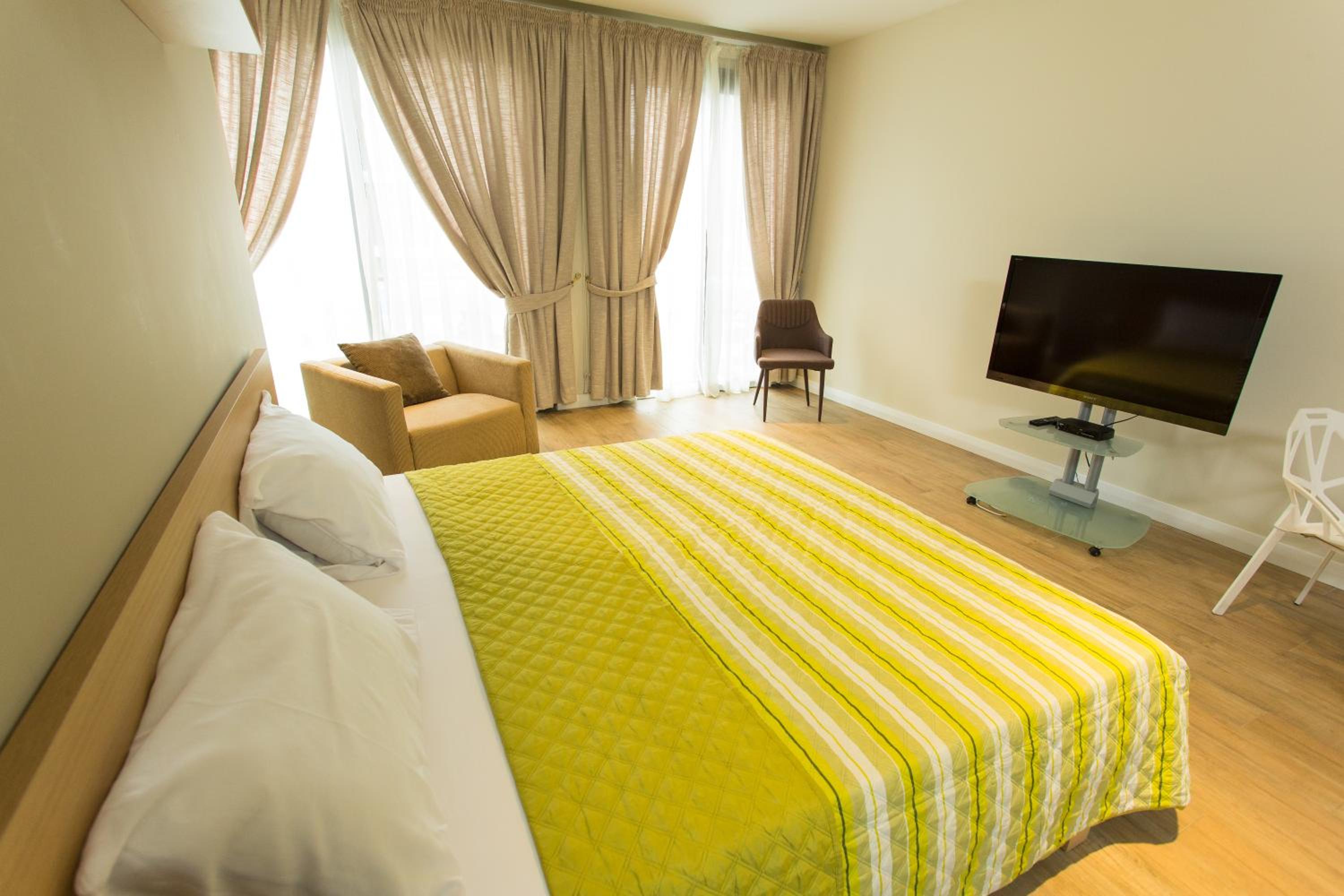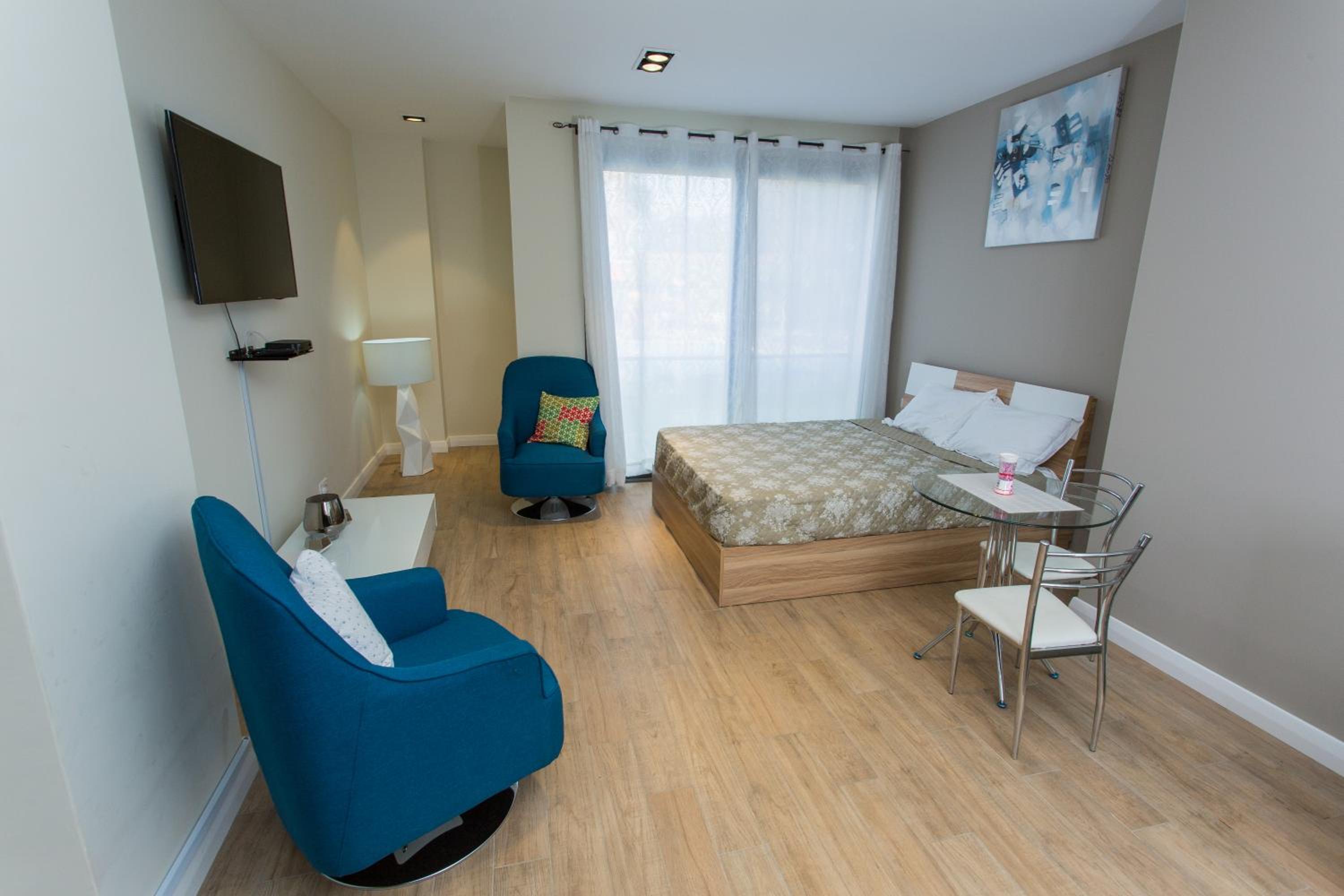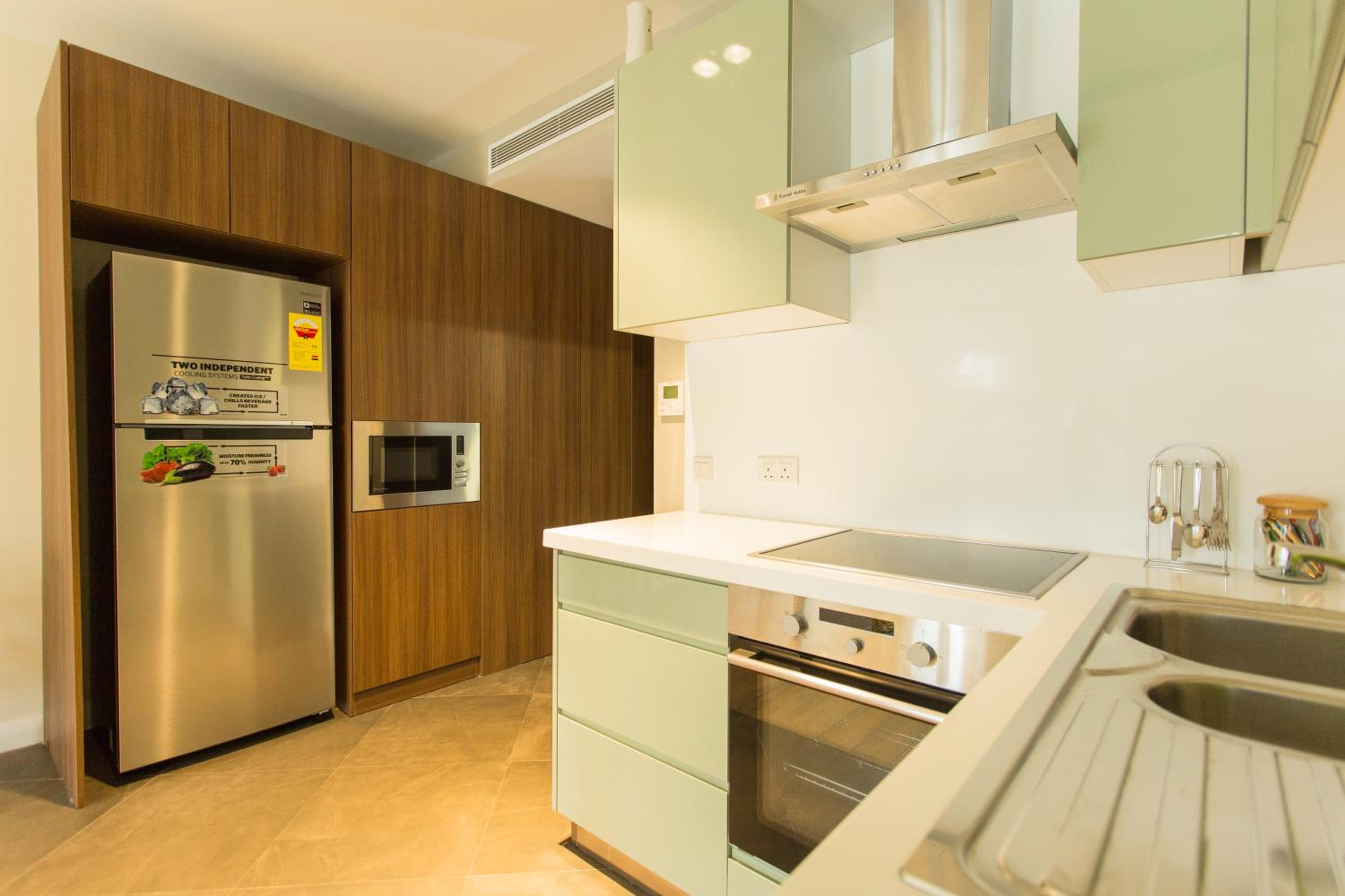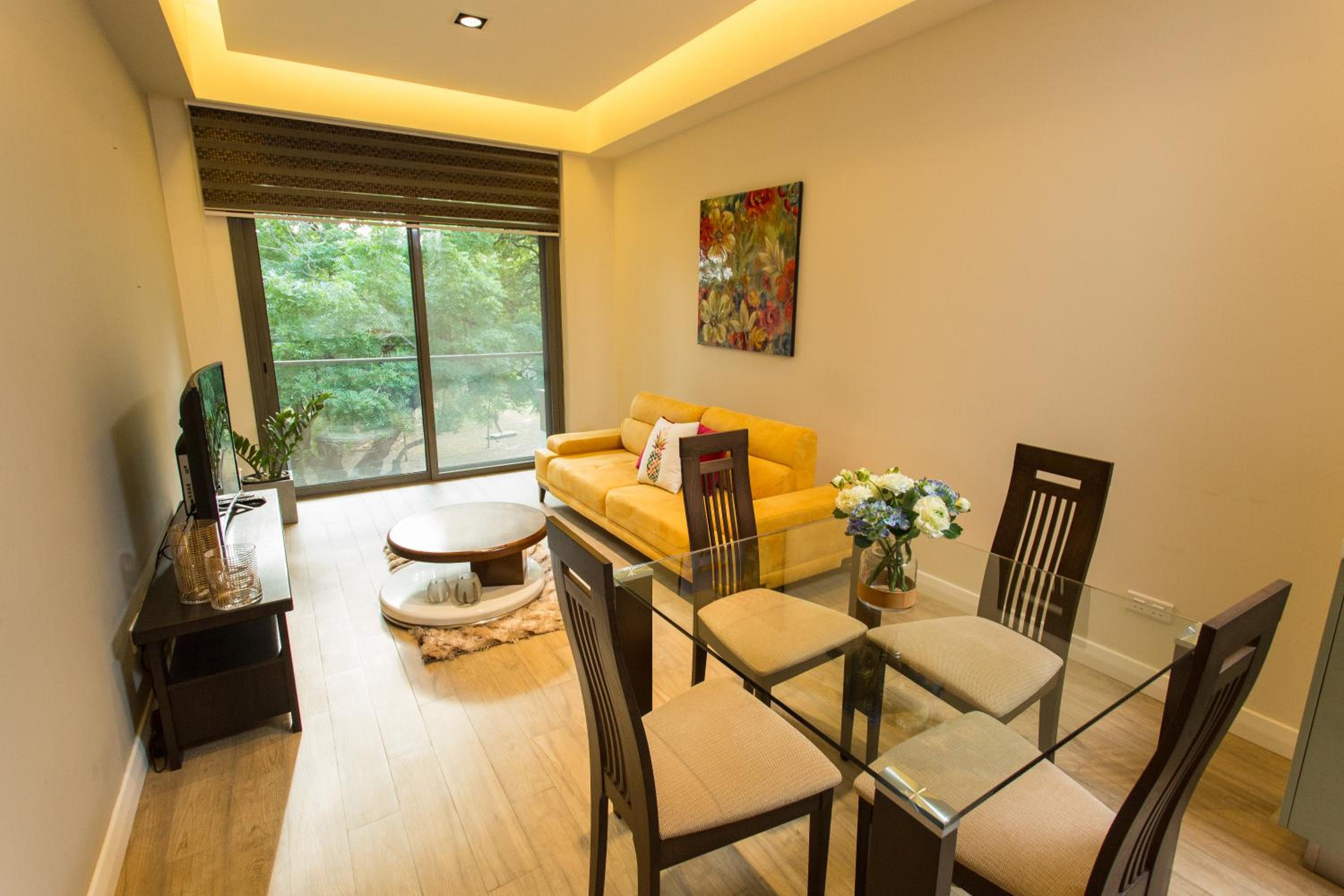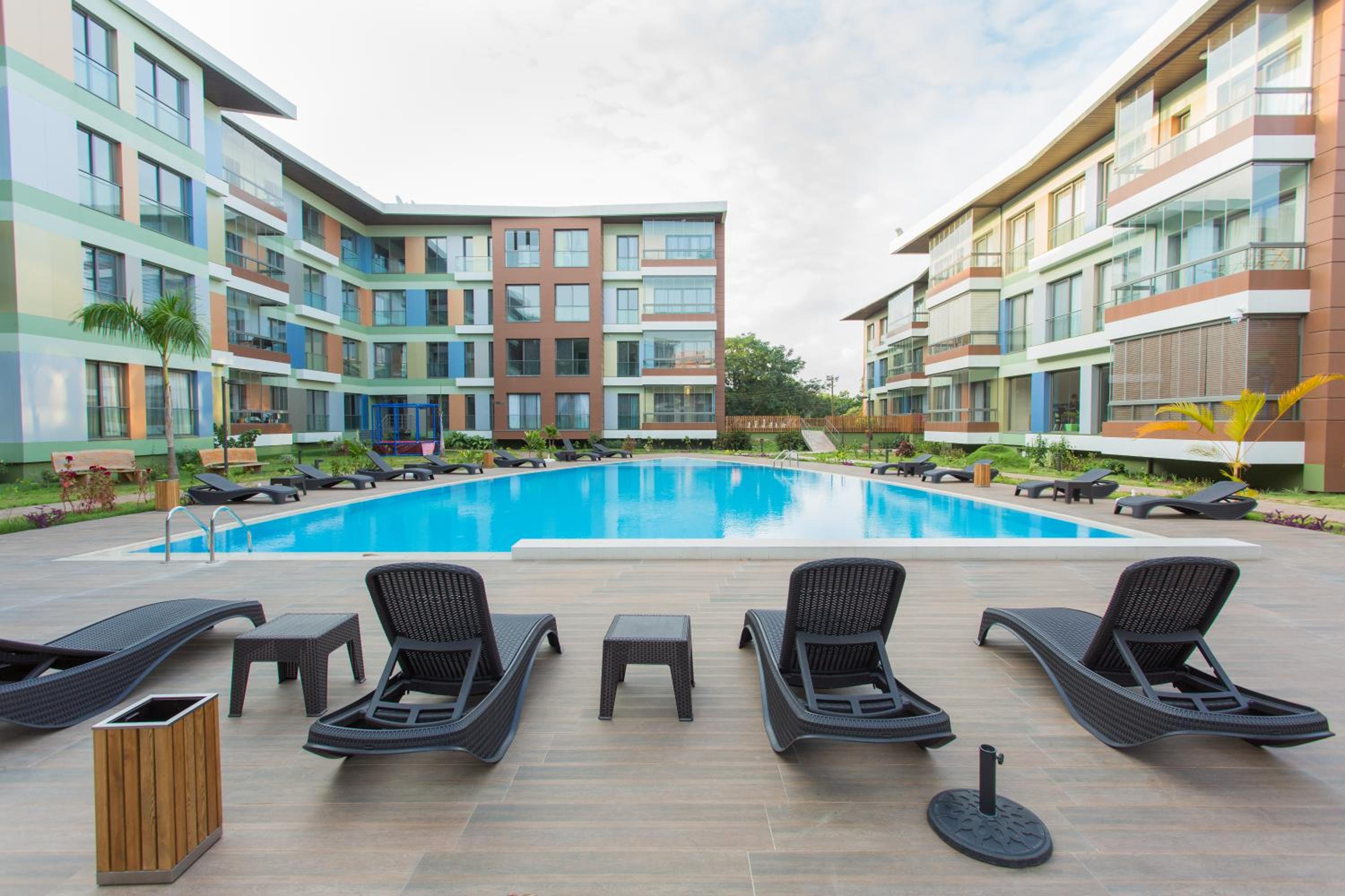 Sustainable Comfort: Enjoy air-conditioned units with modern amenities like a coffee machine, oven, and flat-screen TV. Relax on the balcony with garden views or take a dip in the outdoor pool.
