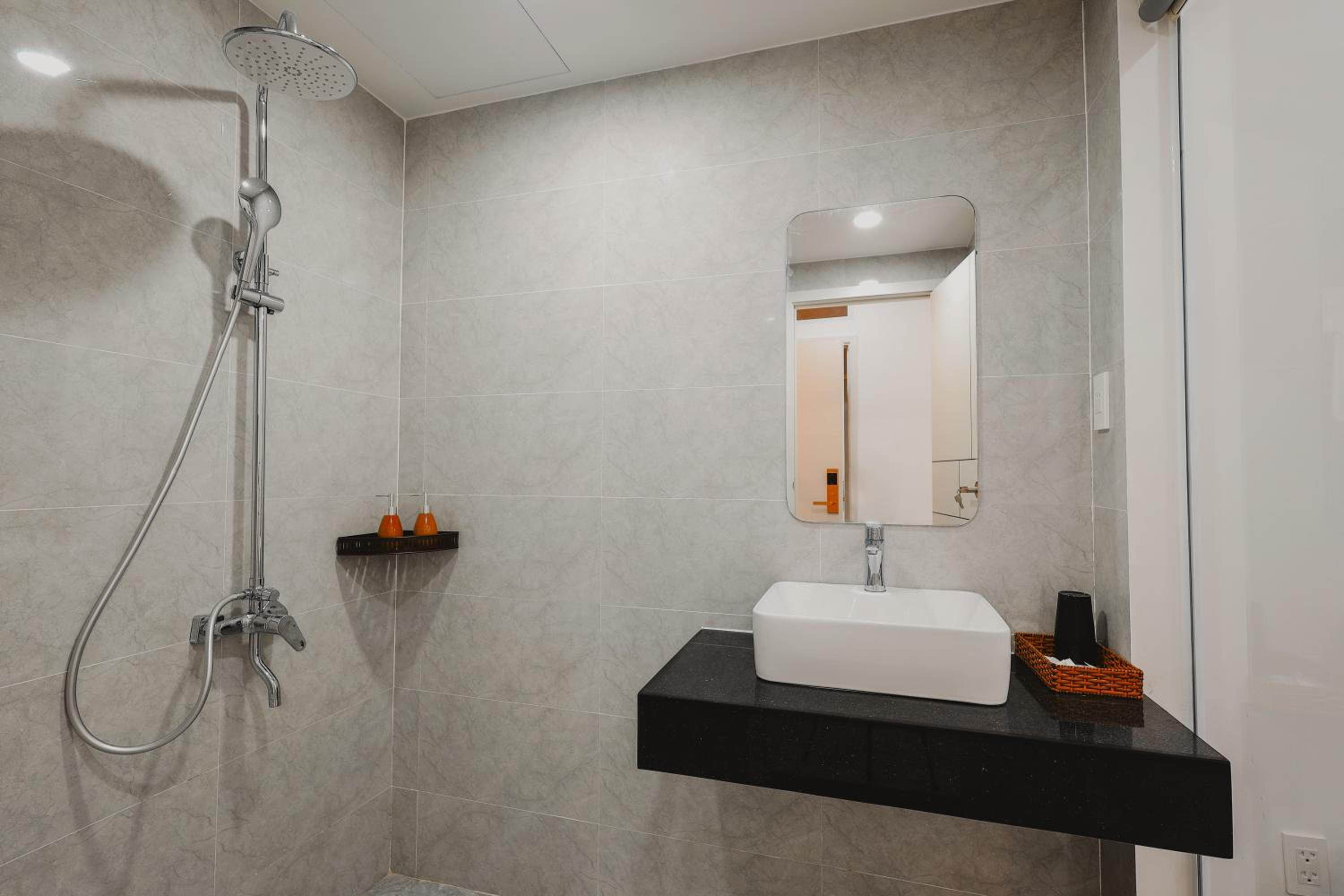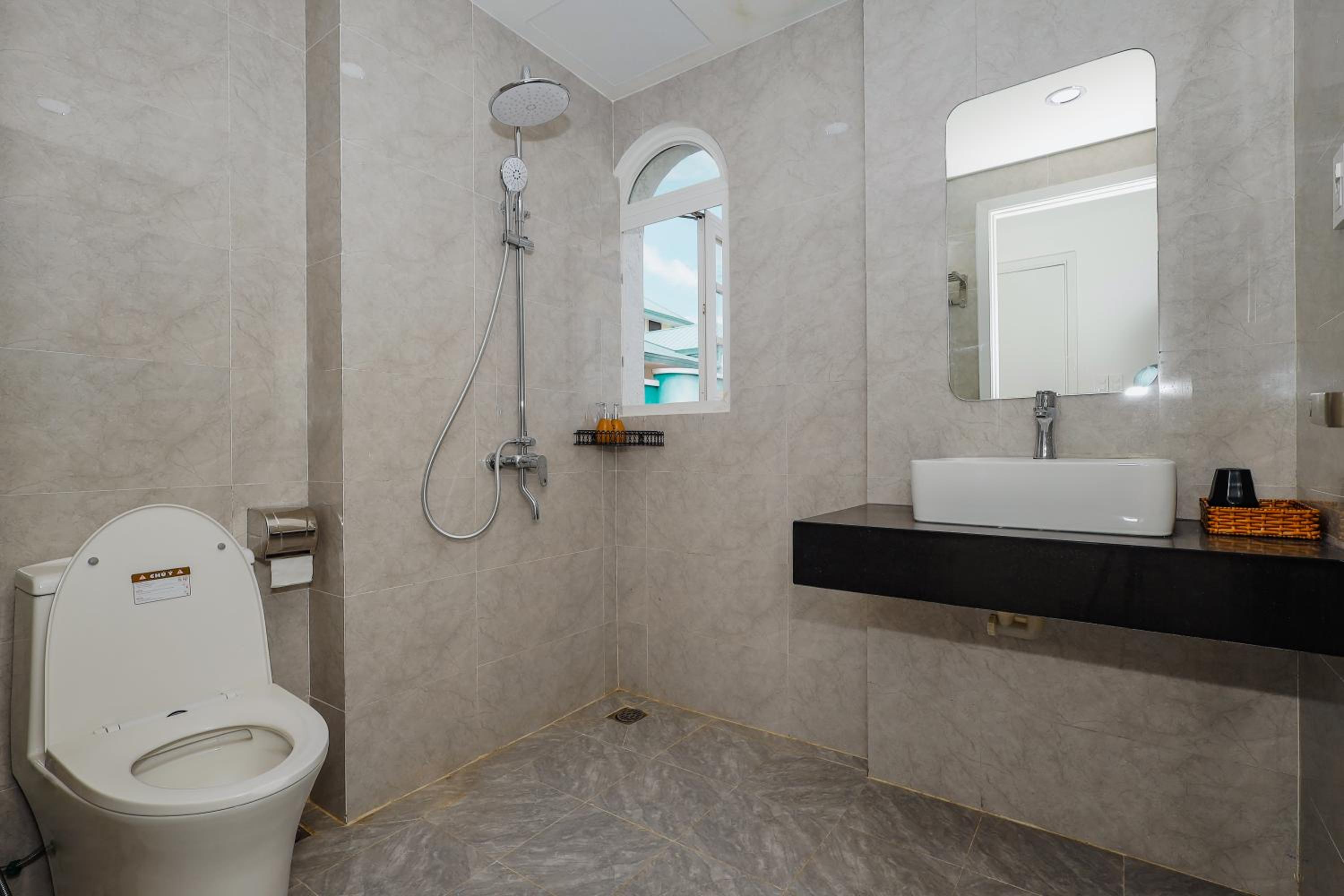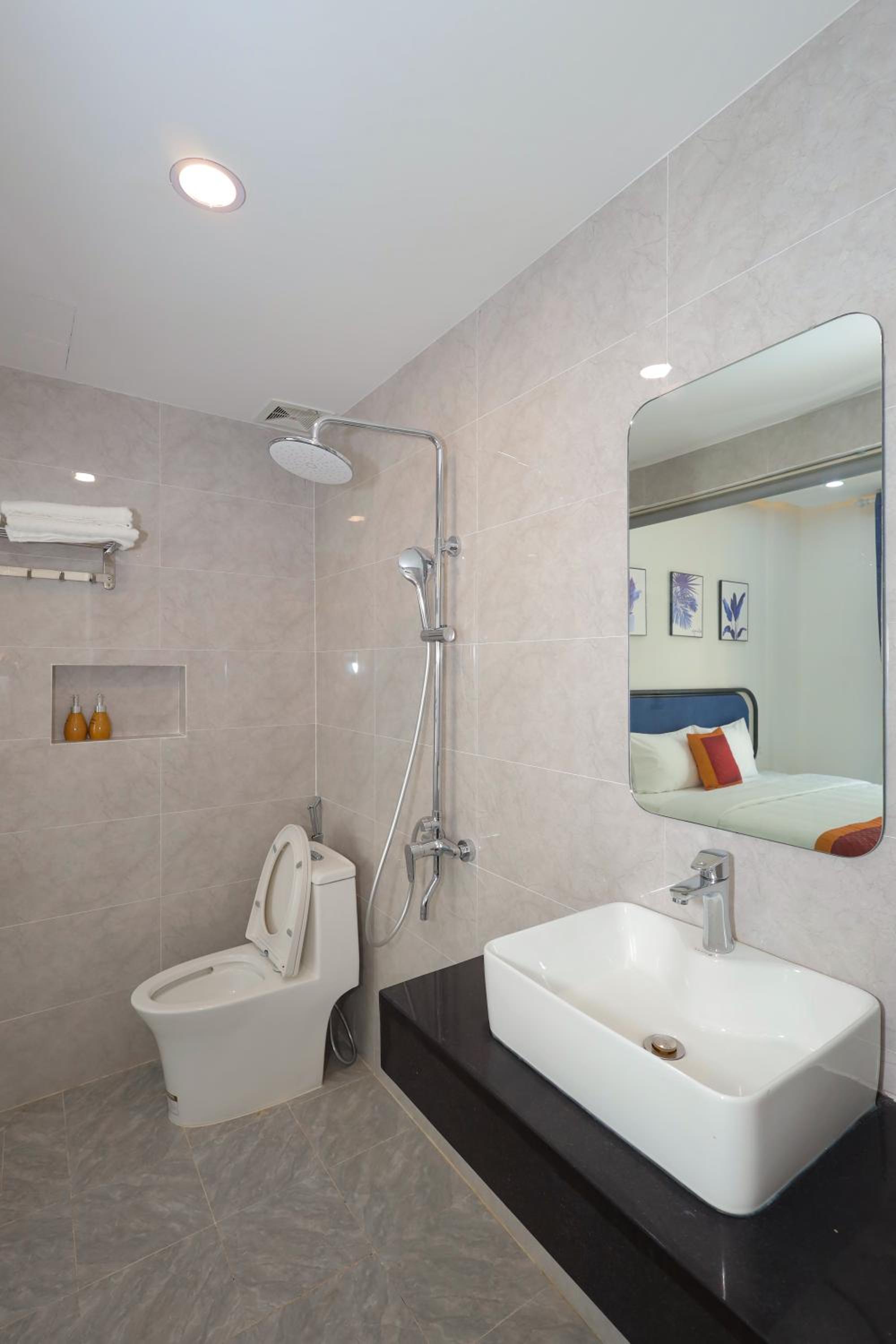 Sàn nhà tắm không có độ nghiêng nên khi tắm xong thì sàn bị đọng nước và rất lâu mới khô
