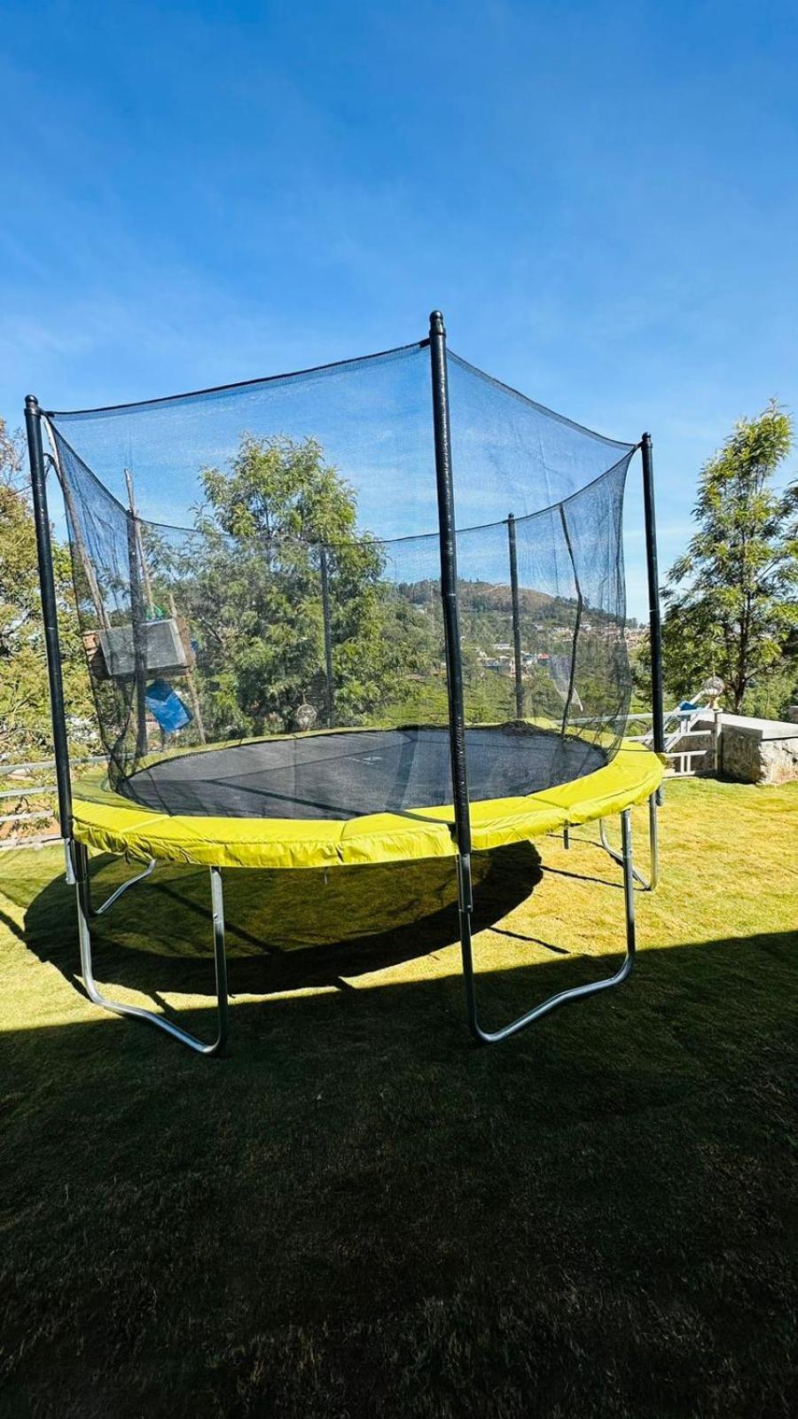 Views, play area, bon fire and trampoline are highlights