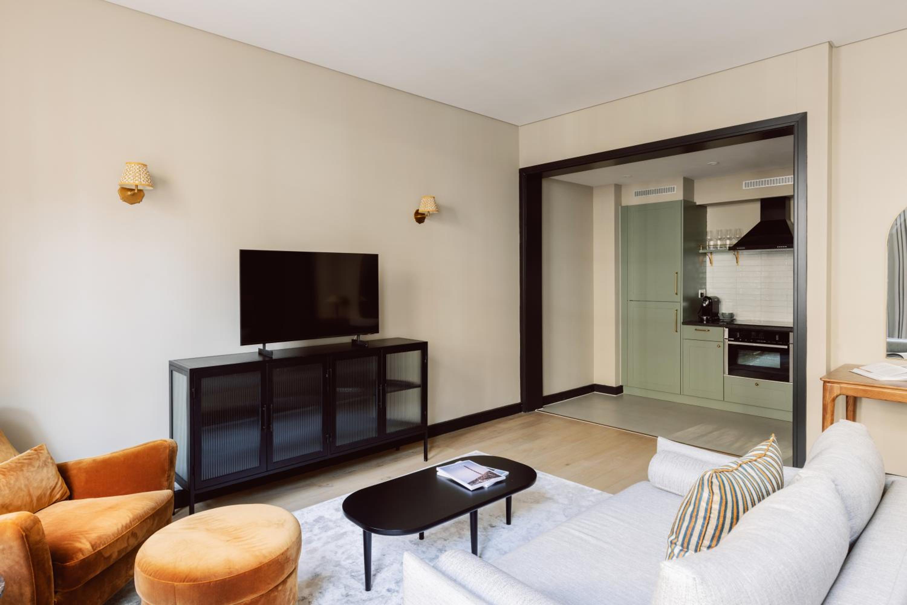These apartments boast modern kitchens, Wi-Fi access, large windows, hardwood floors, separate bedrooms, luxury bathrooms, and spacious living areas with comfortable sofas and a TV.