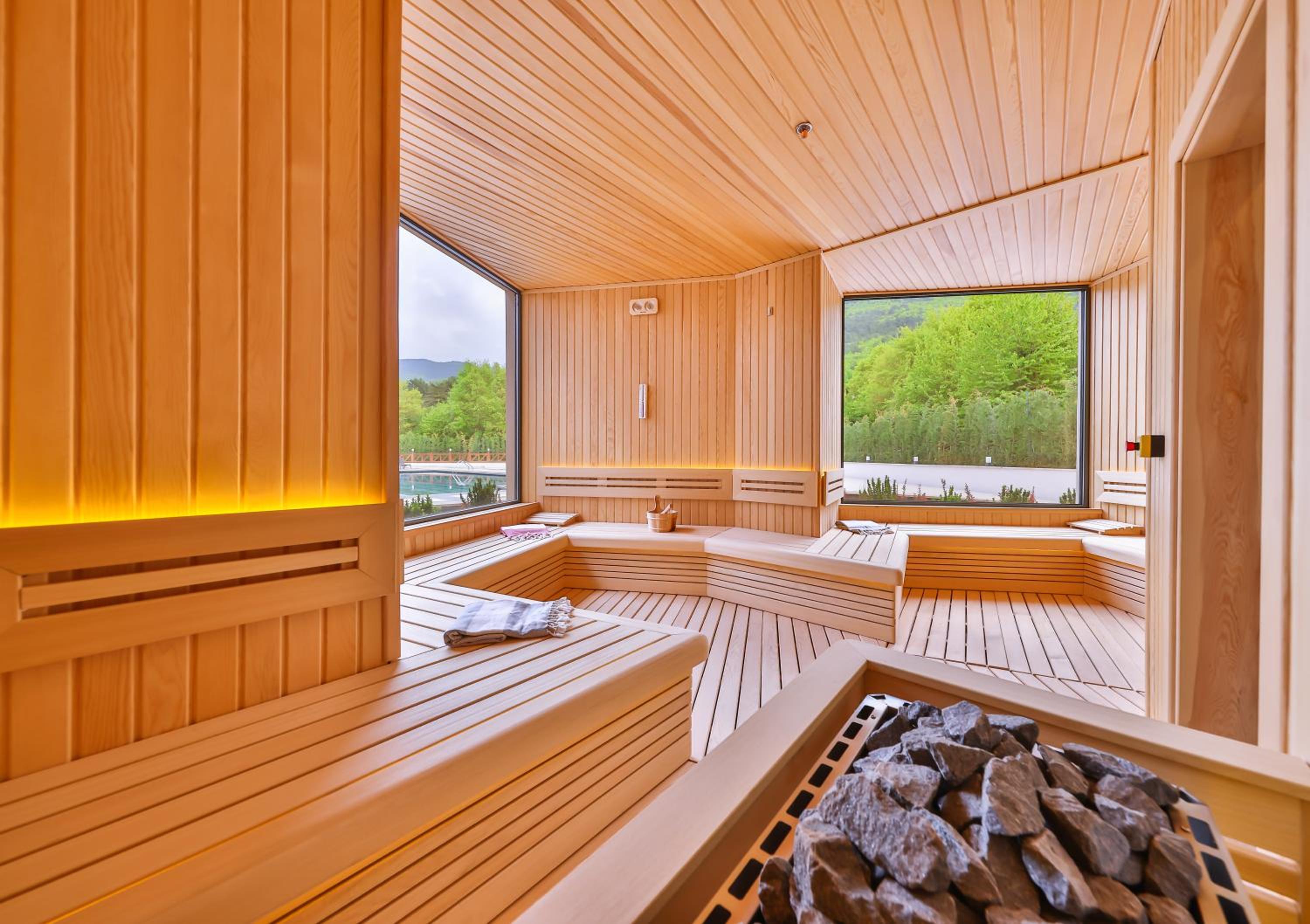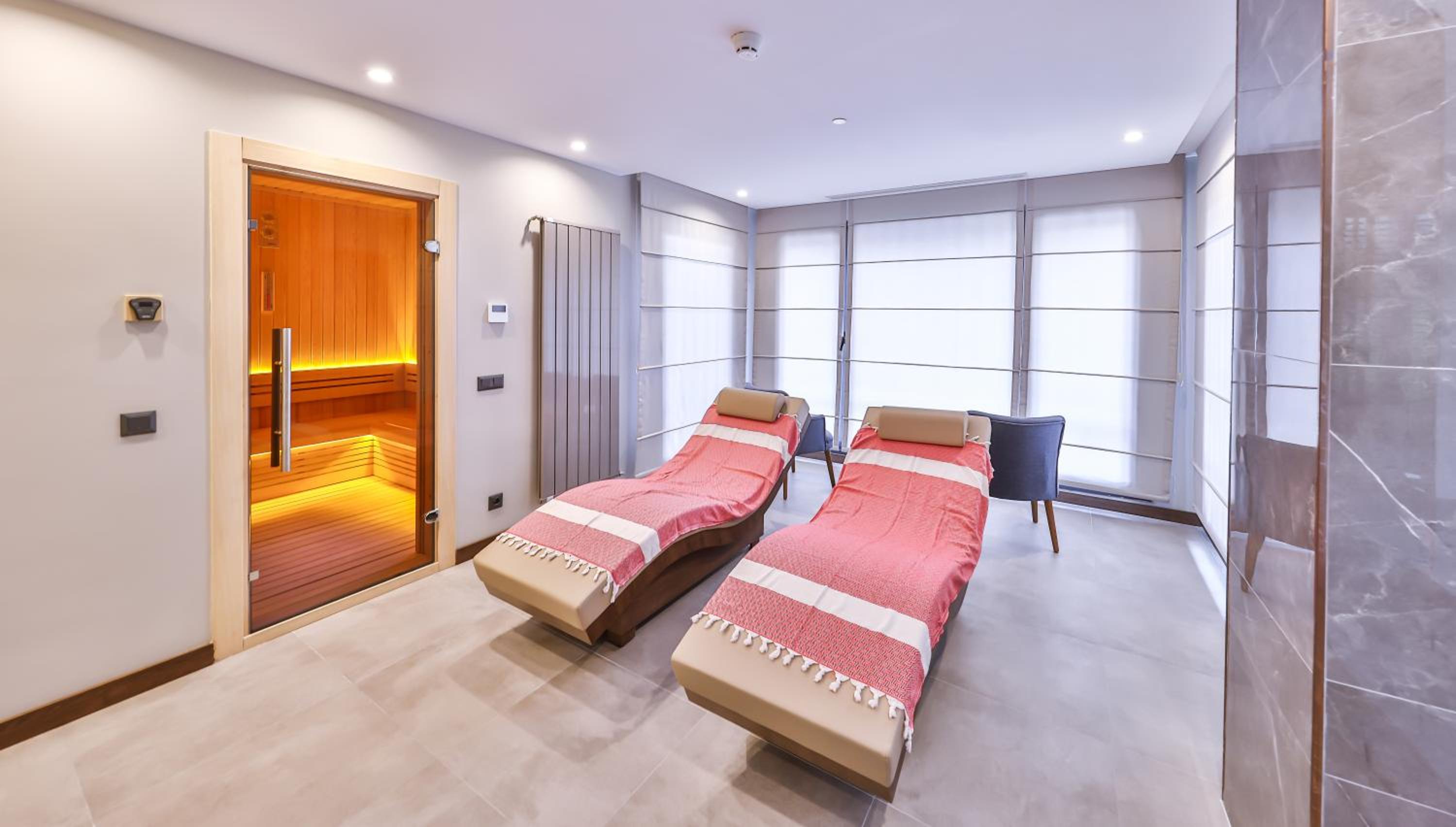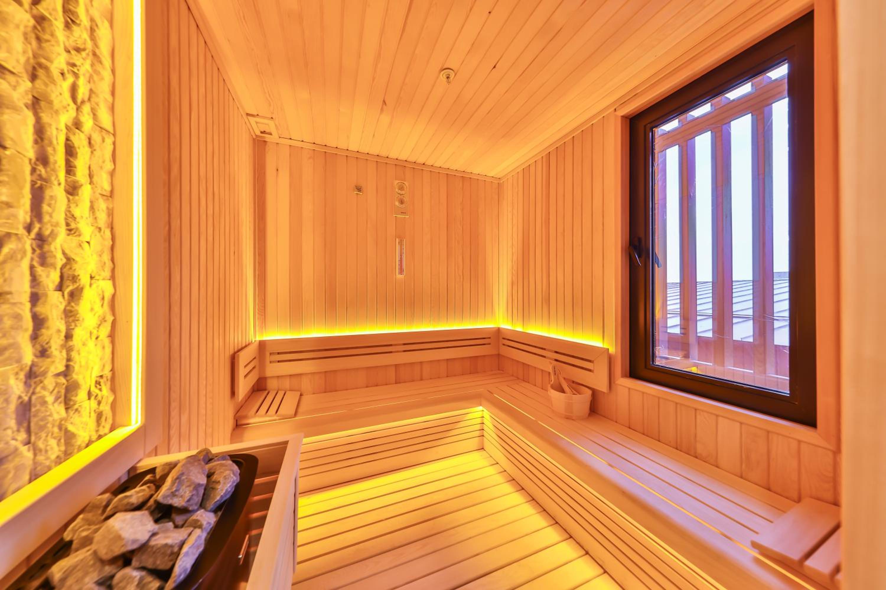 Indulge in 5-star facilities including a sauna, terrace, and a seasonal outdoor swimming pool for ultimate relaxation.