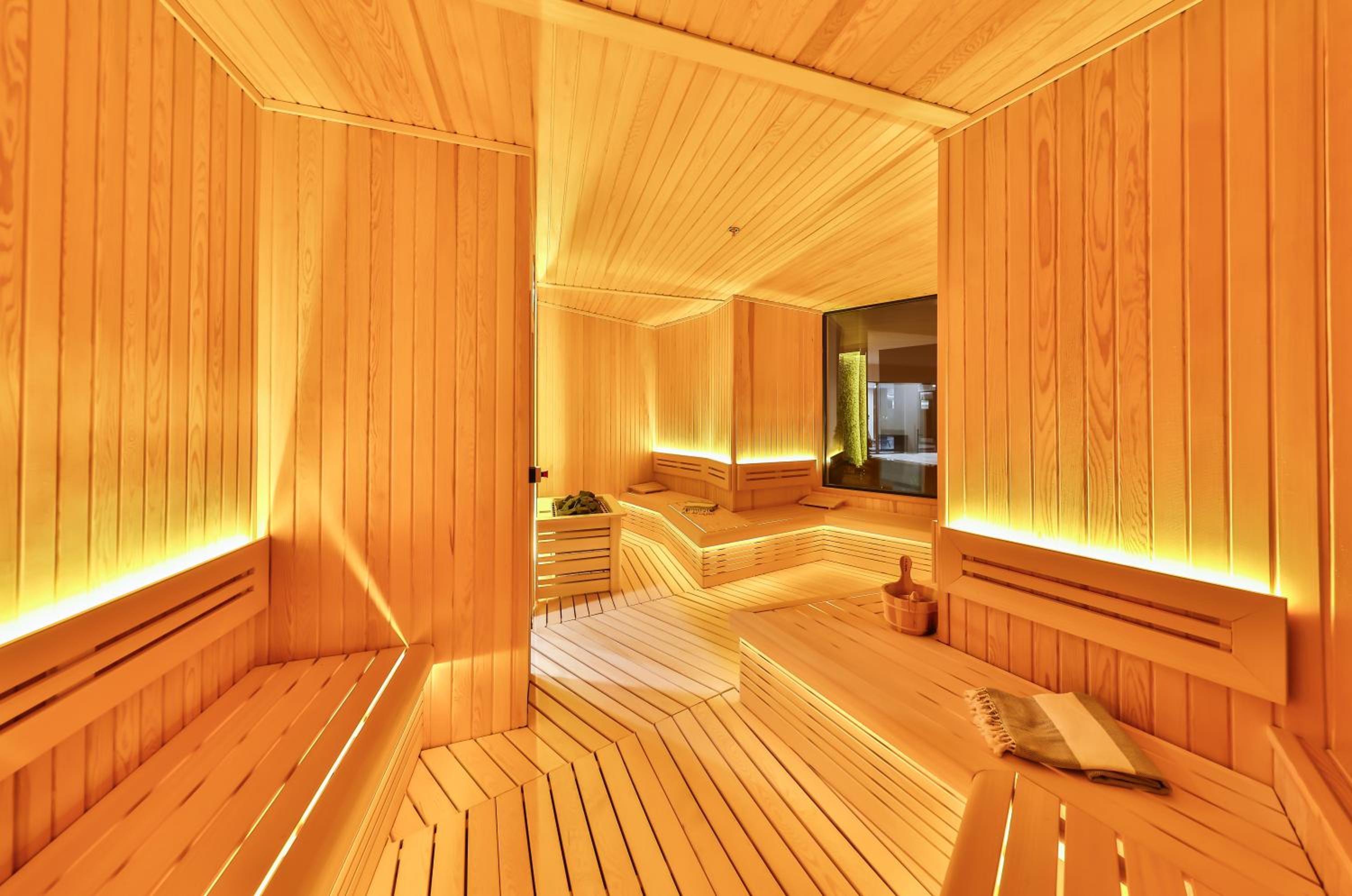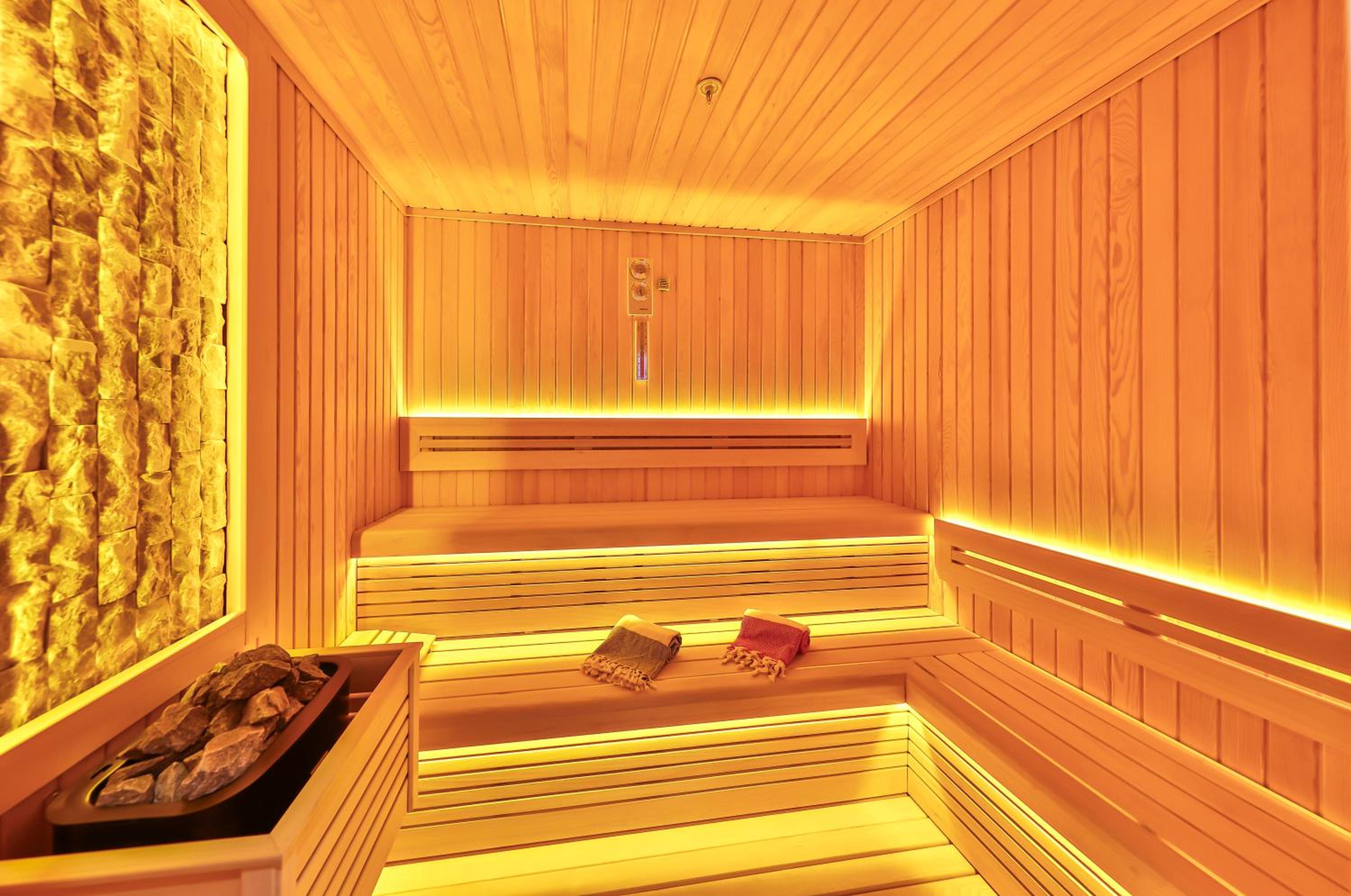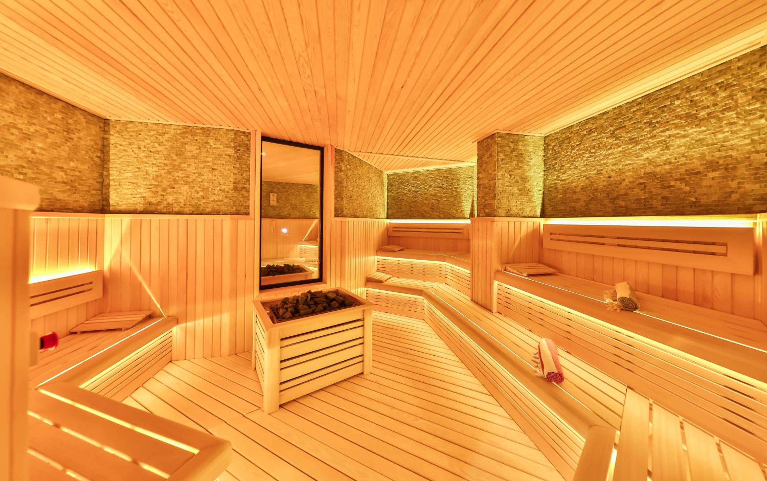 Indulge in 5-star facilities including a sauna, terrace, and a seasonal outdoor swimming pool for ultimate relaxation.