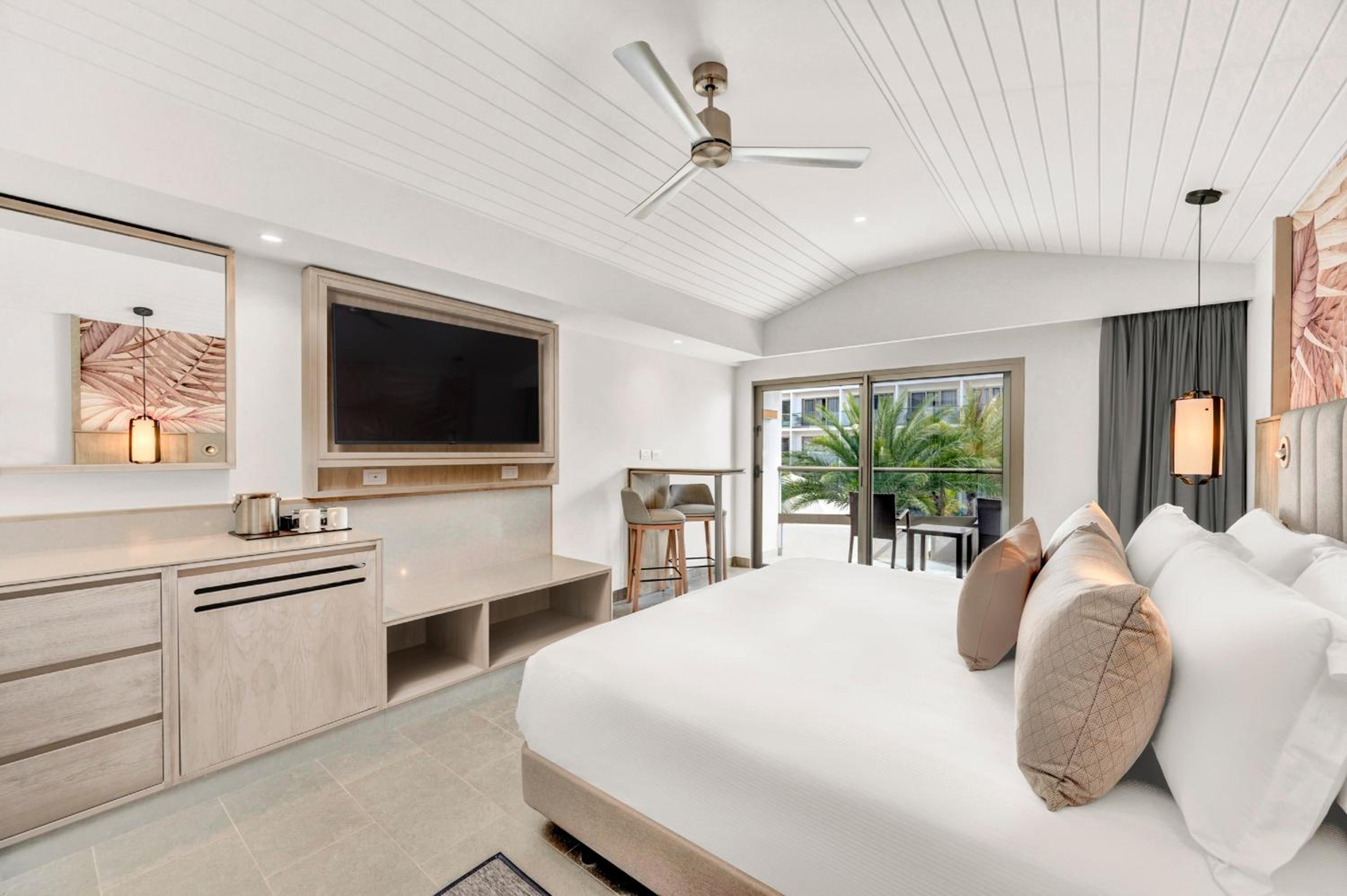 Experience a lavish stay at Royalton CHIC Antigua All-Inclusive Resort - Adults Only, located just 100 meters from the stunning Dickenson Bay Beach. Indulge in the comfort of air-conditioned units equipped with modern amenities like a safety deposit box and a flat-screen TV.