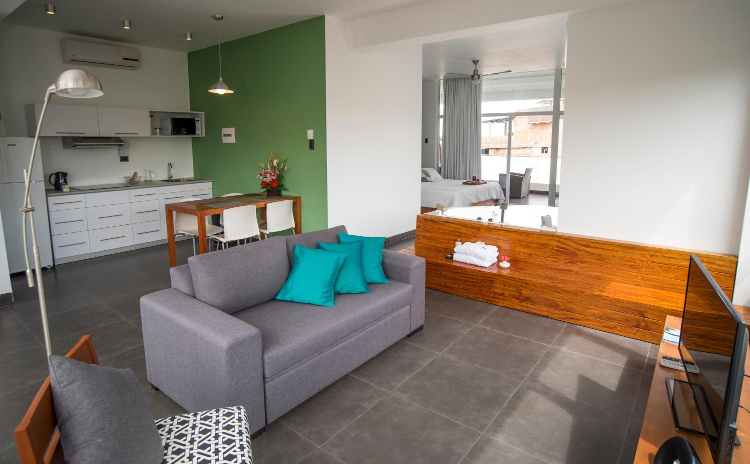 Tucan Suites Tarapoto - Hotel Asociado Casa Andina offers modern apartments with top-notch amenities like a flat-screen TV, air conditioning, and a full kitchenette. Enjoy the convenience of a dishwasher and microwave, along with the comfort of a private bathroom with complimentary toiletries.