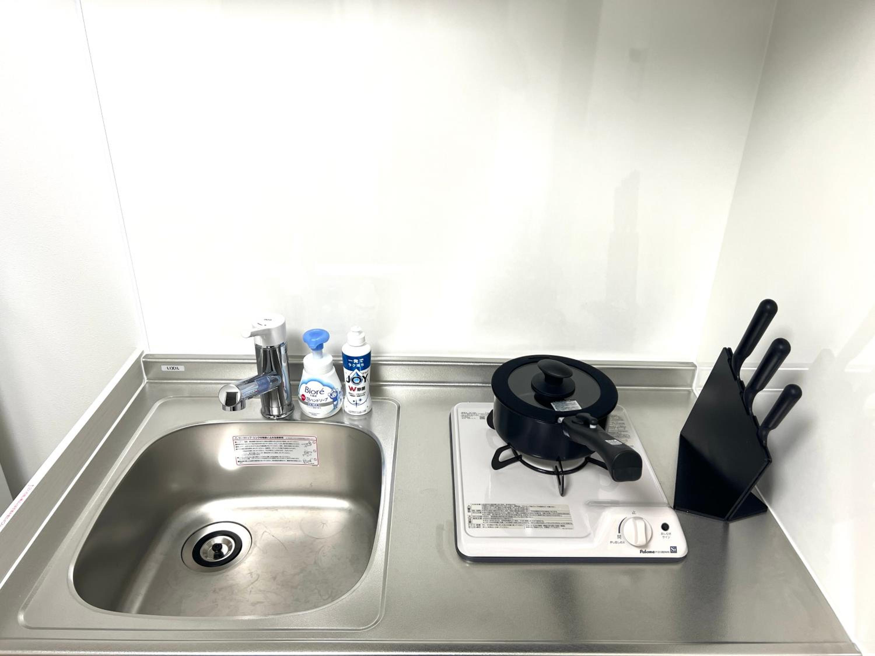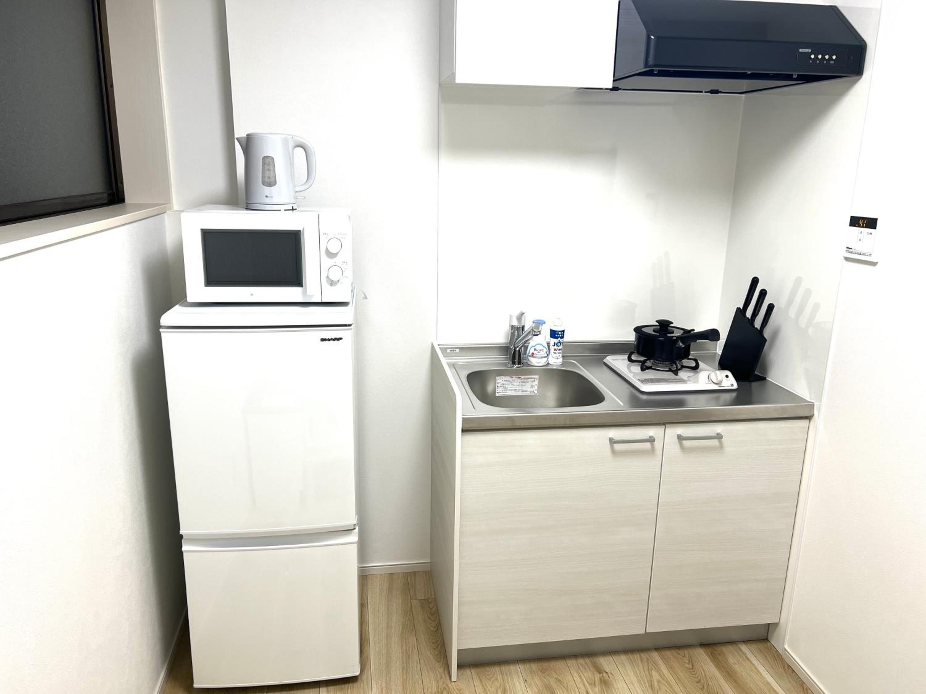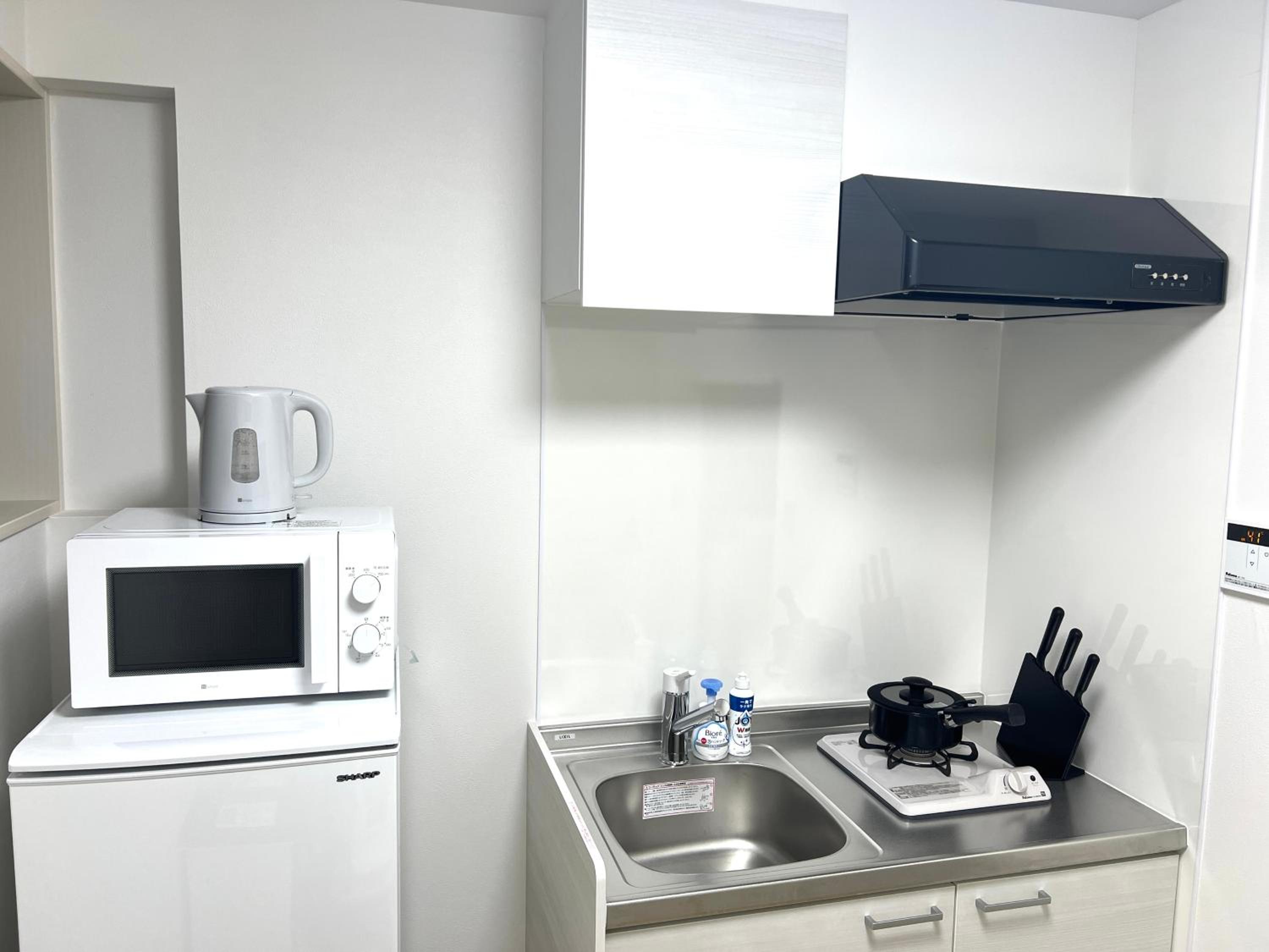 The modern kitchen comes complete with a microwave, fridge, and stovetop, ideal for preparing meals during your stay.