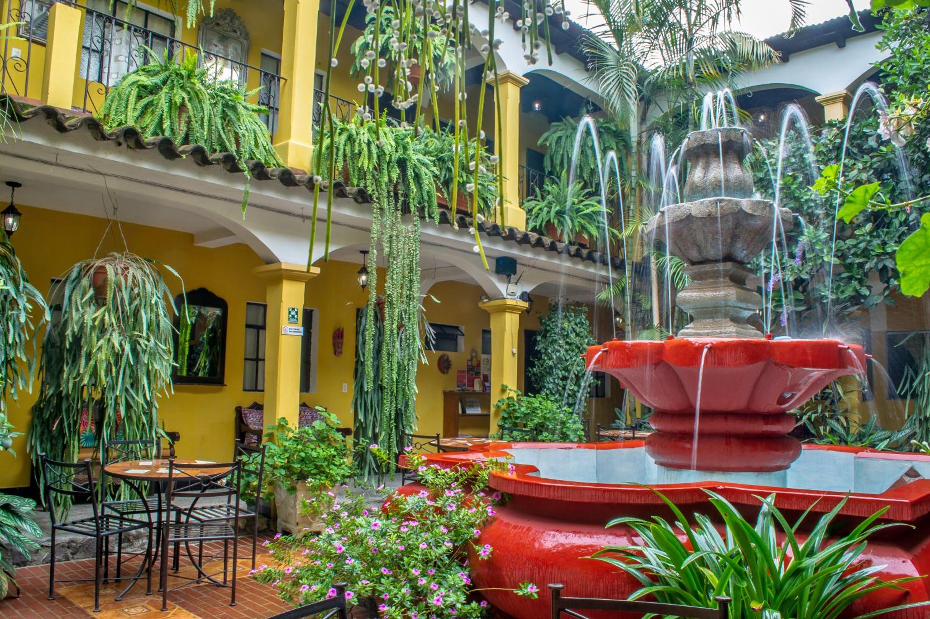 Garden with Fountain and Rooftop Terrace: Enjoy the serene ambiance of our garden with a fountain and soak in breathtaking views from the rooftop terrace overlooking Antigua Guatemala and the majestic volcanoes.