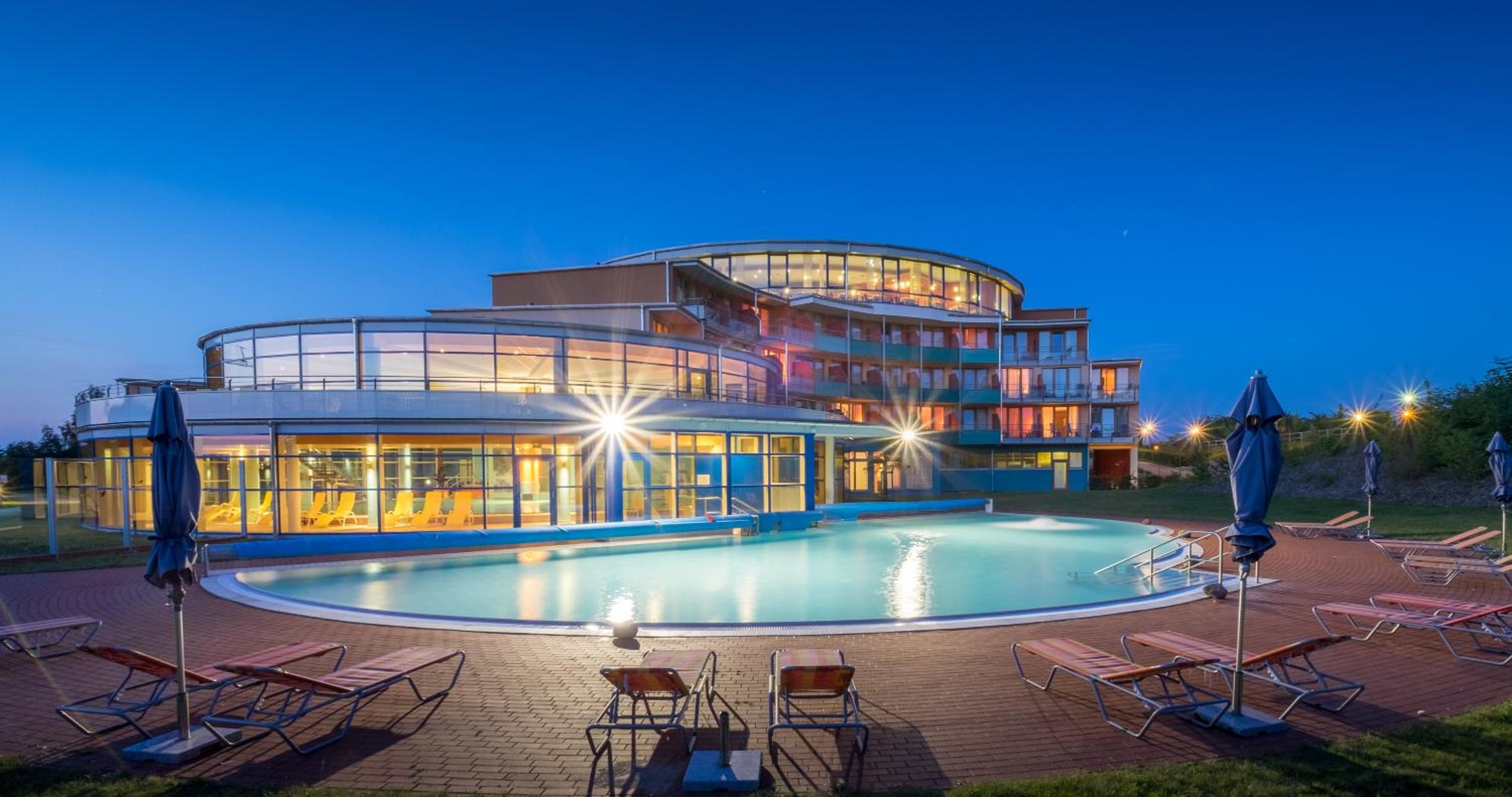 Der Spabereich mit Sauna und Schwimmbad/Solebecken außen ansprechend und geräumig.