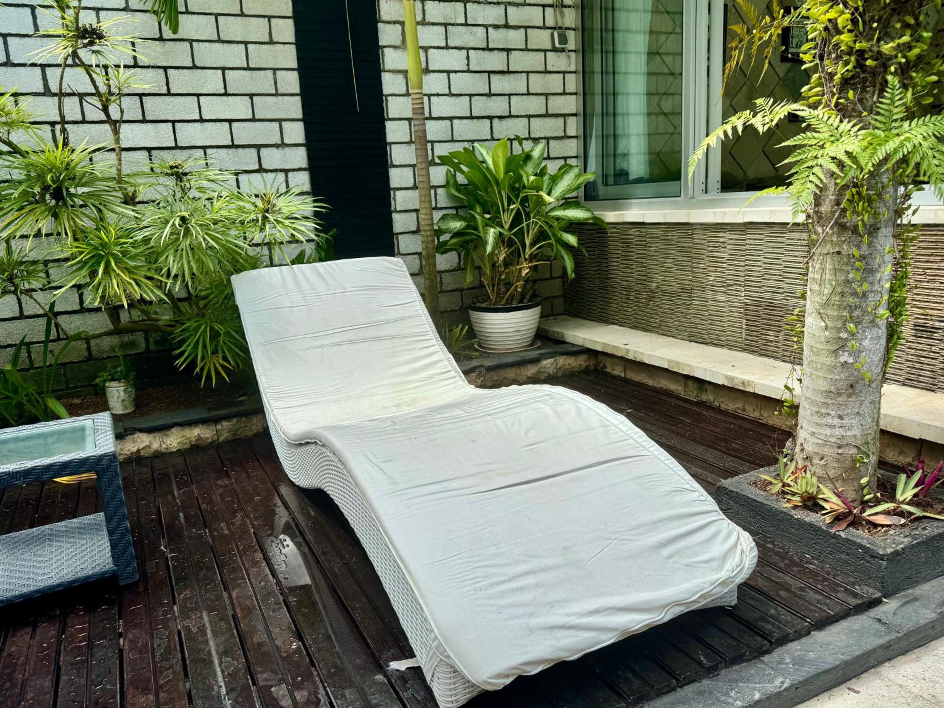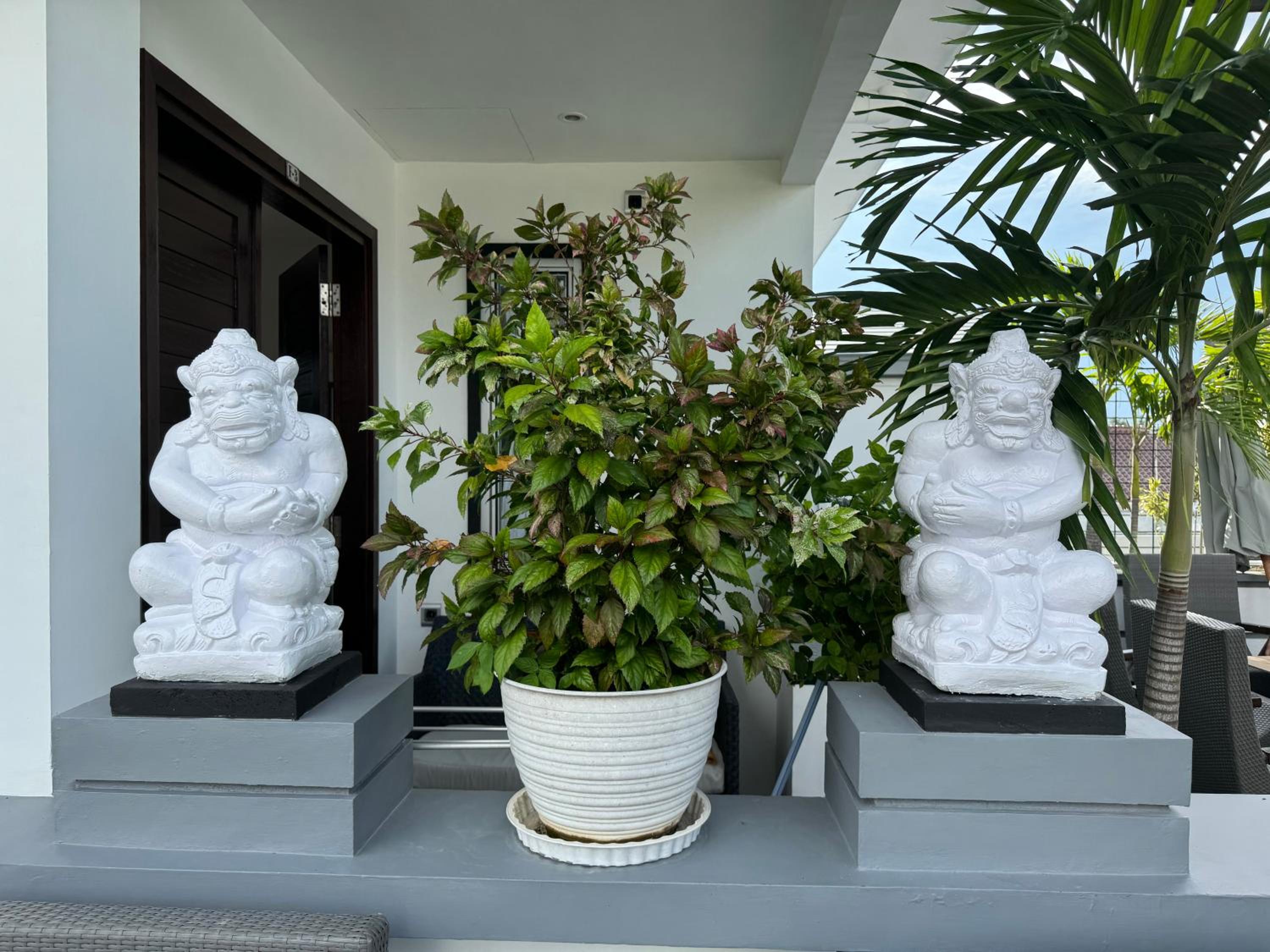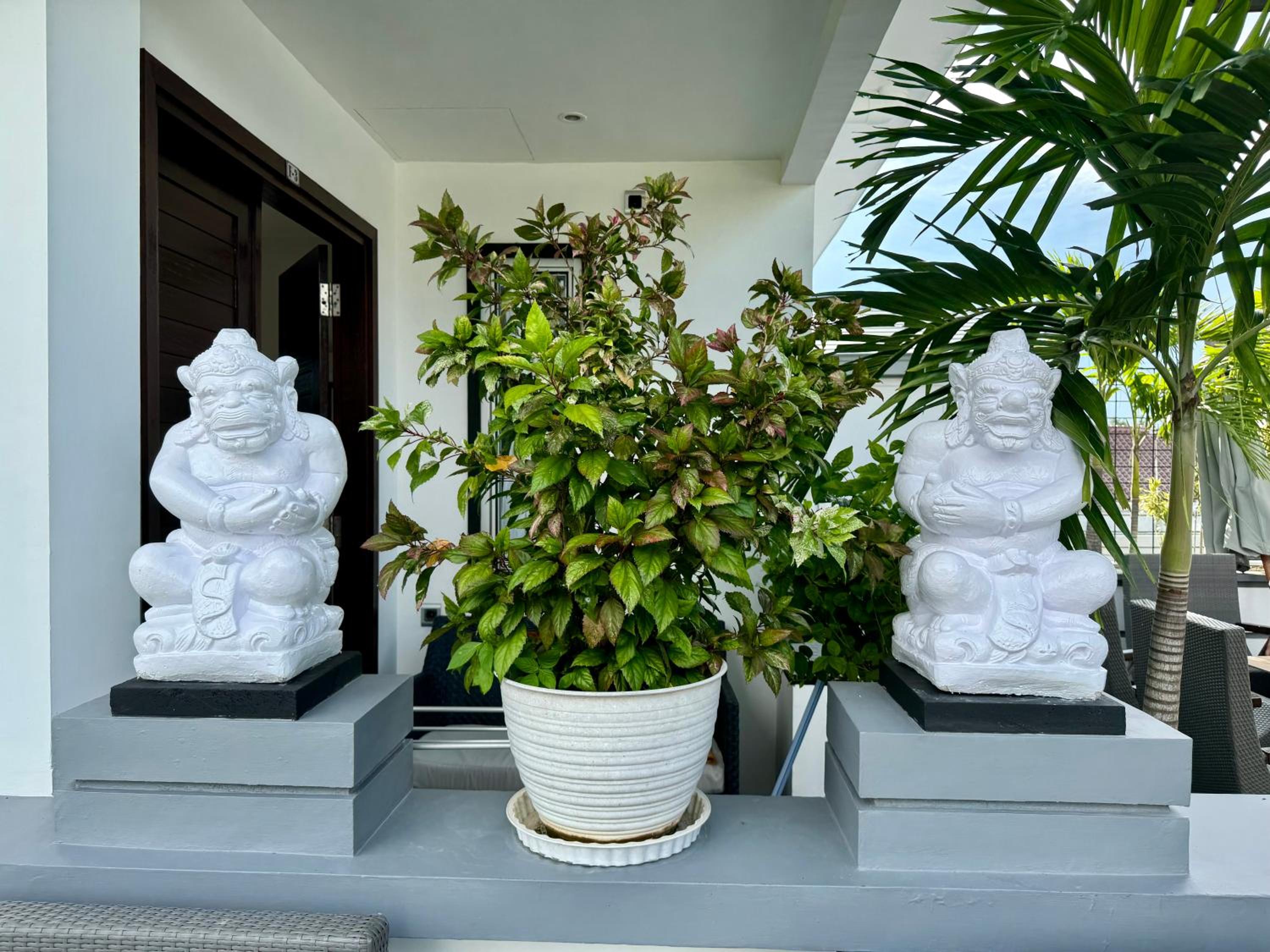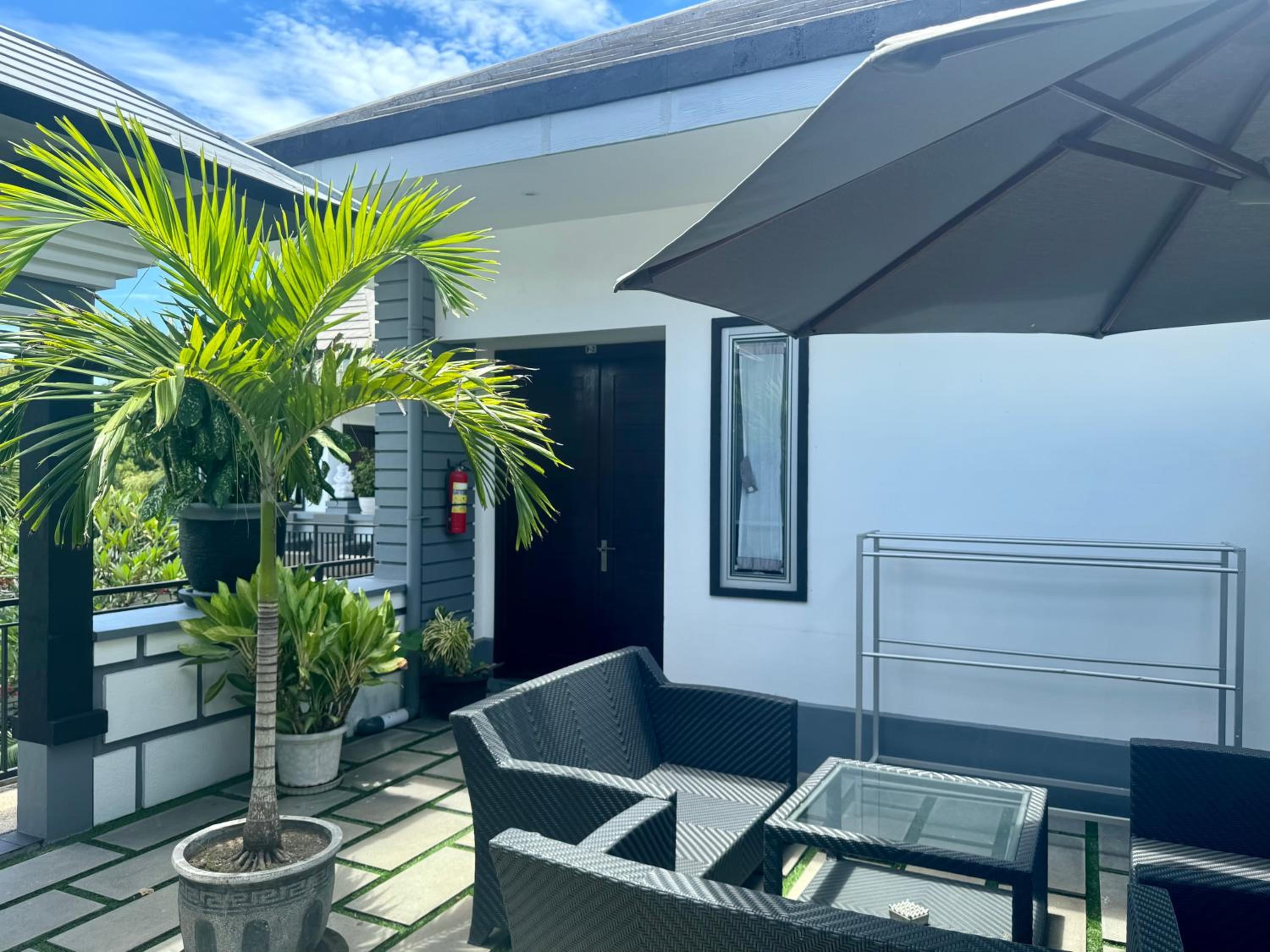 Garden & Pool Oasis: Enjoy a serene garden setting and take a dip in the outdoor pool at Villa Rumah Putih Abu Abu. Perfect for relaxation and unwinding.