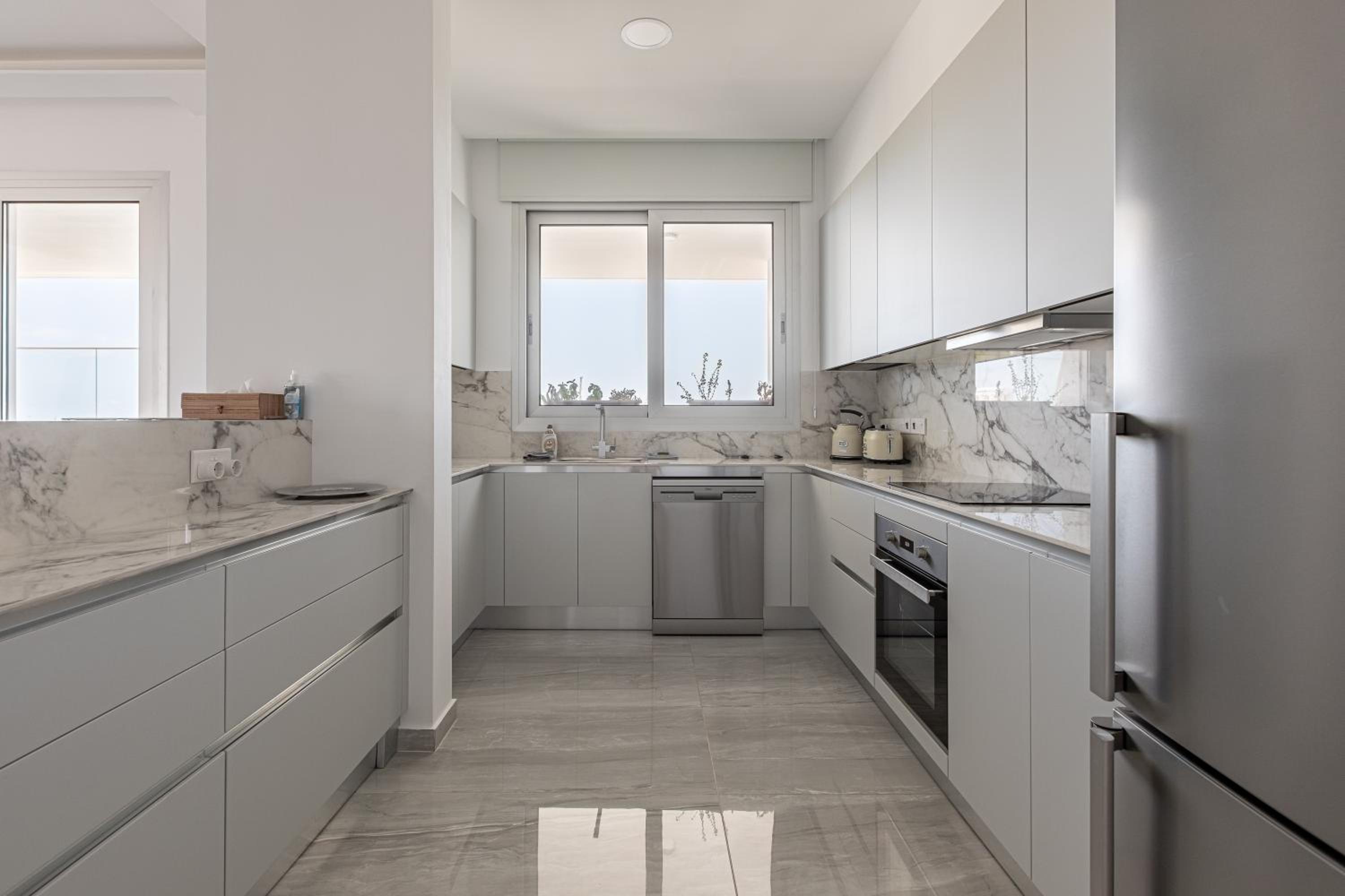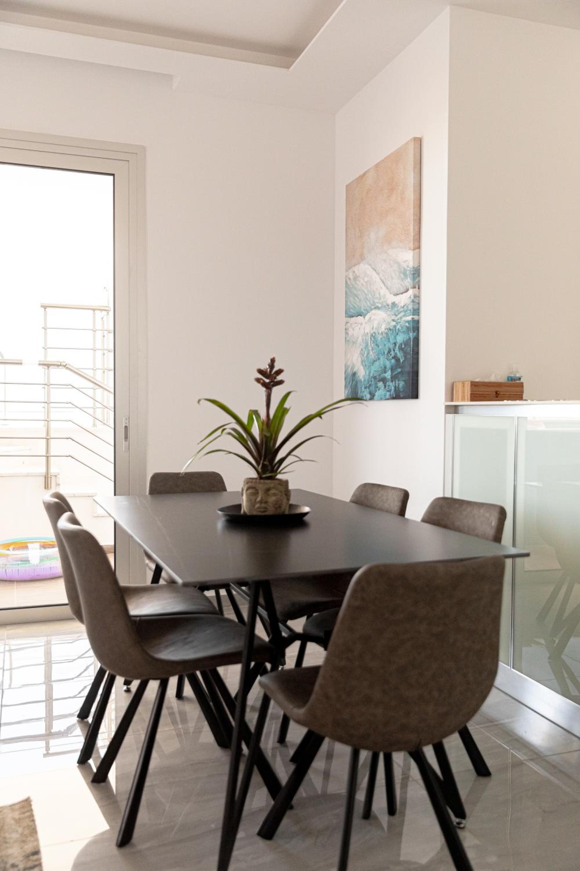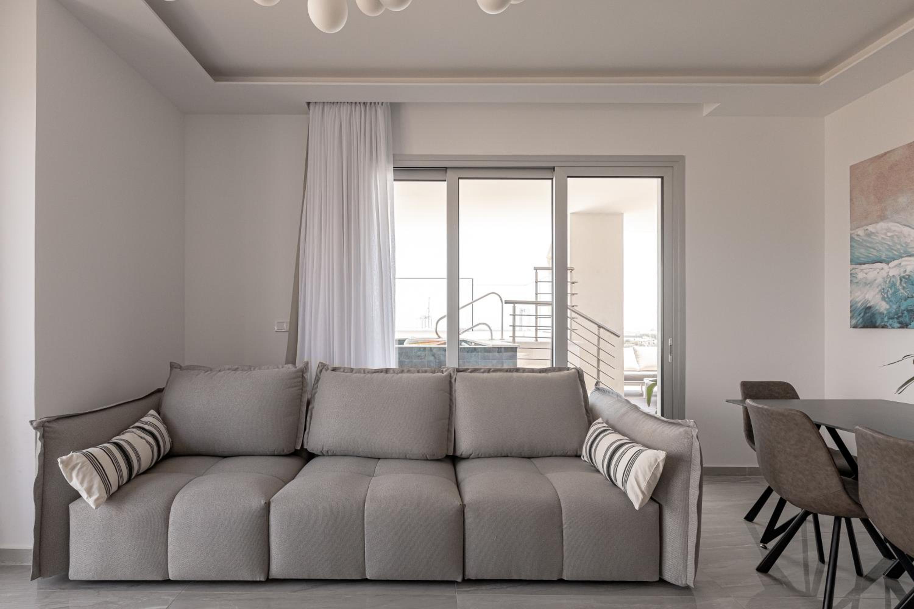 Modern Amenities: Indulge in comfort with 3 bedrooms, 3 bathrooms, a fully equipped kitchen, flat-screen TV with streaming services, and a terrace overlooking the sea.