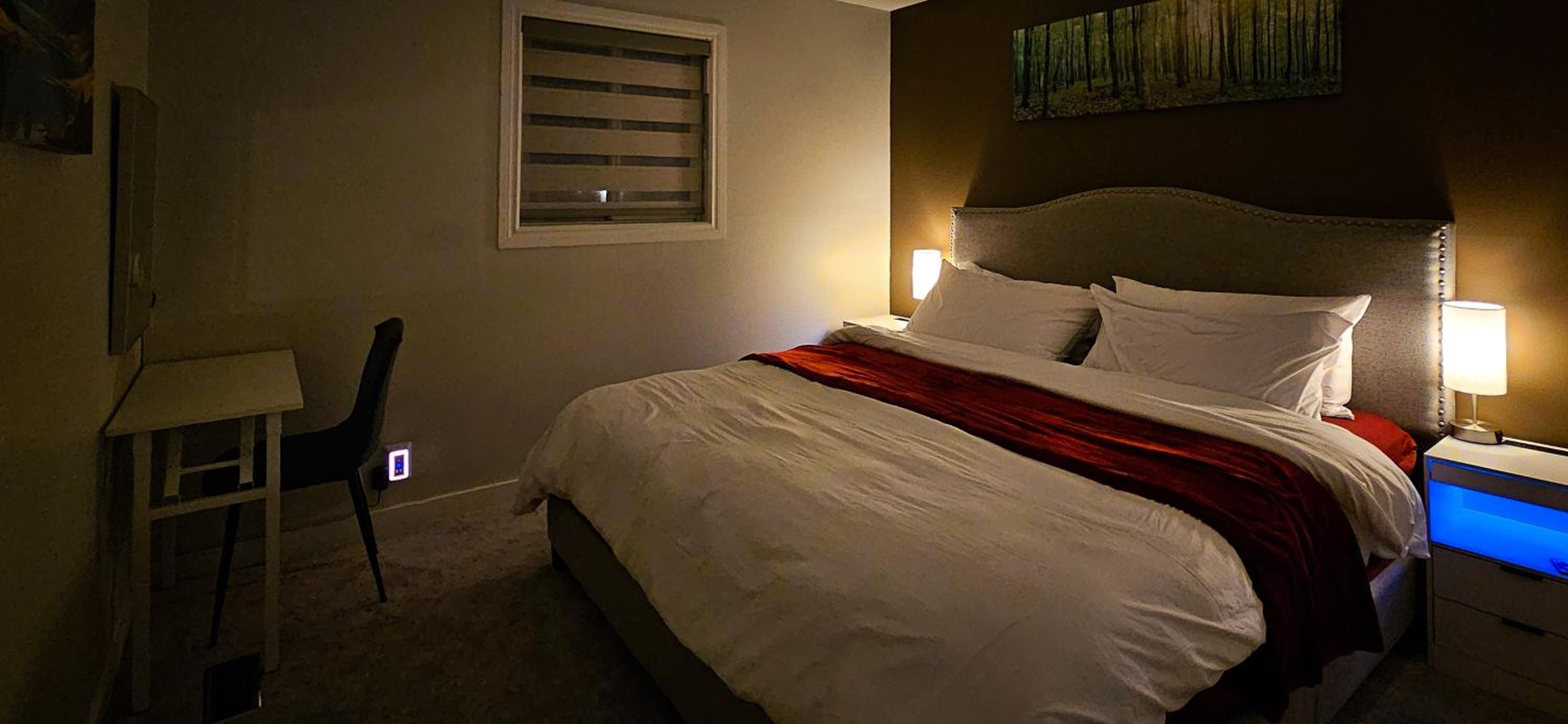 Indulge in comfort with a cozy king bed, a fully equipped kitchen, and bathrobes for a relaxing stay.