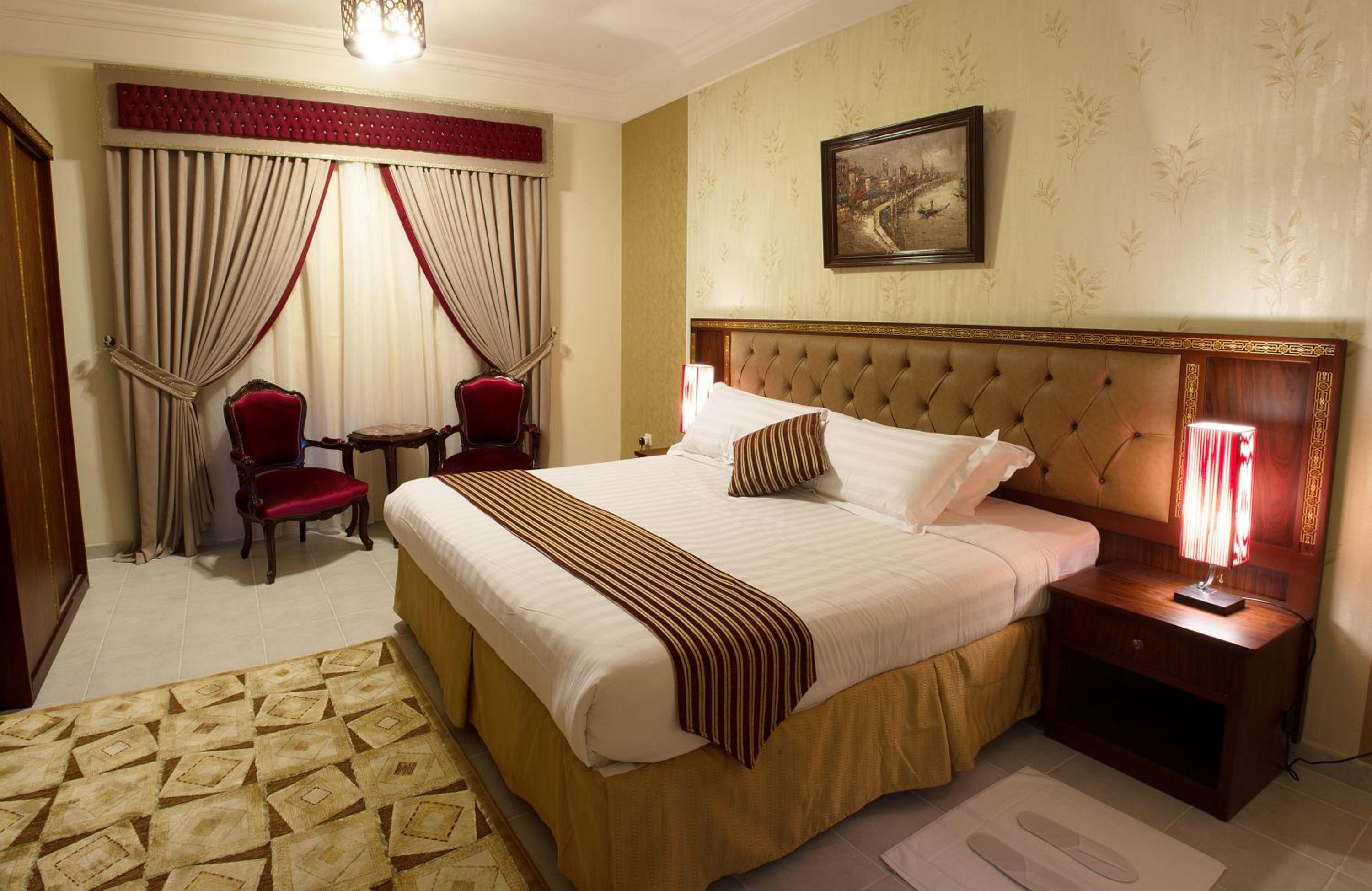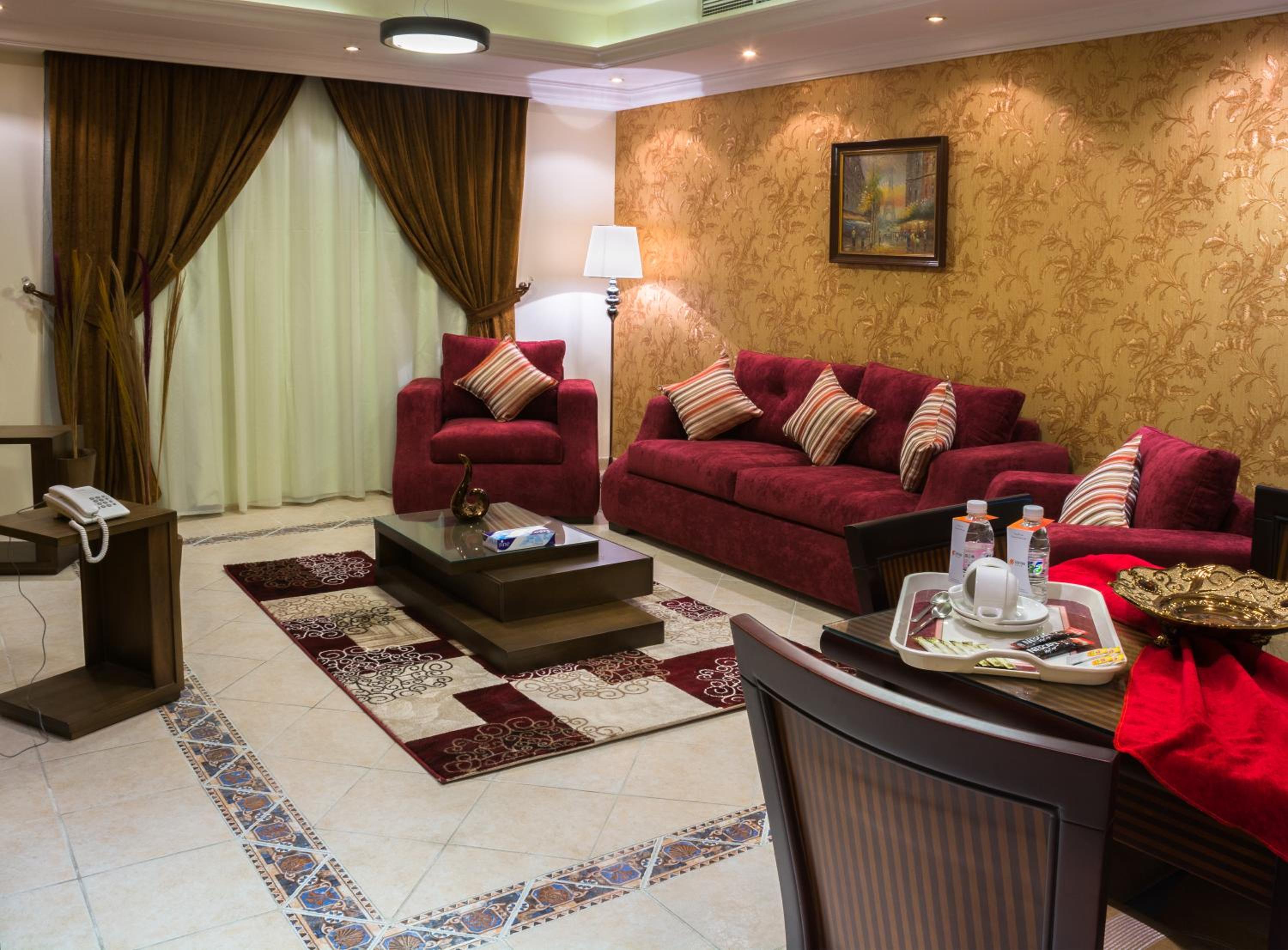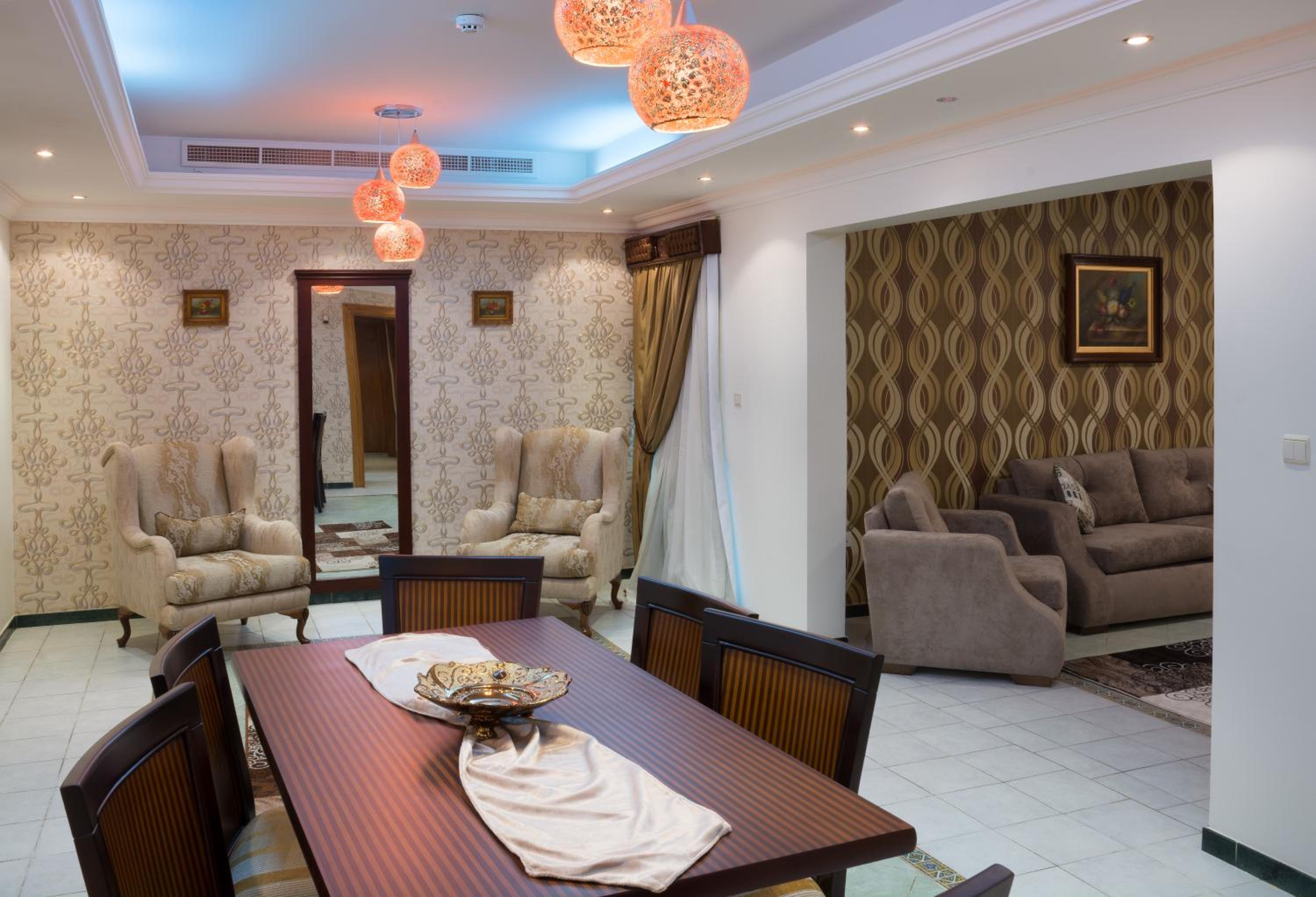 Safari Hotel Apartment offers spacious suites adorned with traditional sofas and wooden furniture, providing a cozy and authentic atmosphere for guests. Each suite features a full kitchen, dining area, and living room for ultimate comfort and relaxation.