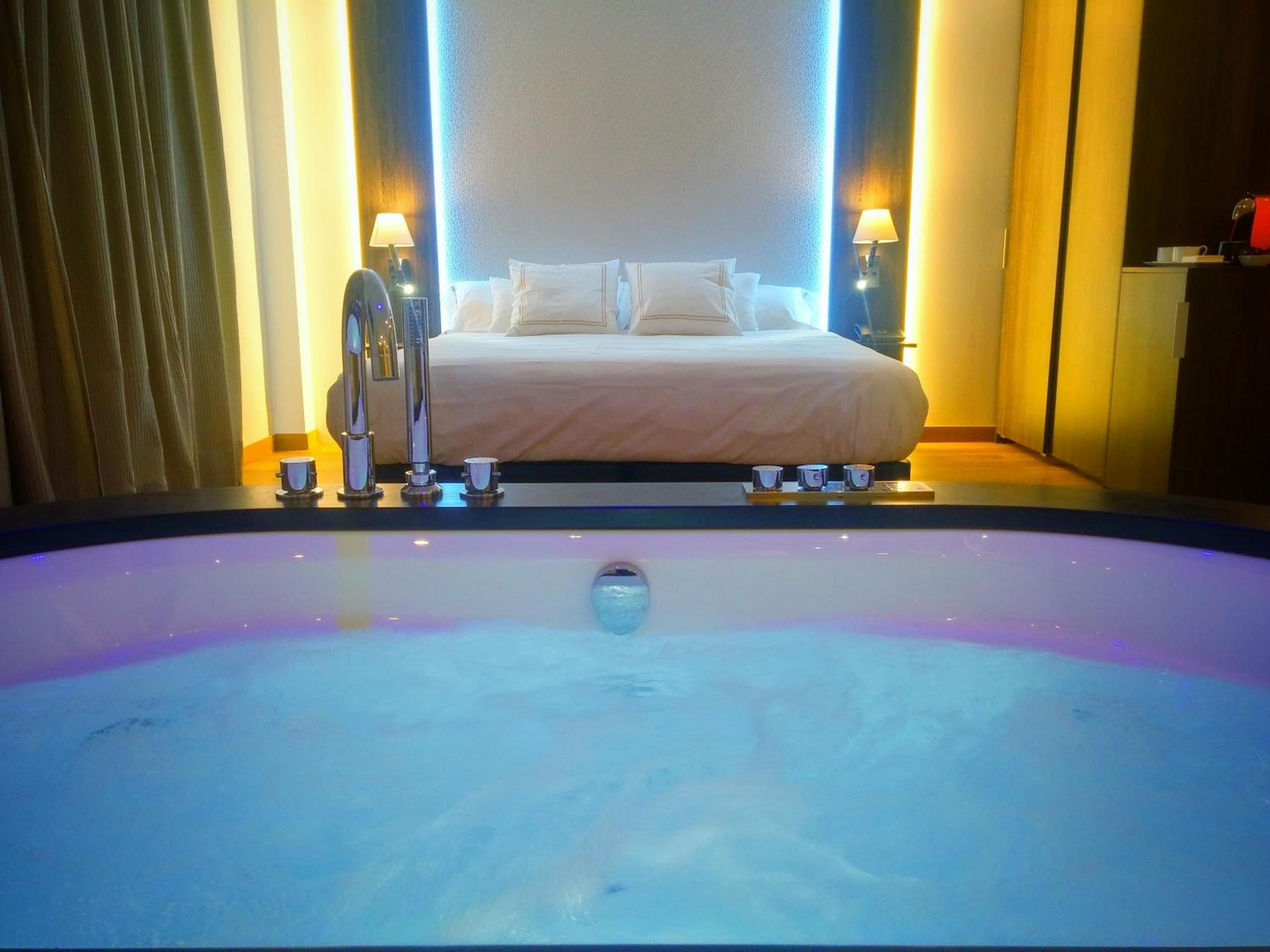 we stayed in a jr suite - it was a large open room with a whirpool tub . the tub includes the shower which is a handheld unit that does not rise more than 4 ft .. it was awful and unsafe and difficult to shower in . On top of that , the tub includes a motion activated led multicolour lighting system that goes on even in the middle of the night is you use the washroom next to it .