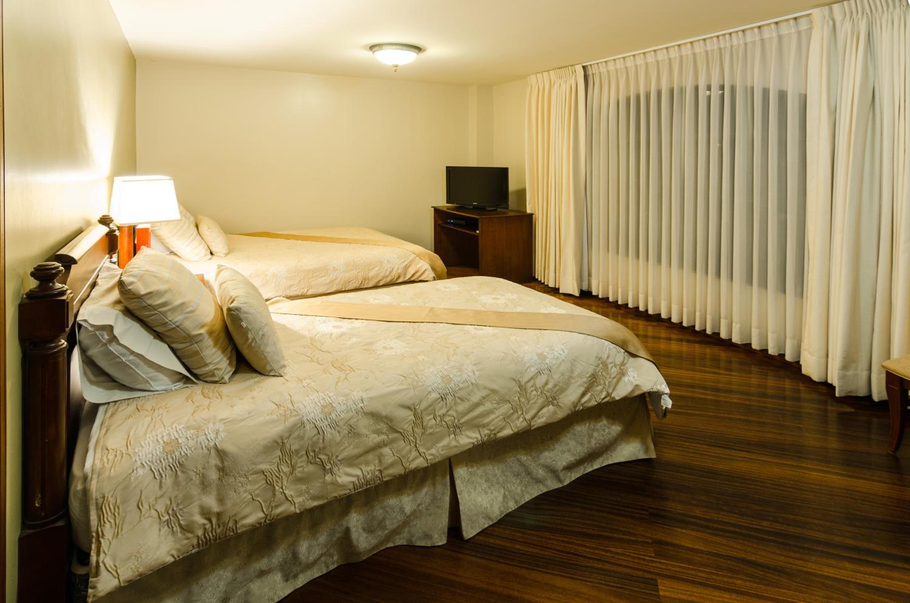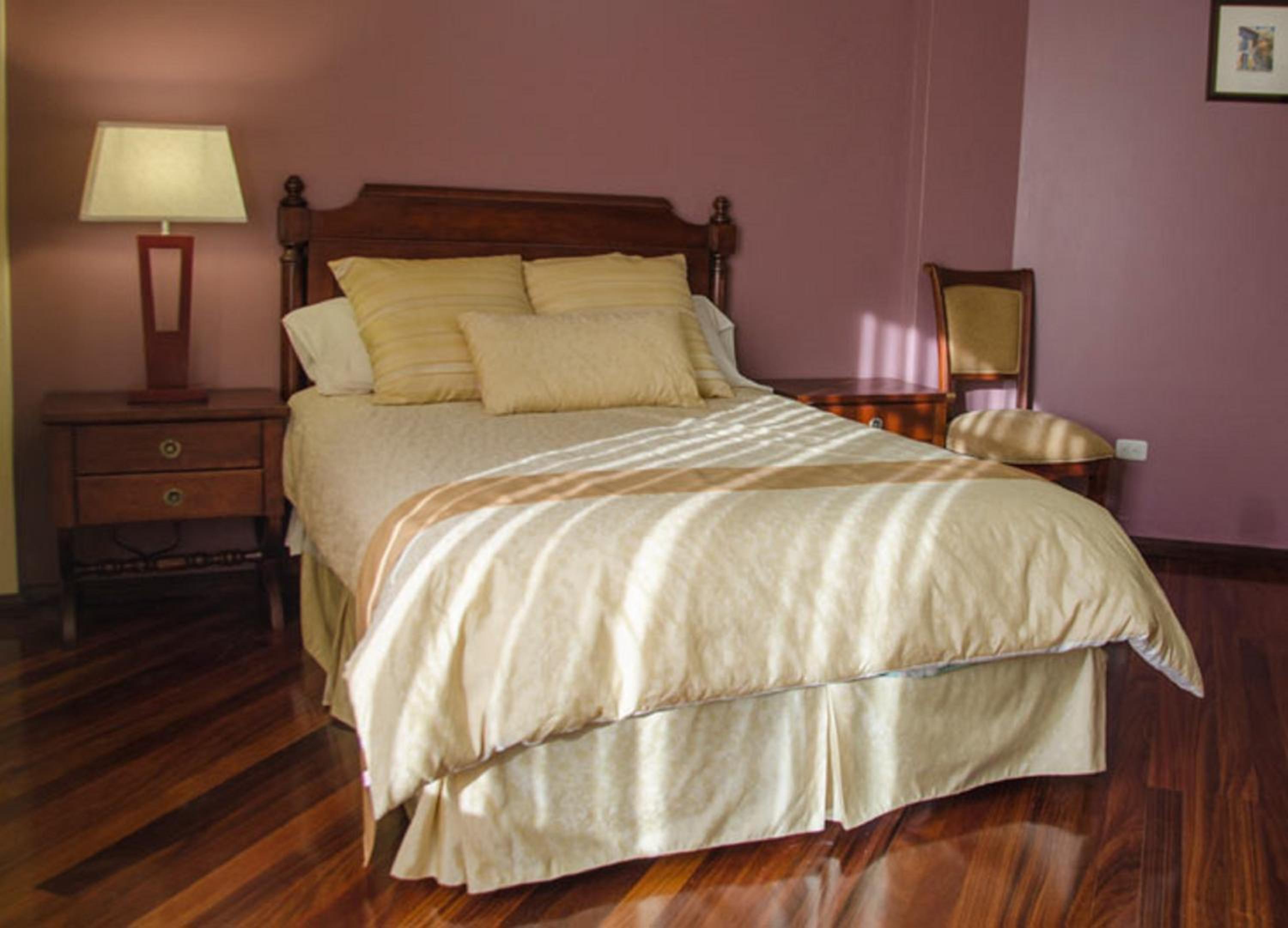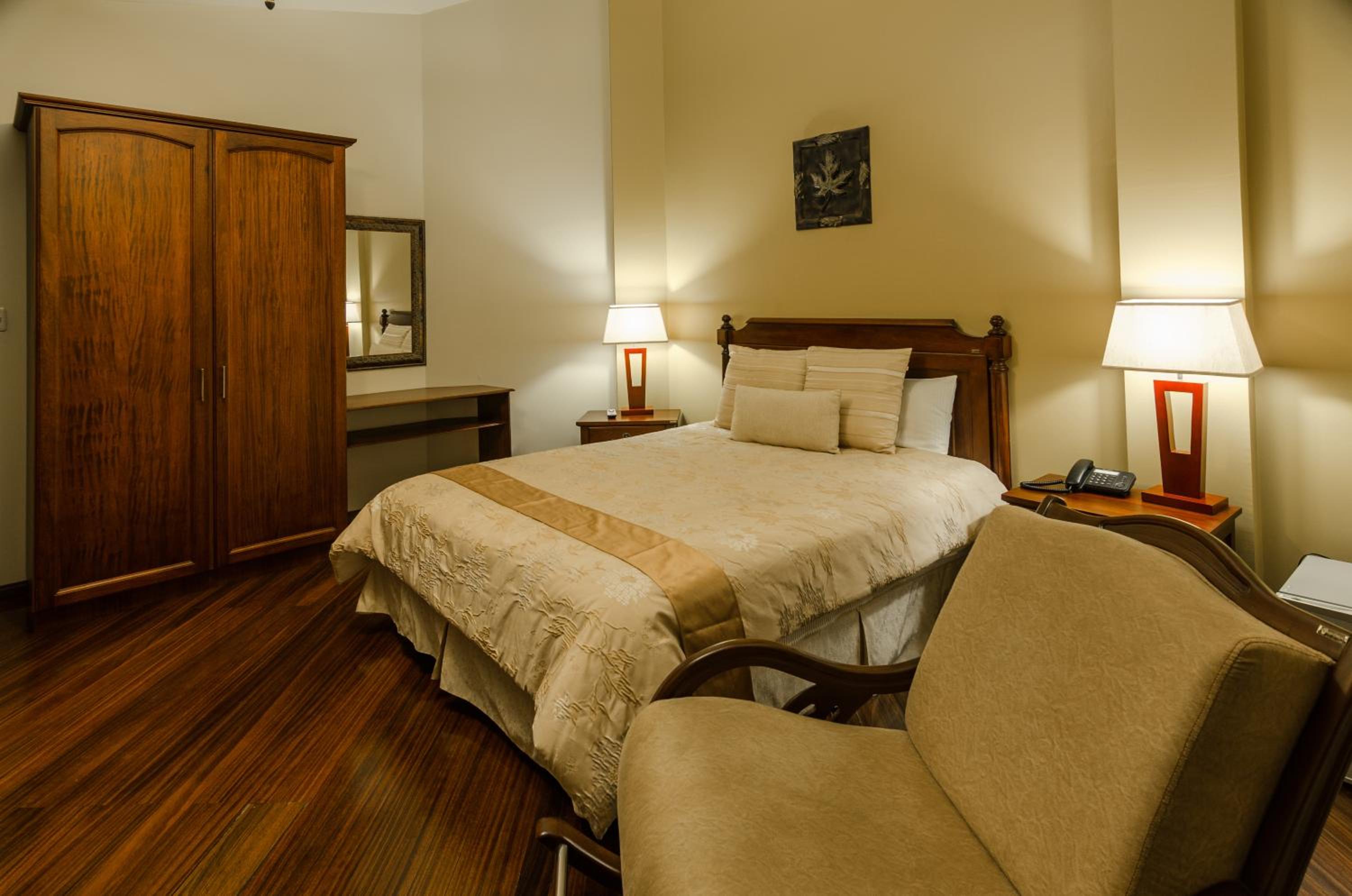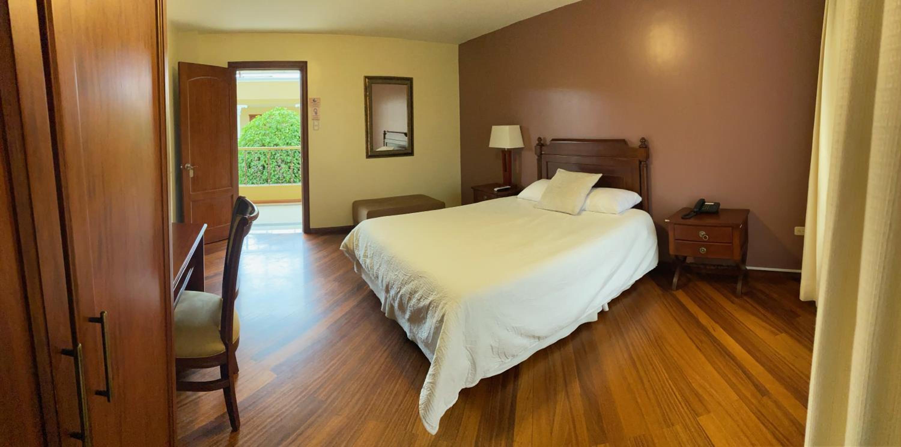 Indulge in the warm ambiance of our spacious rooms adorned with rich colors and wood finishes. Each room features a flat-screen TV and a luxurious private bathroom for your relaxation.