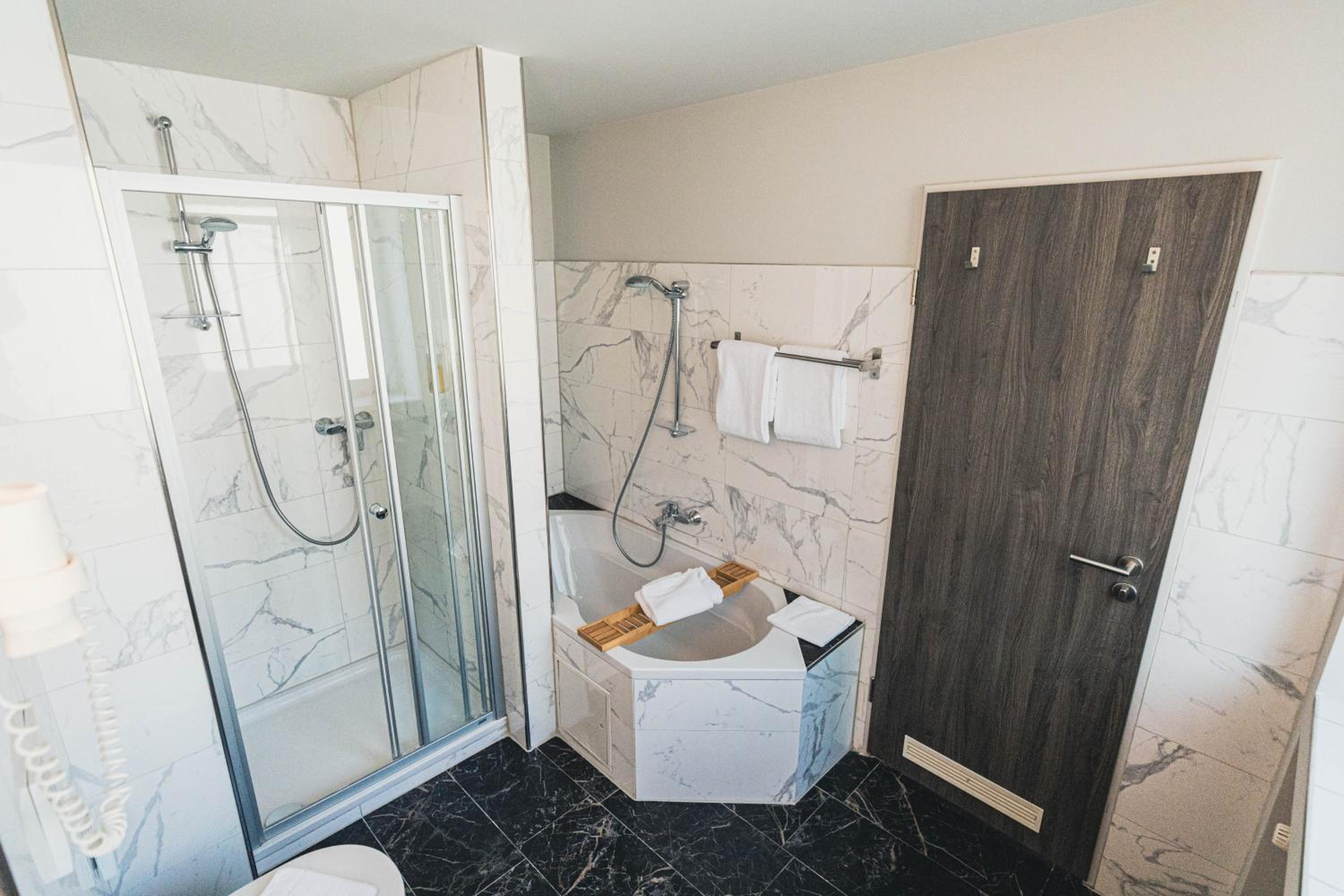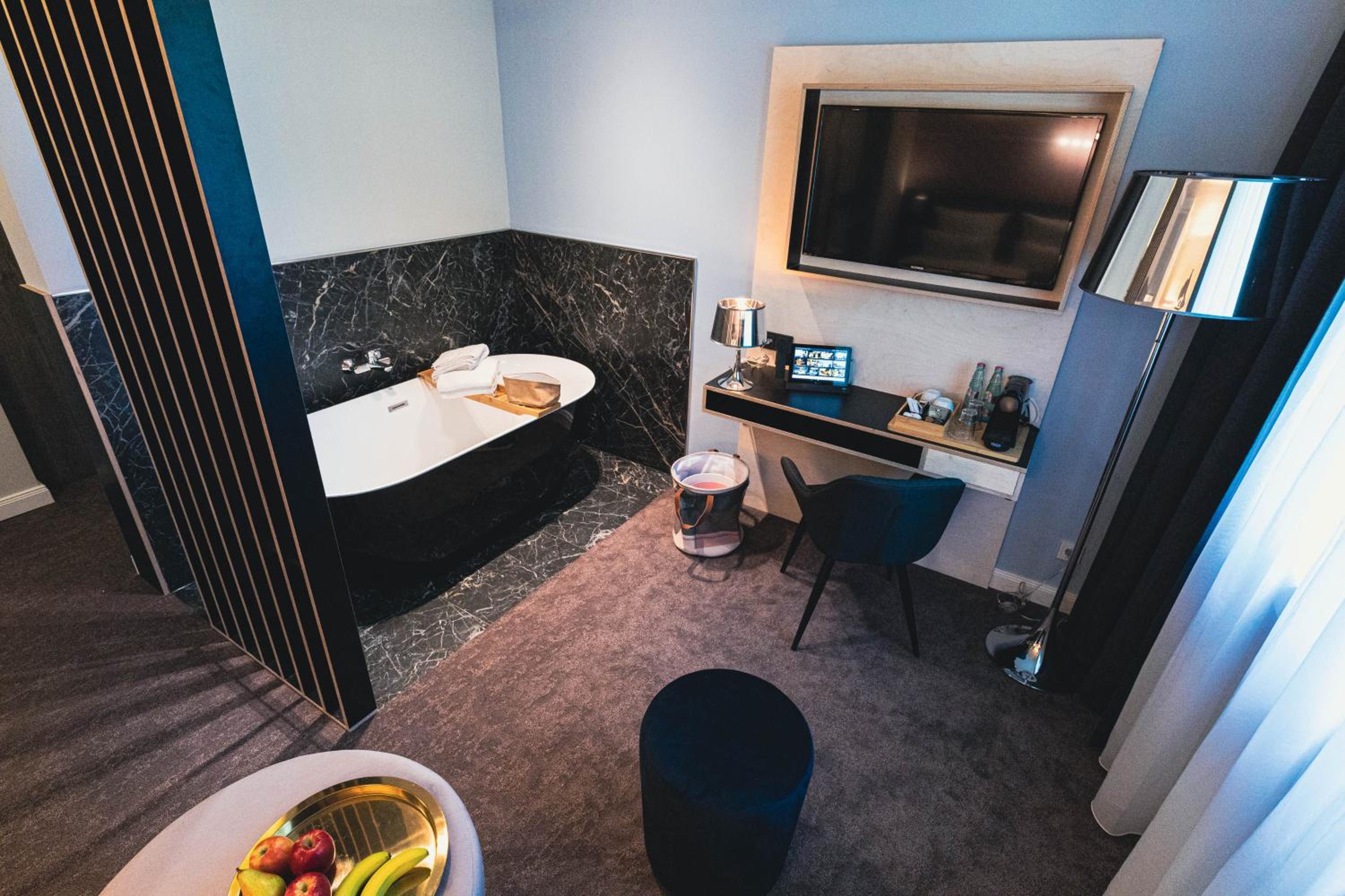 Zimmer hat schlechte Aufteilung, keine Abstellmöglichkeiten für Koffer oder Taschen. Keine Ablagefläche für Kleinteile oder um etwas zu schreiben, wenig Platz um Kleidung aufzuhängen. Badewanne im Zimmer (schön anzuschauen, jedoch unpraktisch), das Zimmer hat einen feuchten Eindruck gemacht (Teppich, Gardinen, Bettwäsche). Um ins Bett zukommen, ein schmaler Gang beidseitig. Ein-Mann-Badezimmer. Steckdosenabdeckung neben Waschplatz defekt. Schwarzschimmel in Nassbereich (Abfluss-und Dehnungsfugen). Beim Toilettengang hängt man mit dem Oberkörper im Schlafzimmer.