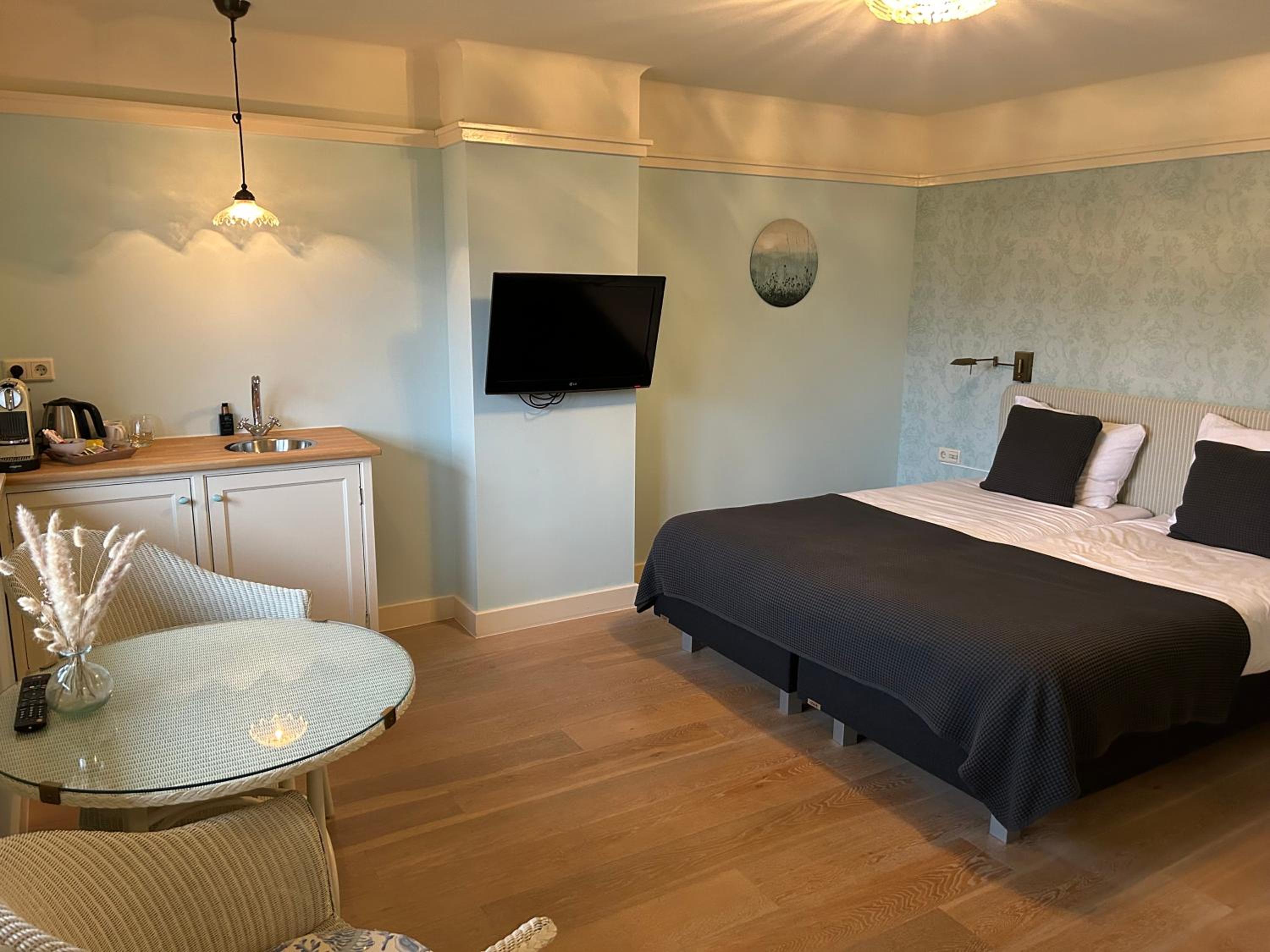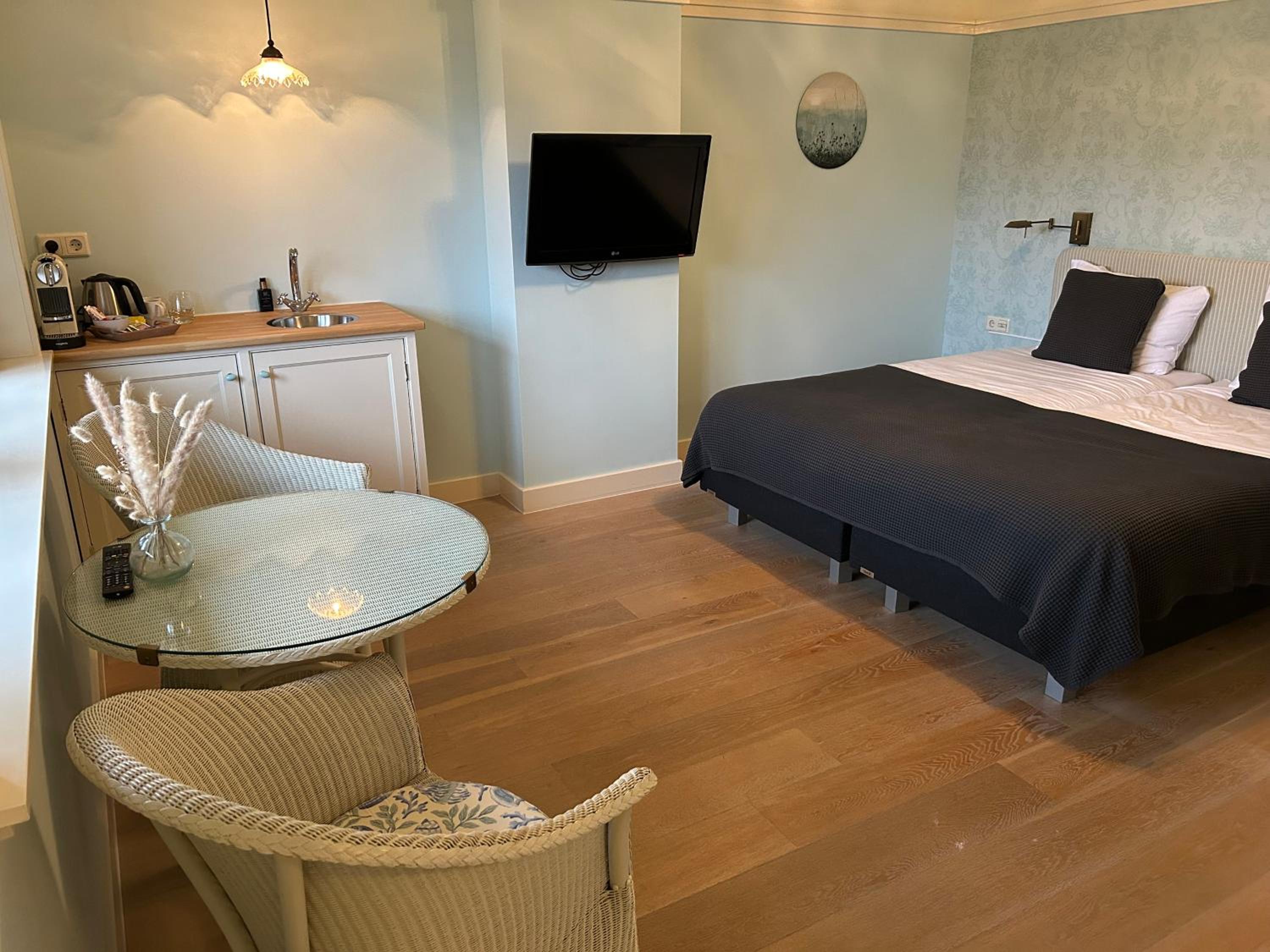 Step into Villa Nieuwland and experience the perfect blend of warm colors, classic lighting, and modern comforts. Each of the 3 spacious rooms features cozy box-spring beds, a relaxing bath tub, and a convenient kitchenette. Enjoy a cup of coffee with the provided tea/coffee maker, and unwind in front of the flat-screen TV.