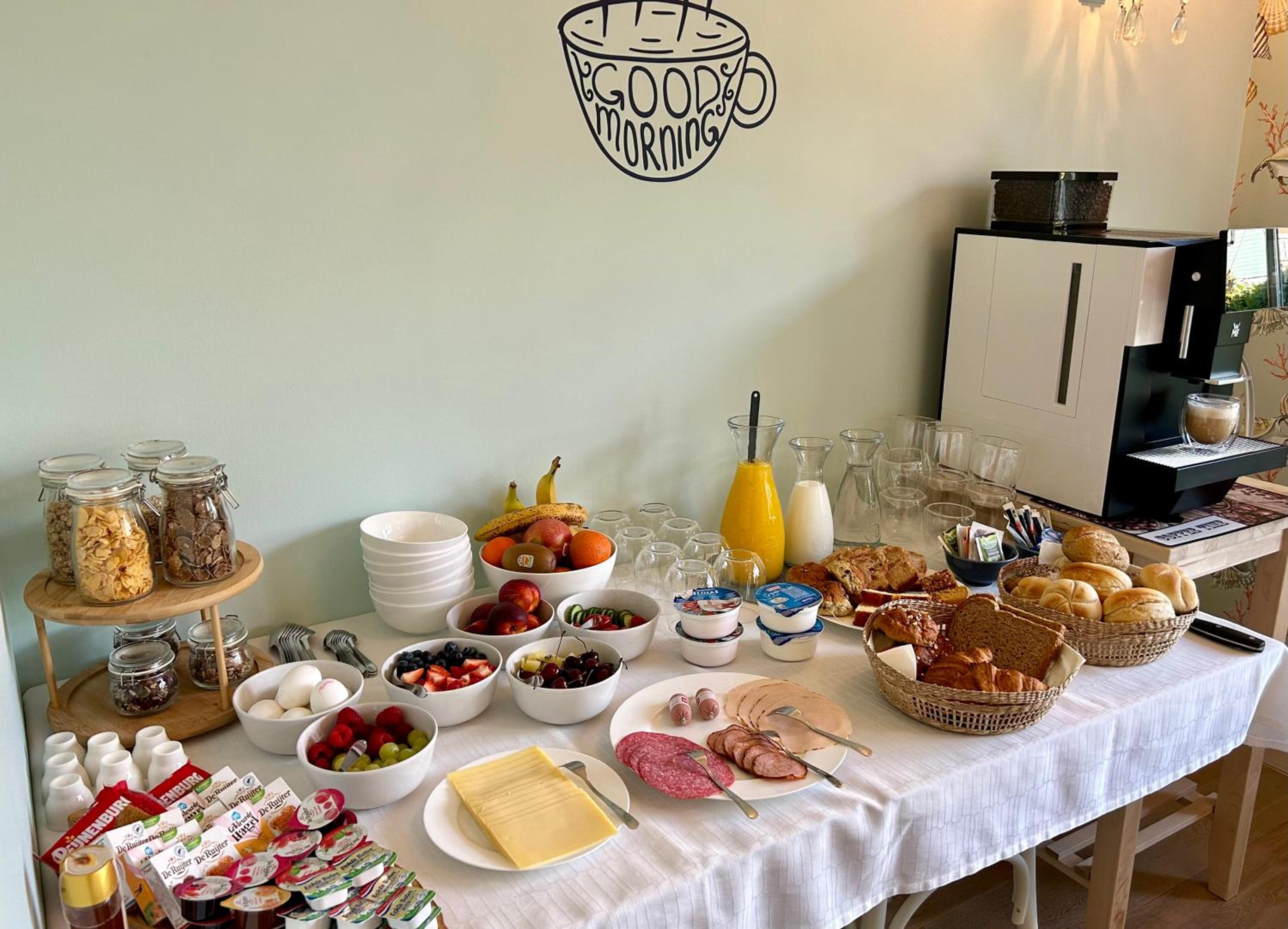 Fantastisch vers ontbijt met ruime keuze, vergezeld met een héérlijk tasje lekkere koffie of thee...