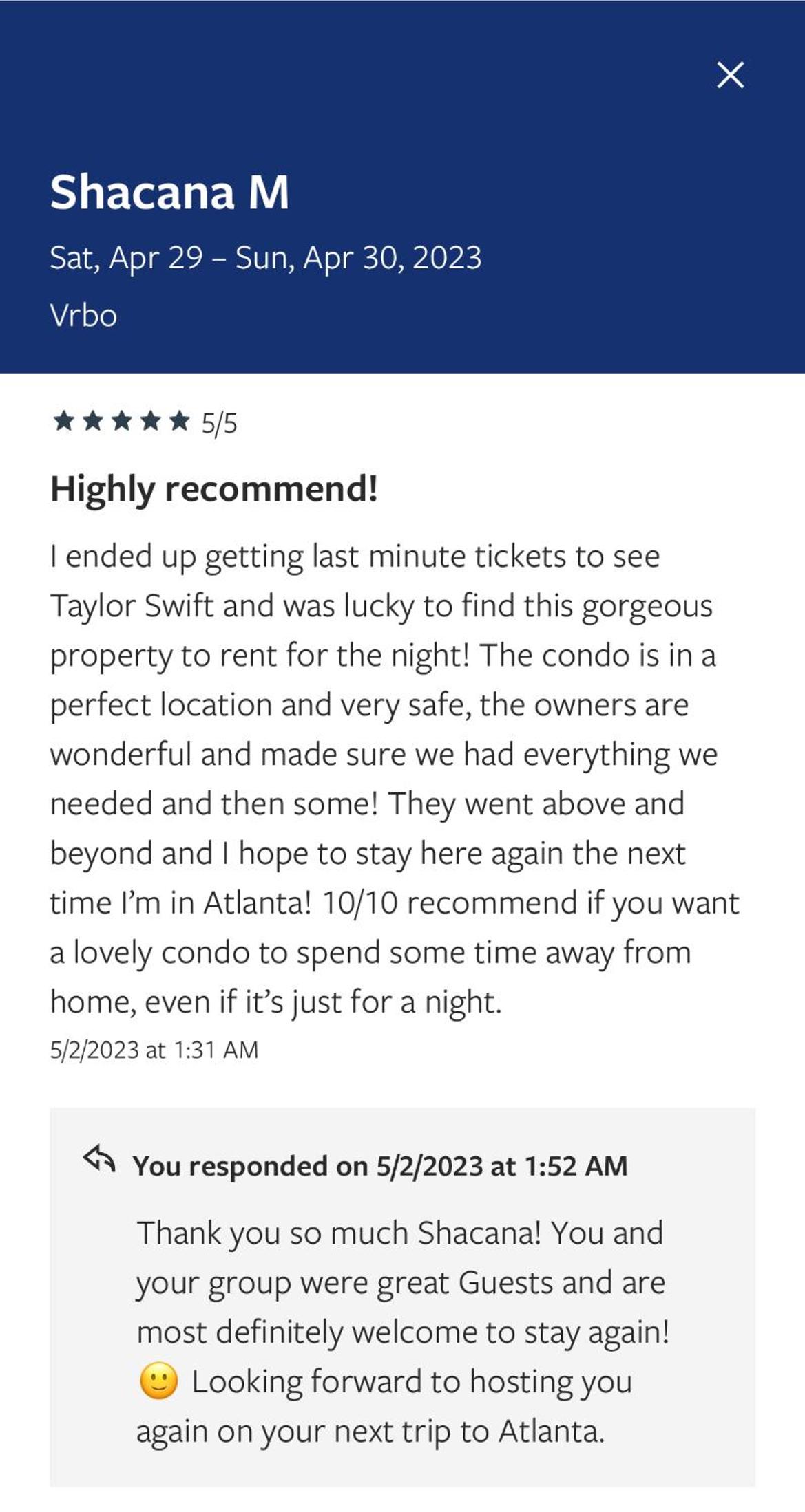 Owners were quick to respond to minor issues and facilitated corrections as soon as possibly allowed.