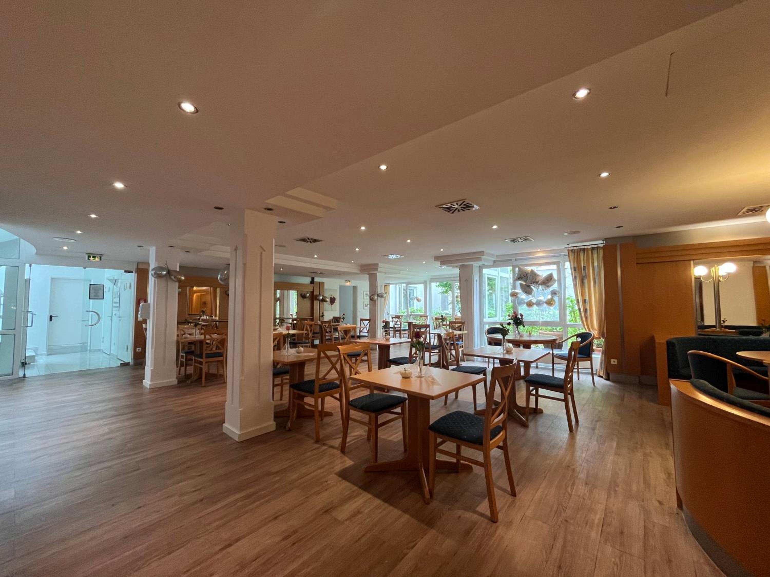 Impressive Entrance and Patio: Hotel Am Schlosspark in Wiesbaden welcomes you with a grand entrance boasting marble floors and stainless steel accents. The large patio offers a serene spot to unwind, complementing the hotel's modern design.